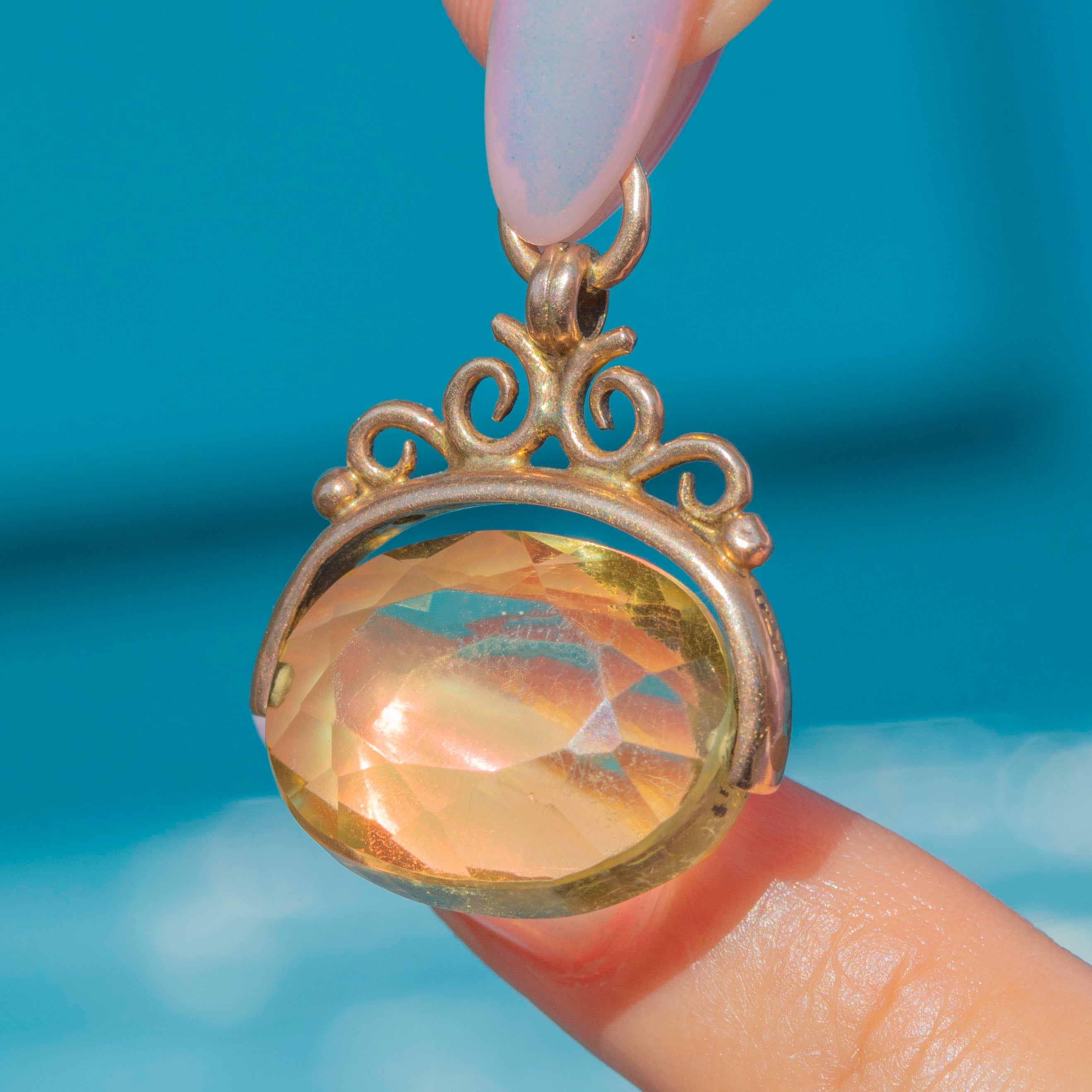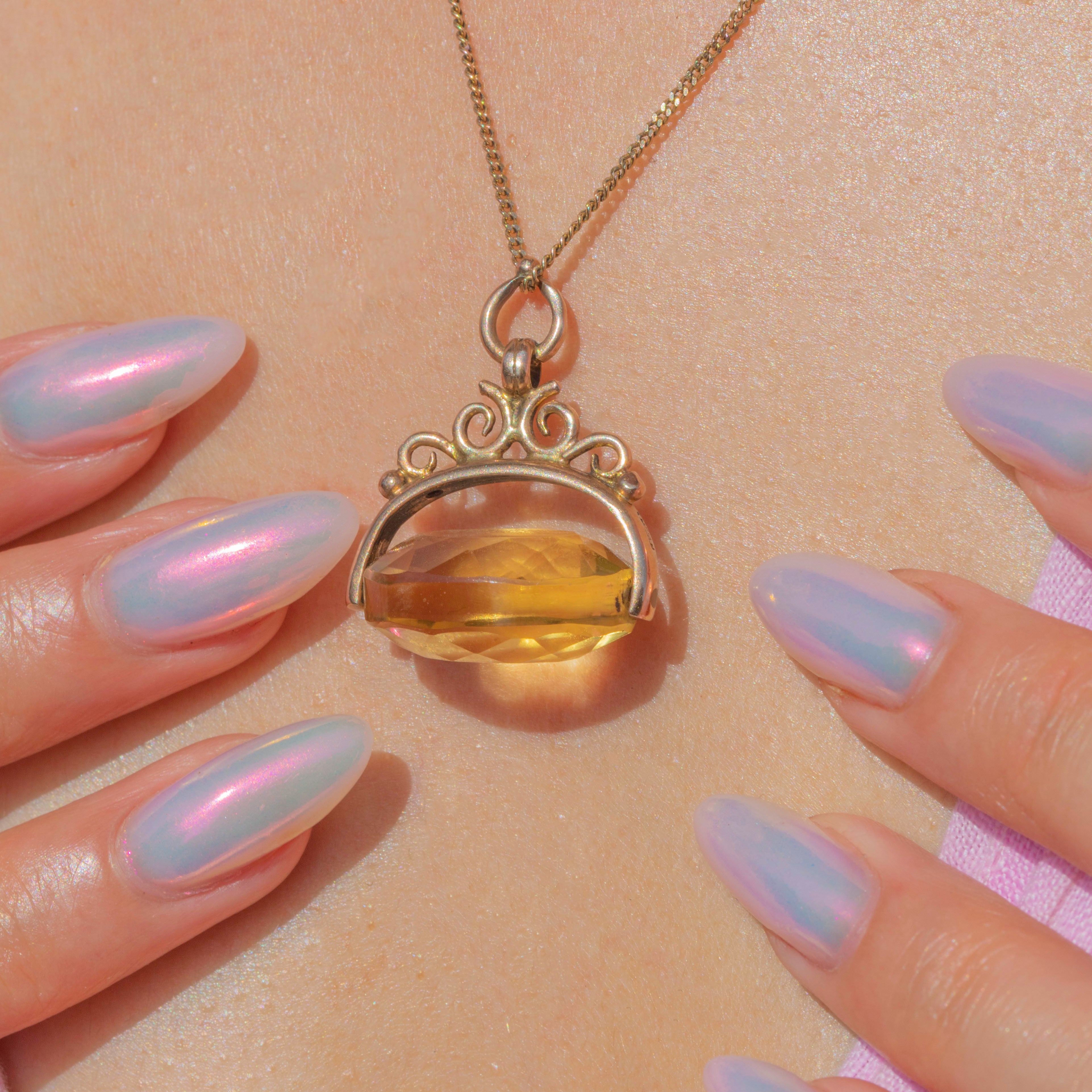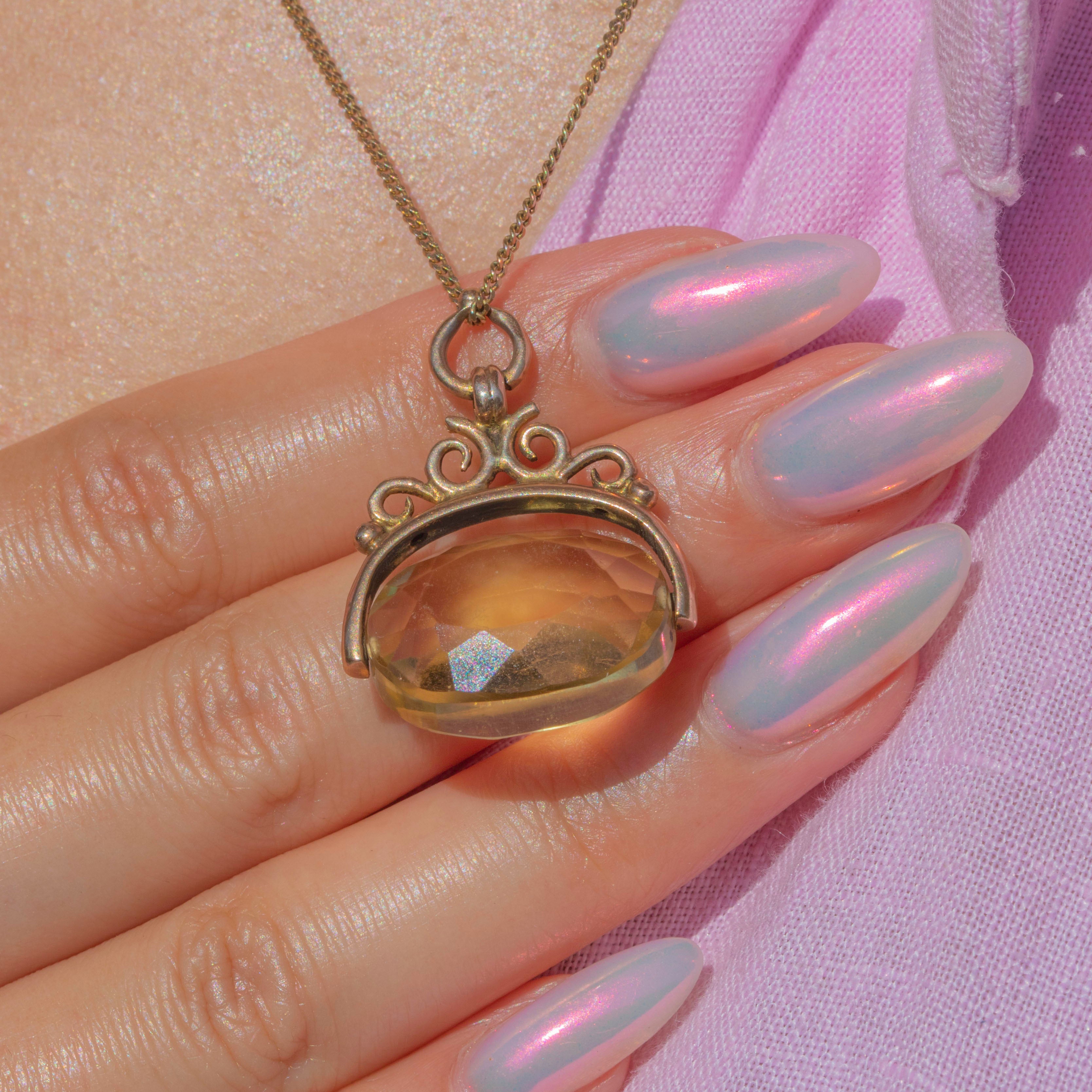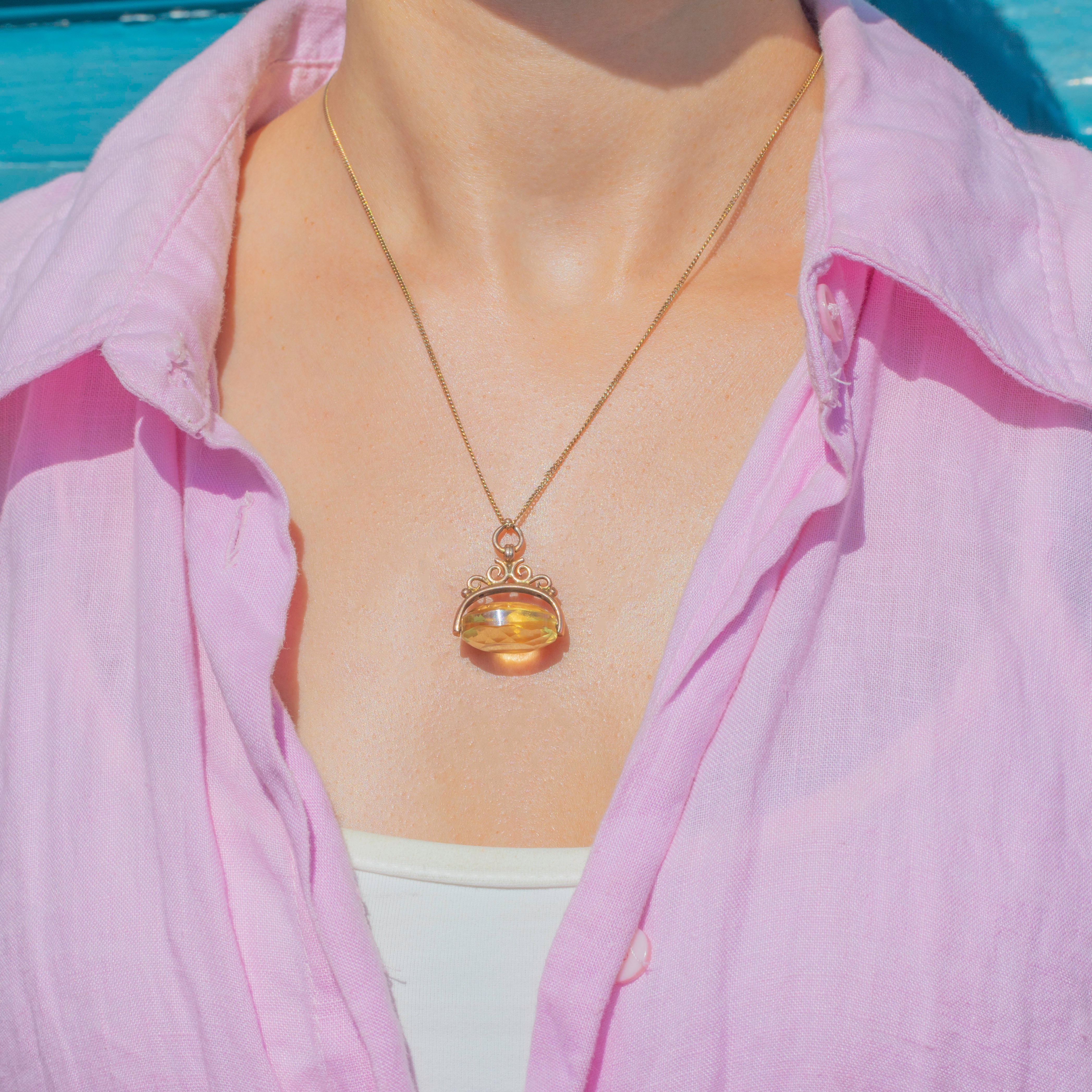 The sweetest 9.80ct Victorian Citrine spinner fob pendant, boasting a deliciously zesty Citrine! The light passes through each of her perfectly cut geometric facets as the Citrine spins effortlessly.