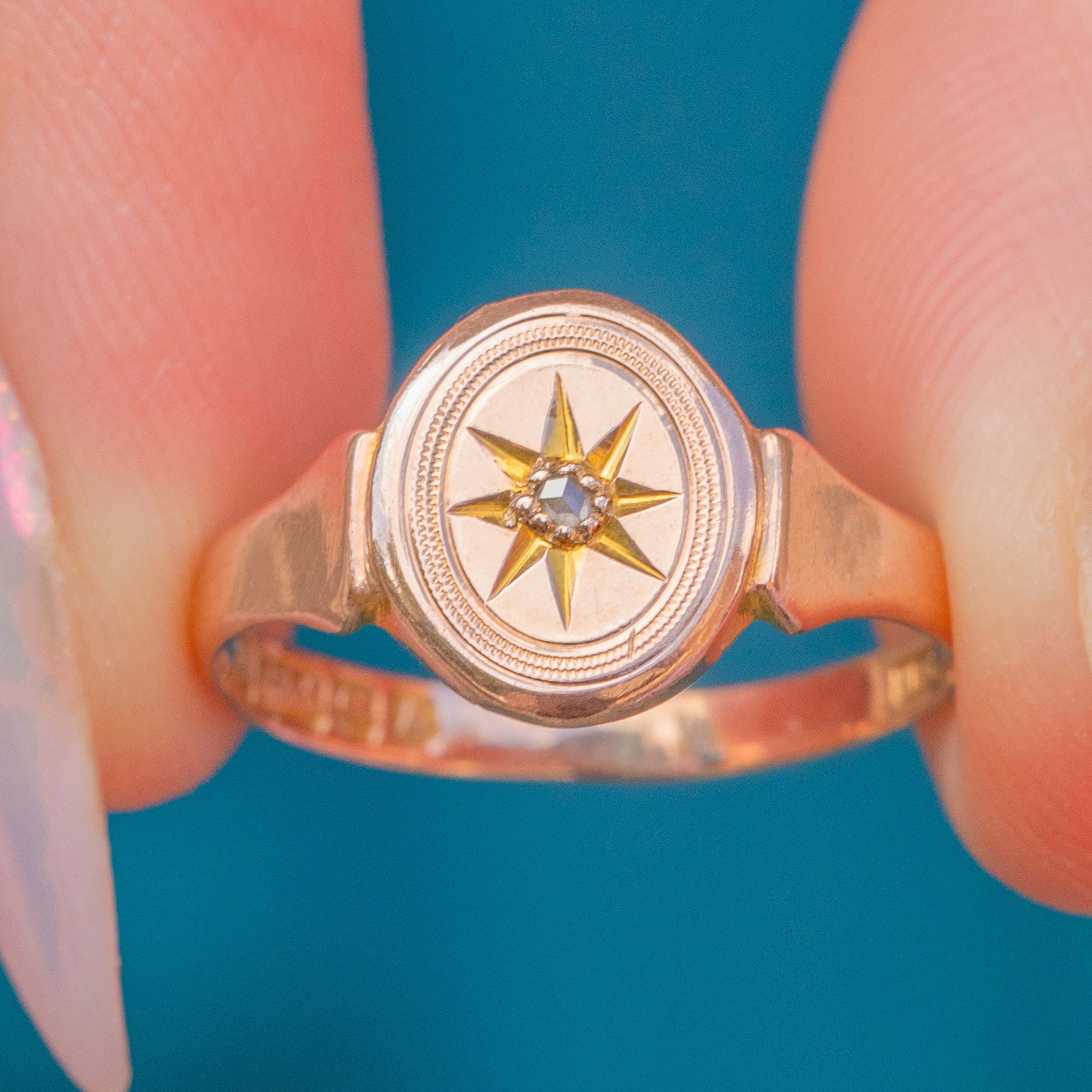 Hallmarked to 1925, this Art Deco signet ring is centred by a subtly shimmering Diamond displayed in a bold star setting.
