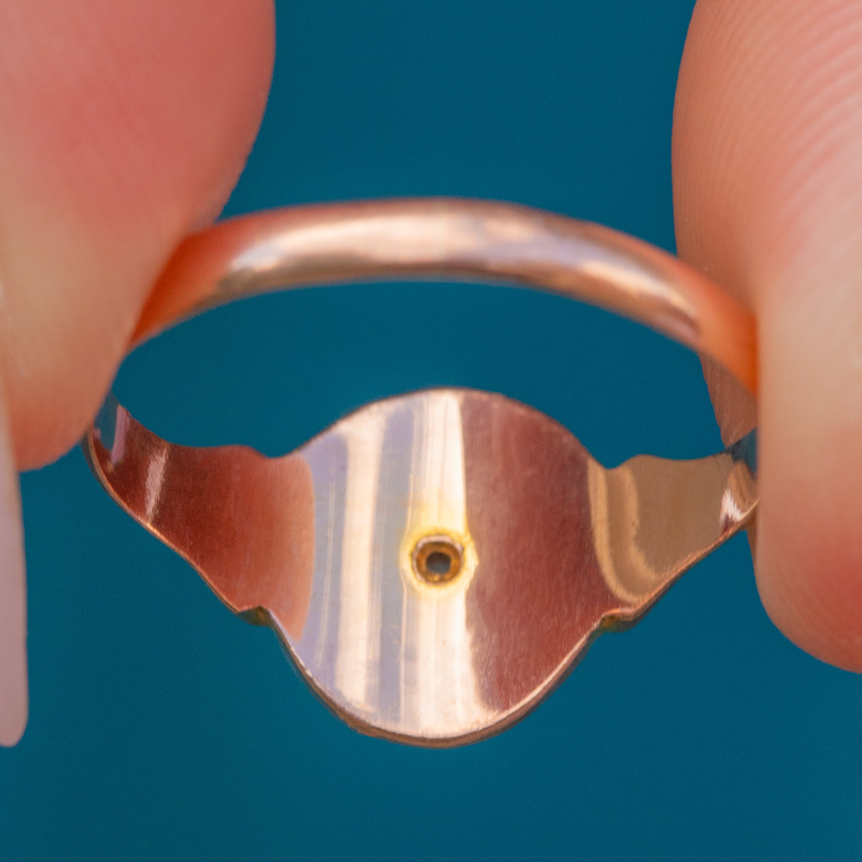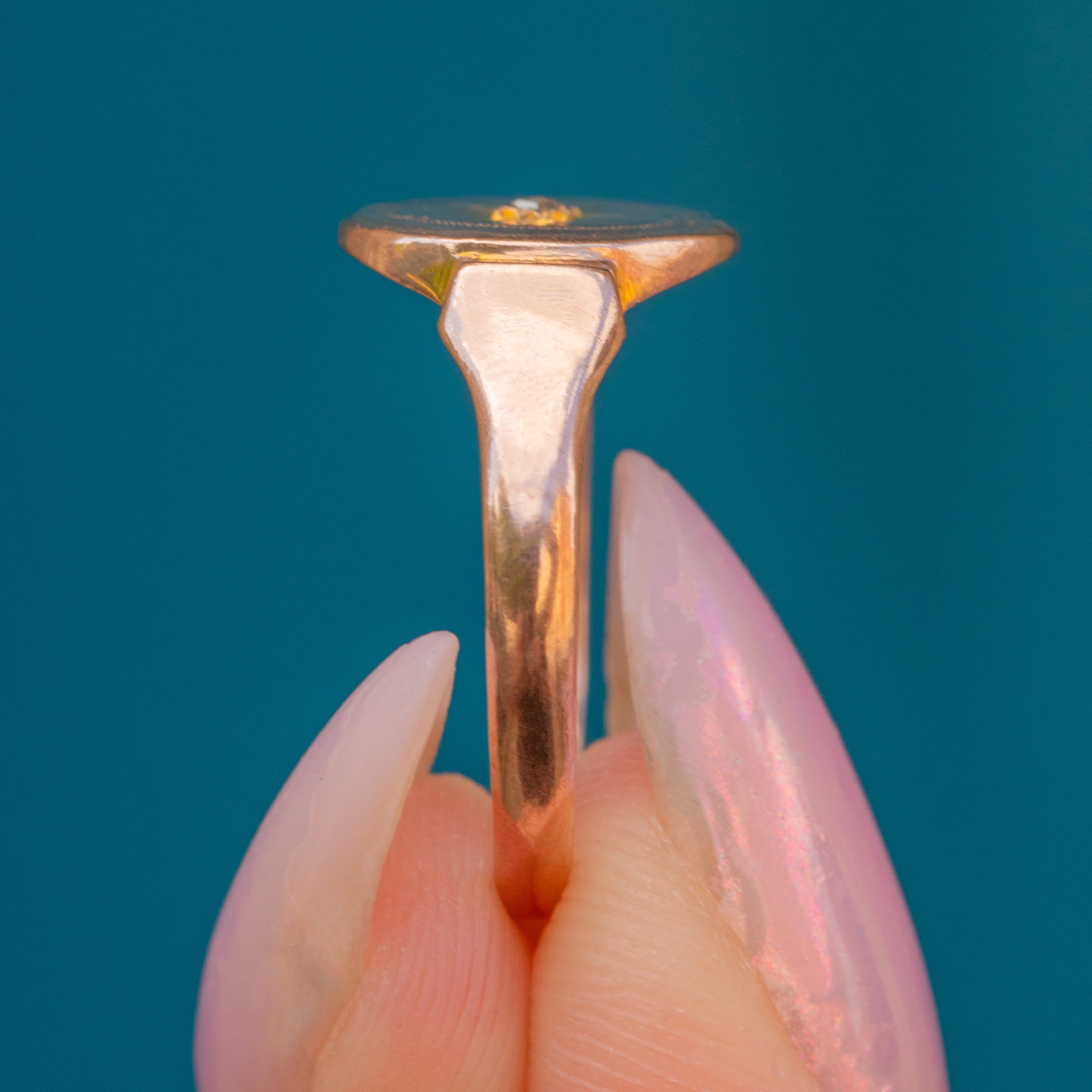 The smooth 9ct Gold ring has a gorgeous rosy hue, with a large oval signet face providing wonderful coverage. Endlessly versatile and pleasing to look at, this antique Diamond signet is the perfect everyday piece!