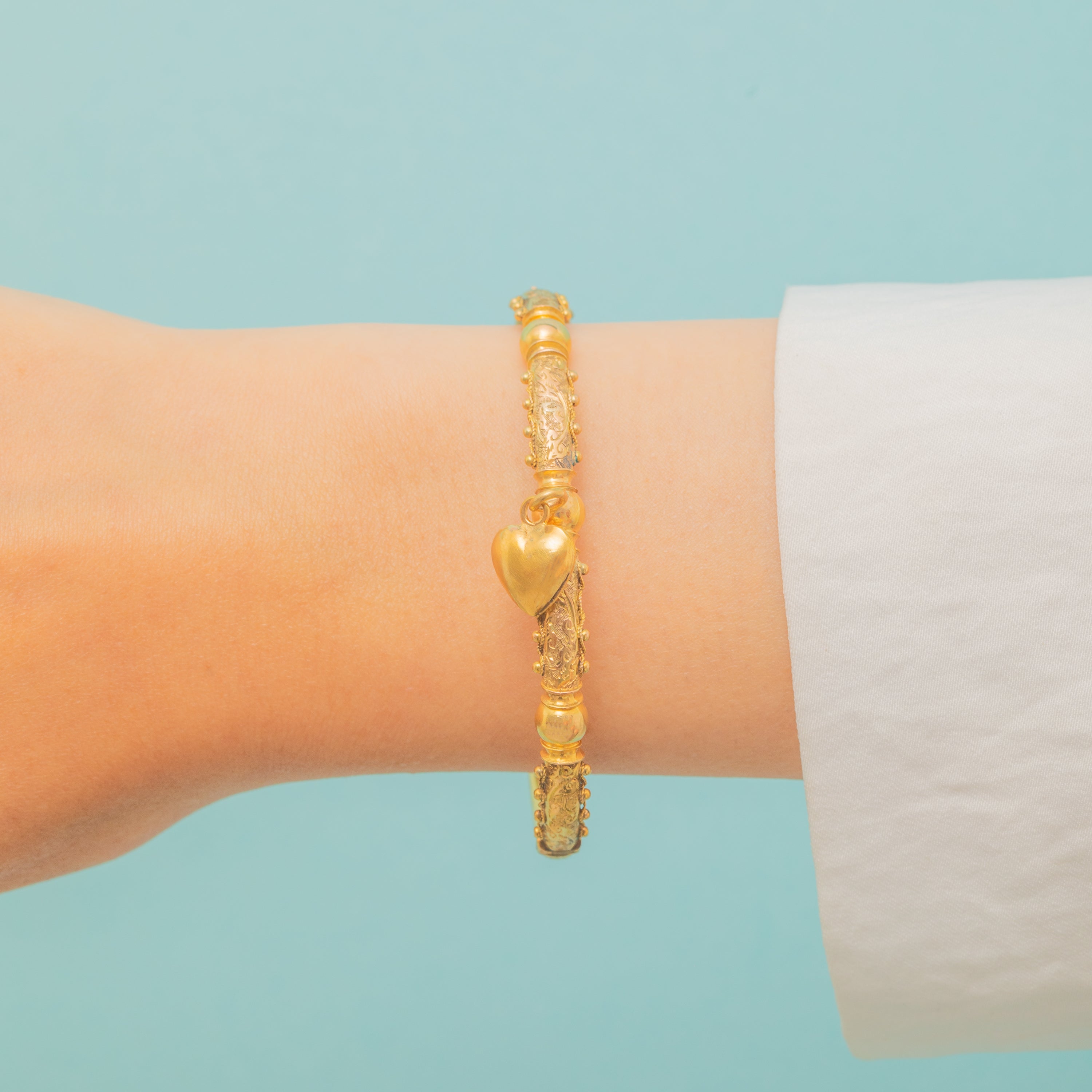 Suspending an adorable puffy heart charm, this Gold Victorian bangle is a charming piece steeped in romantic sentiment and is sure to bring ample character to your collection!