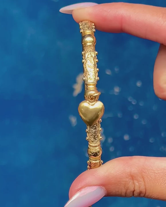Antique 9ct Gold Engraved Bangle with Puffy Heart Charm
