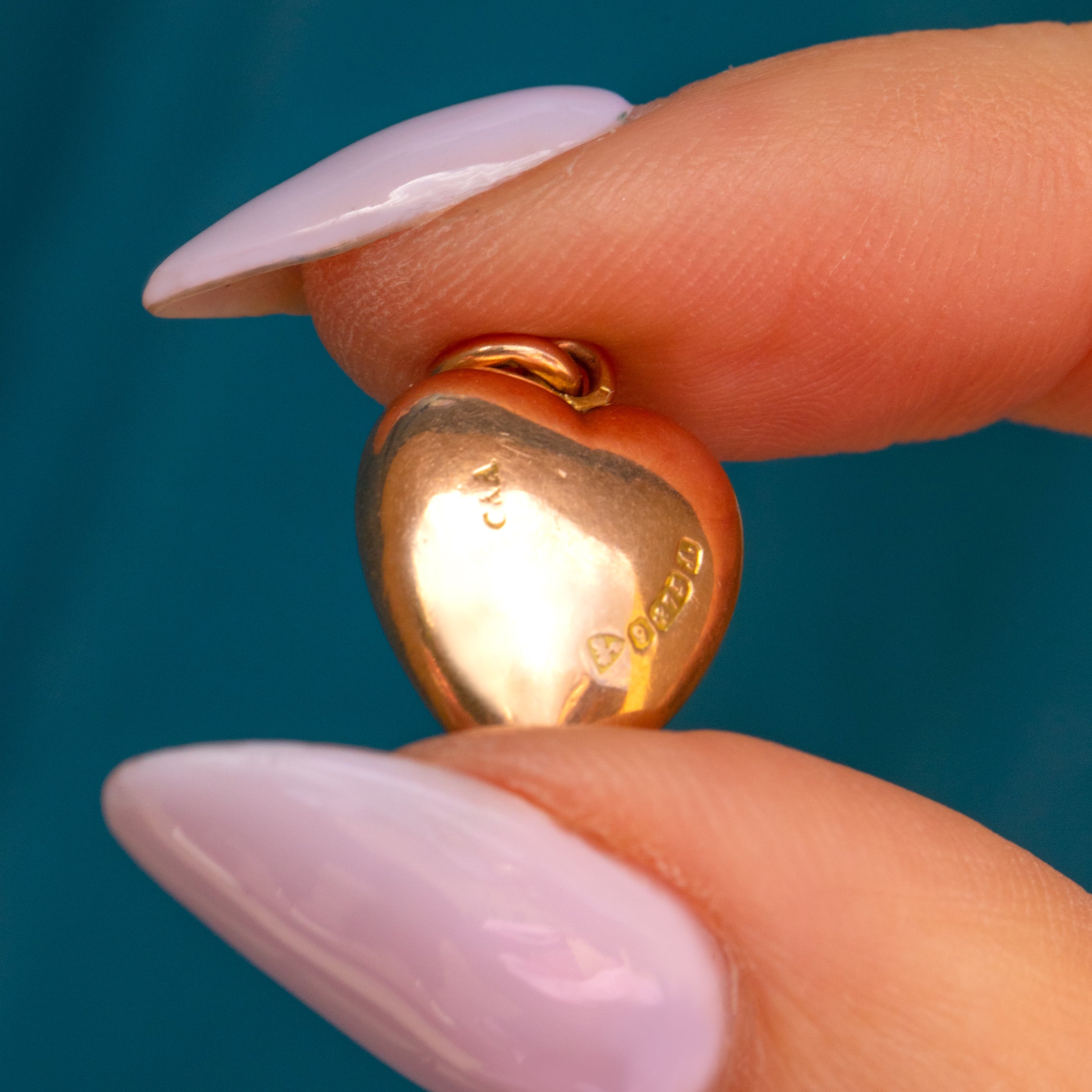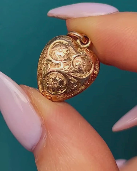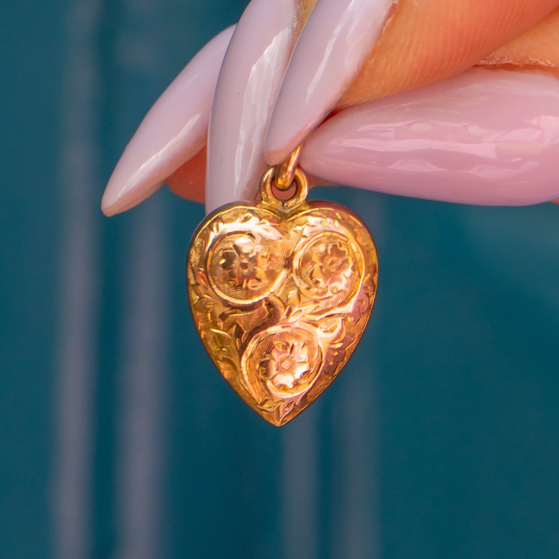 VERY GOOD. This antique engraved 9ct Gold heart charm is in very good condition. The heart is crafted from buttery 9ct Gold that radiates warmth from her puffy form. The engraved details are crisp and still look gorgeous 120 years later. Edwardian are praised for their sentiment and symbolism within jewellery, and this heart charm is certainly no exception!