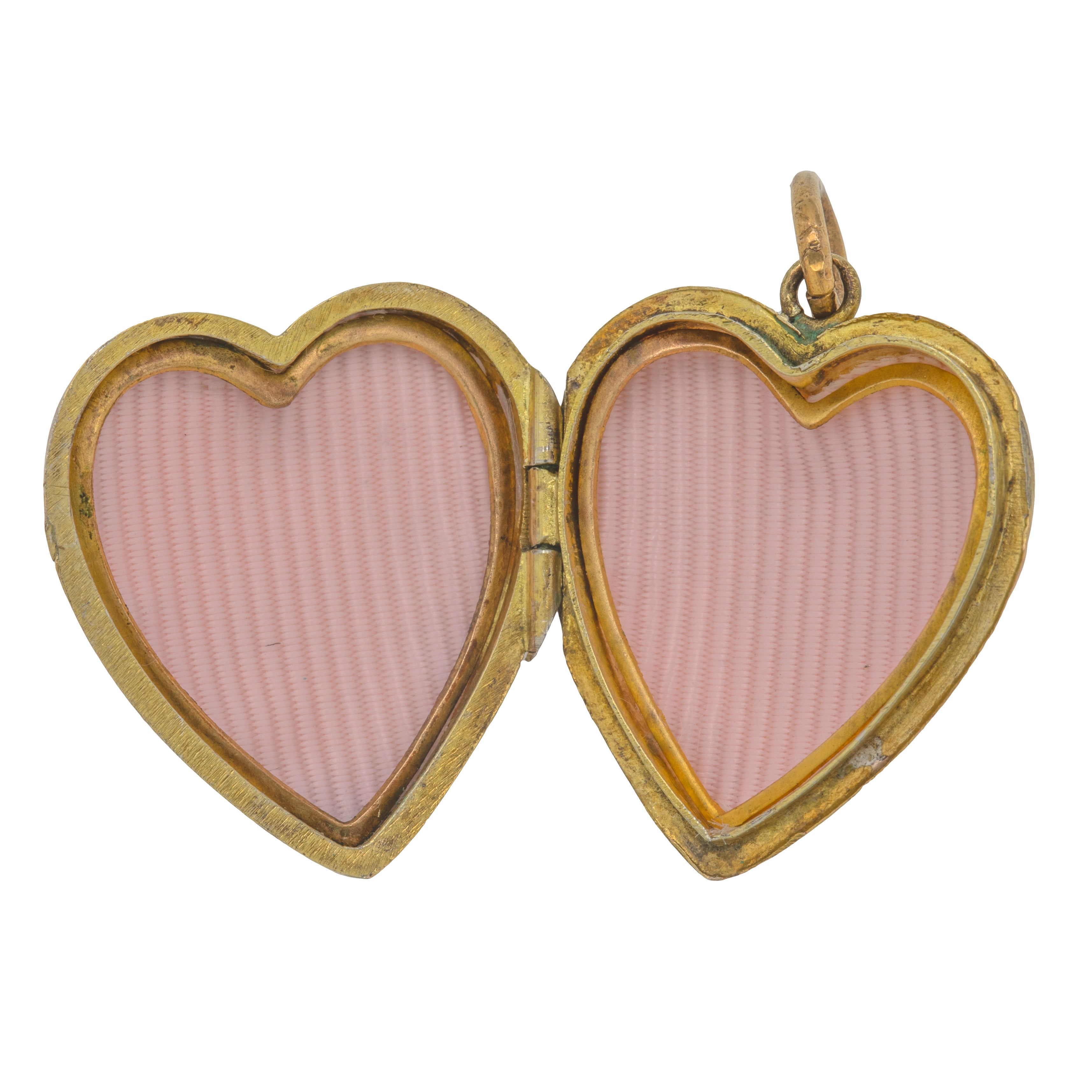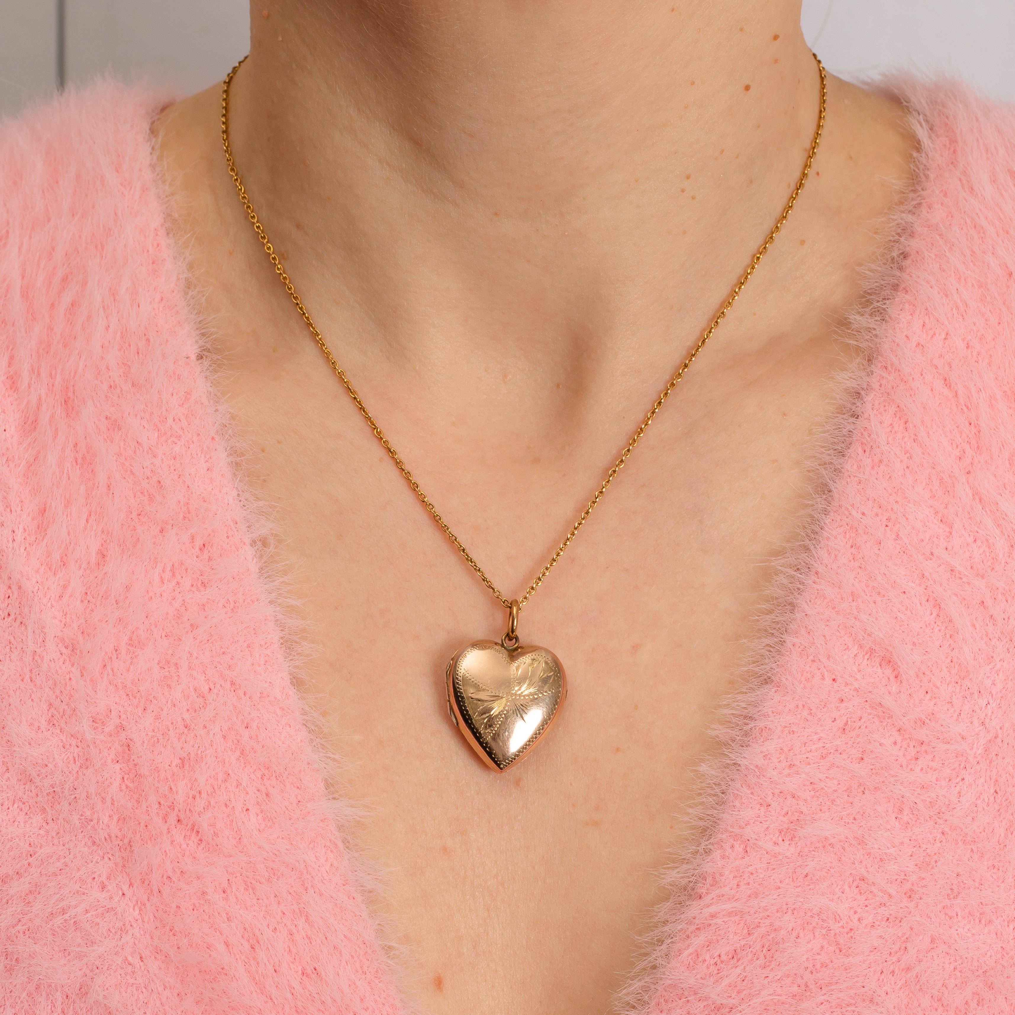 EXCELLENT. This antique 9ct Gold engraved heart locket is in wonderful condition. The Gold is buttery with a delicious rosy hue throughout. The engravings are crisp and the curvaceous form has remained free from any dents or dings. With two frames inside, simply pop your favourite photos inside to add a personal touch!