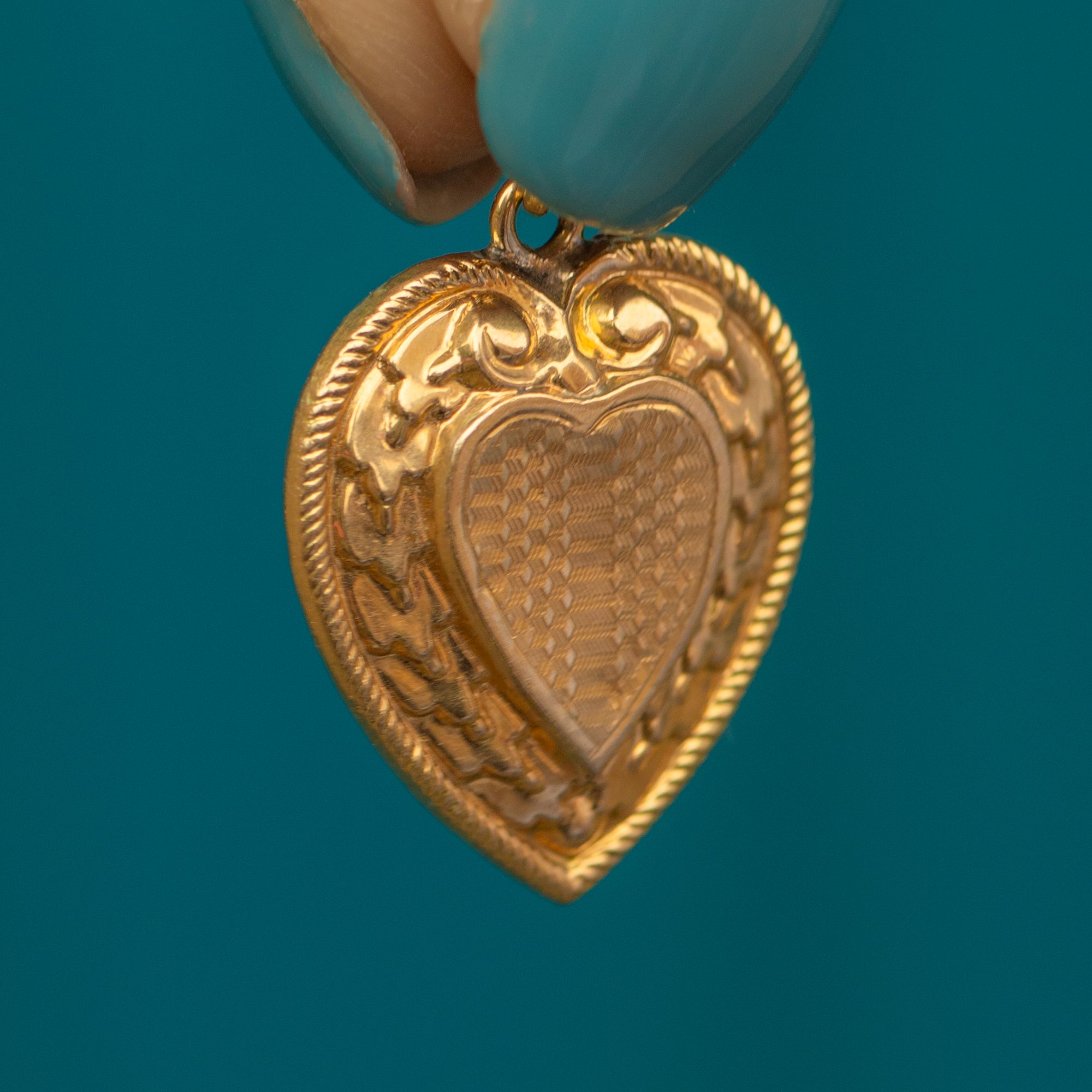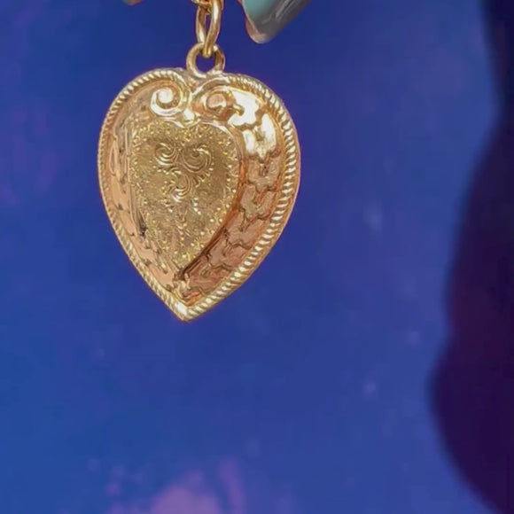 Nothing says romanic quite like this antique 9ct Gold engraved heart locket! Her puffy heart form is inlaid with engravings and repoussé details, with a small heart locket door at her centre she is the epitome of adorable.