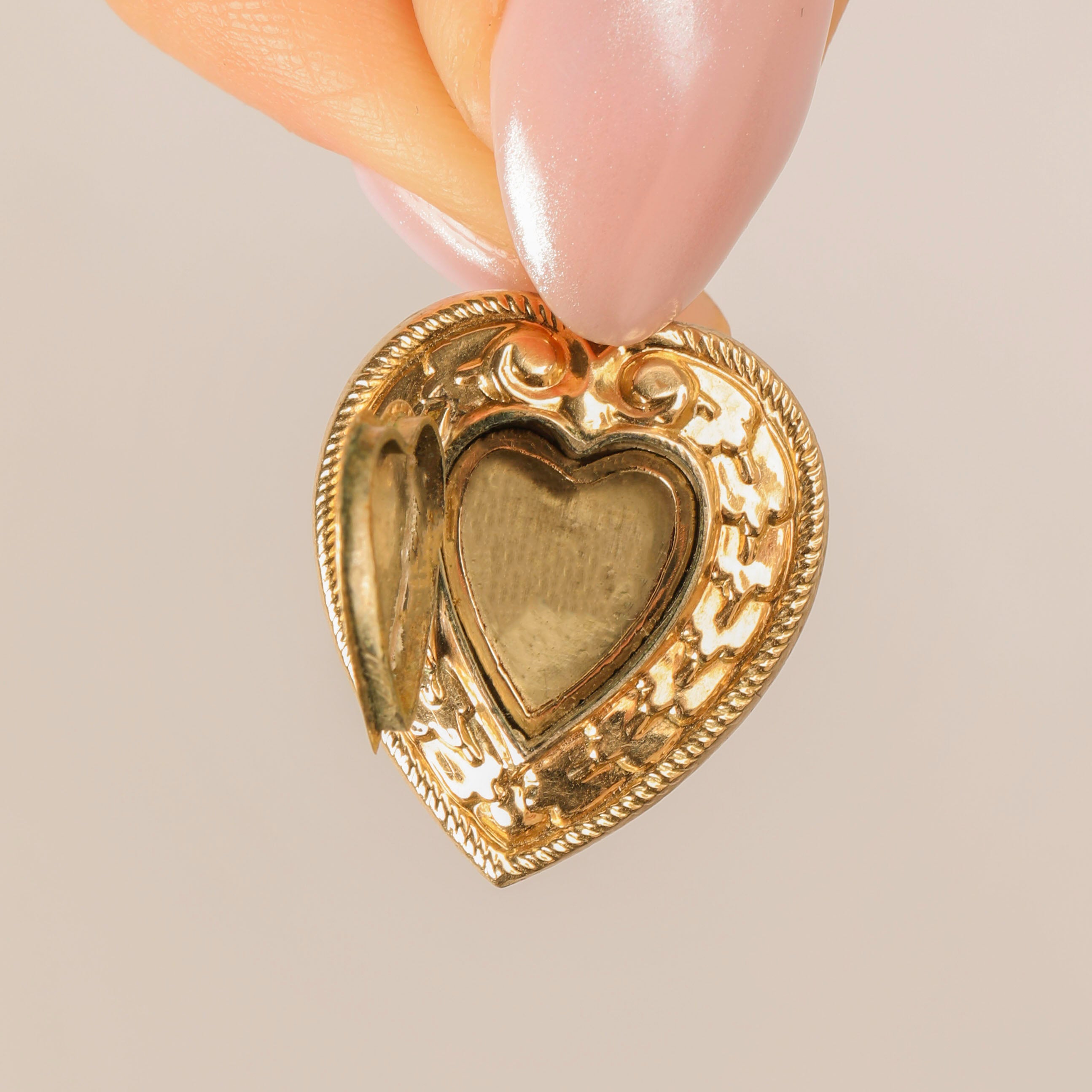 VERY GOOD. This antique 9ct Gold engraved heart locket is in very good condition. The engravings and repoussé details are crisp and although she has incurred a few dings to the front, this does not detract from her overall beauty. Once her locket door is open, she homes a frame inside to keep a cherished photograph safe. Complete with a 9ct Gold chain in perfect condition, this Victorian Gold locket is ready to wear straight from your pink Lillicoco box!