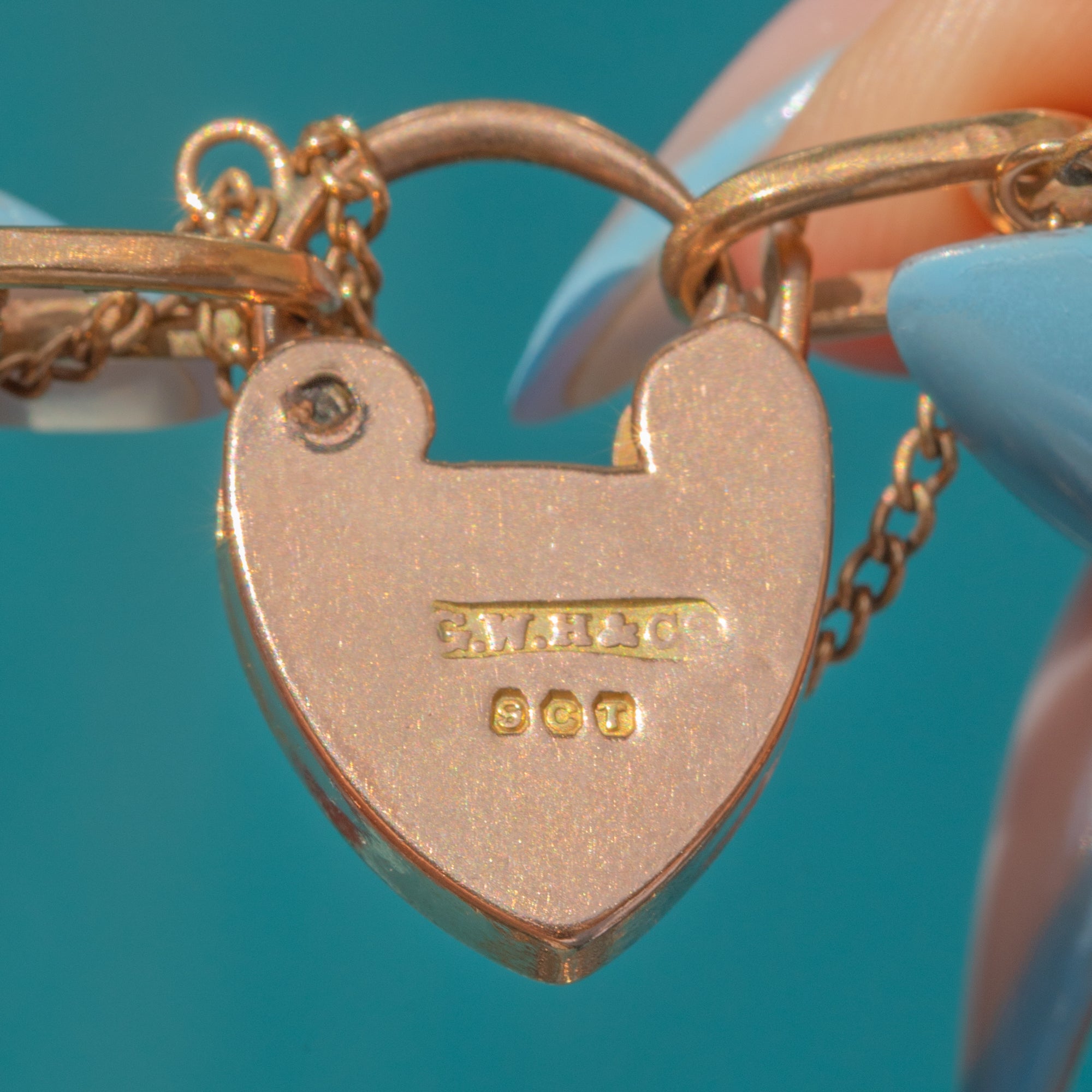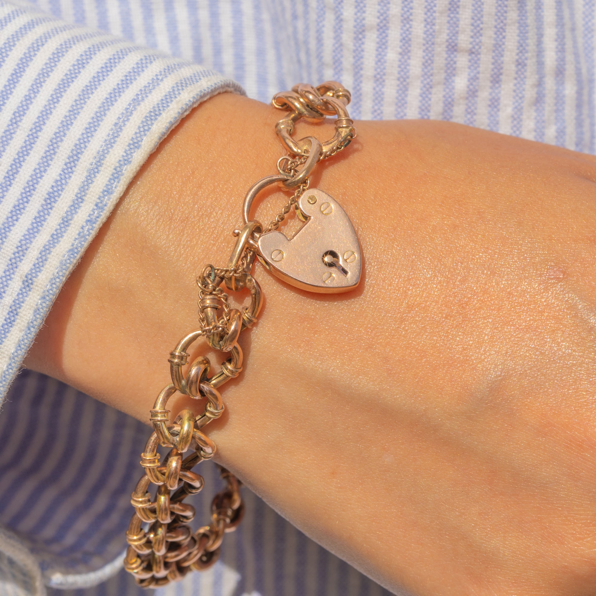 The bracelet closes with a solid Gold heart padlock, symbolic of love and an unbreakable bond, making this antique Gold bracelet the perfect token of love! Suited to daily wear, this fancy curb chain bracelet will add an ample splash of Gold to your attire.