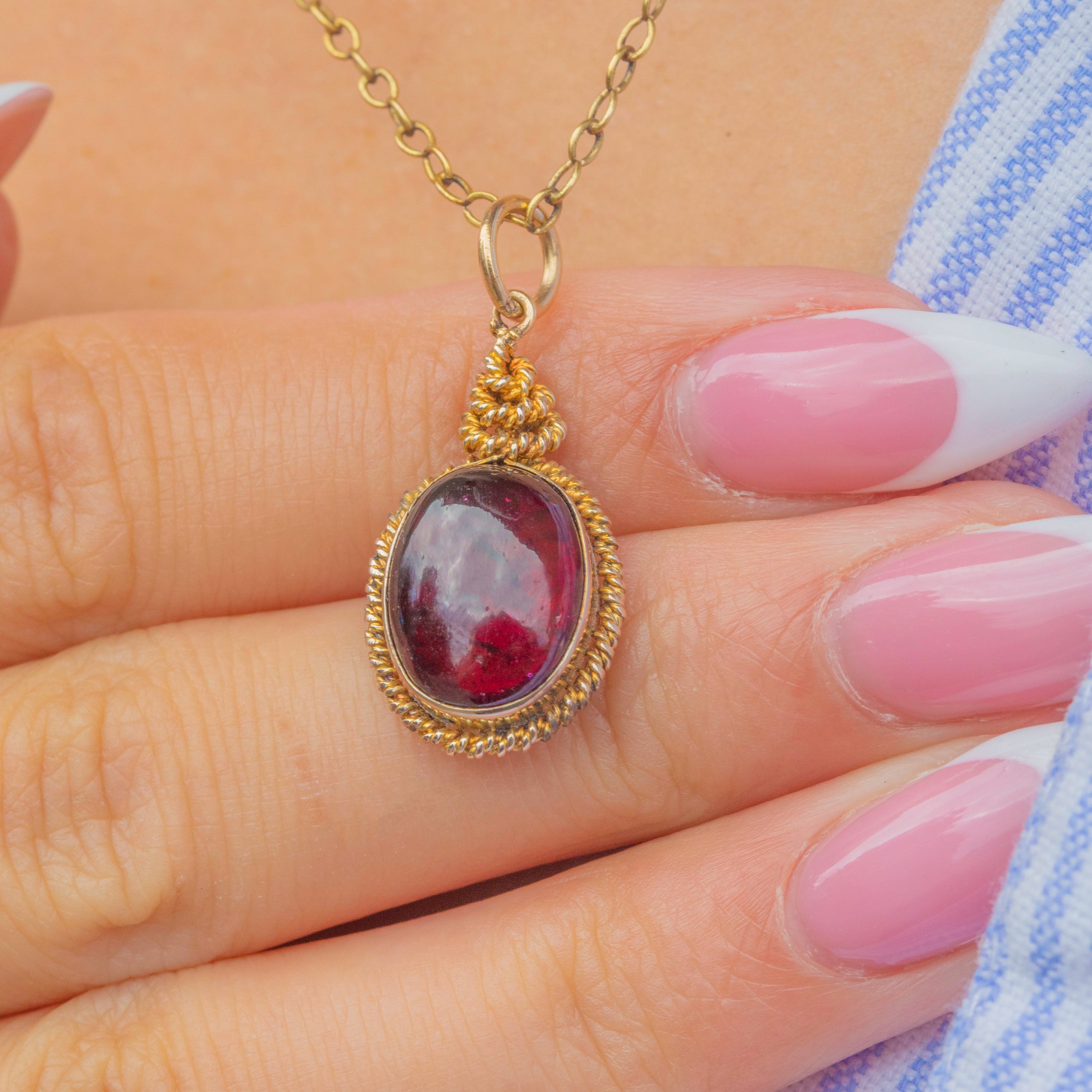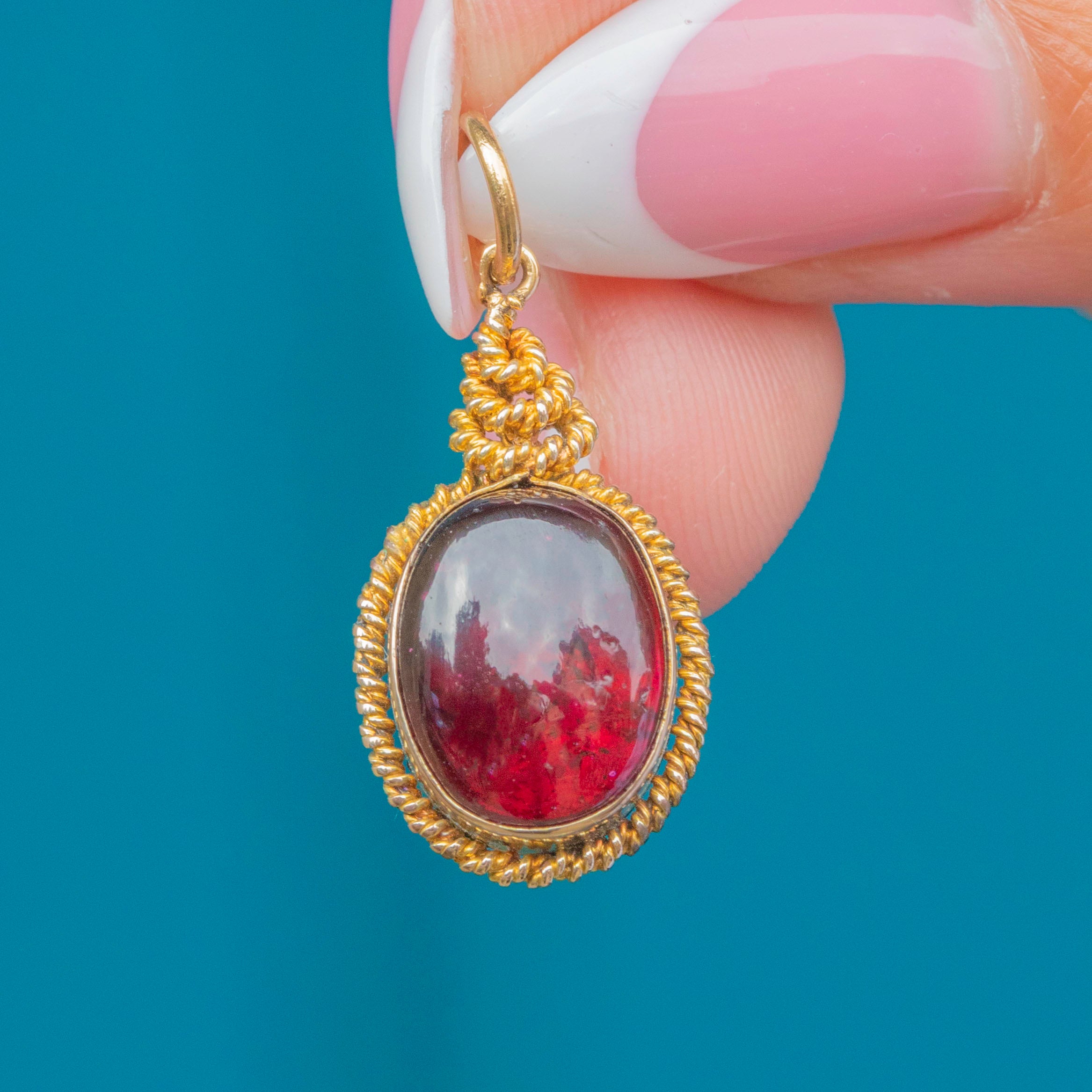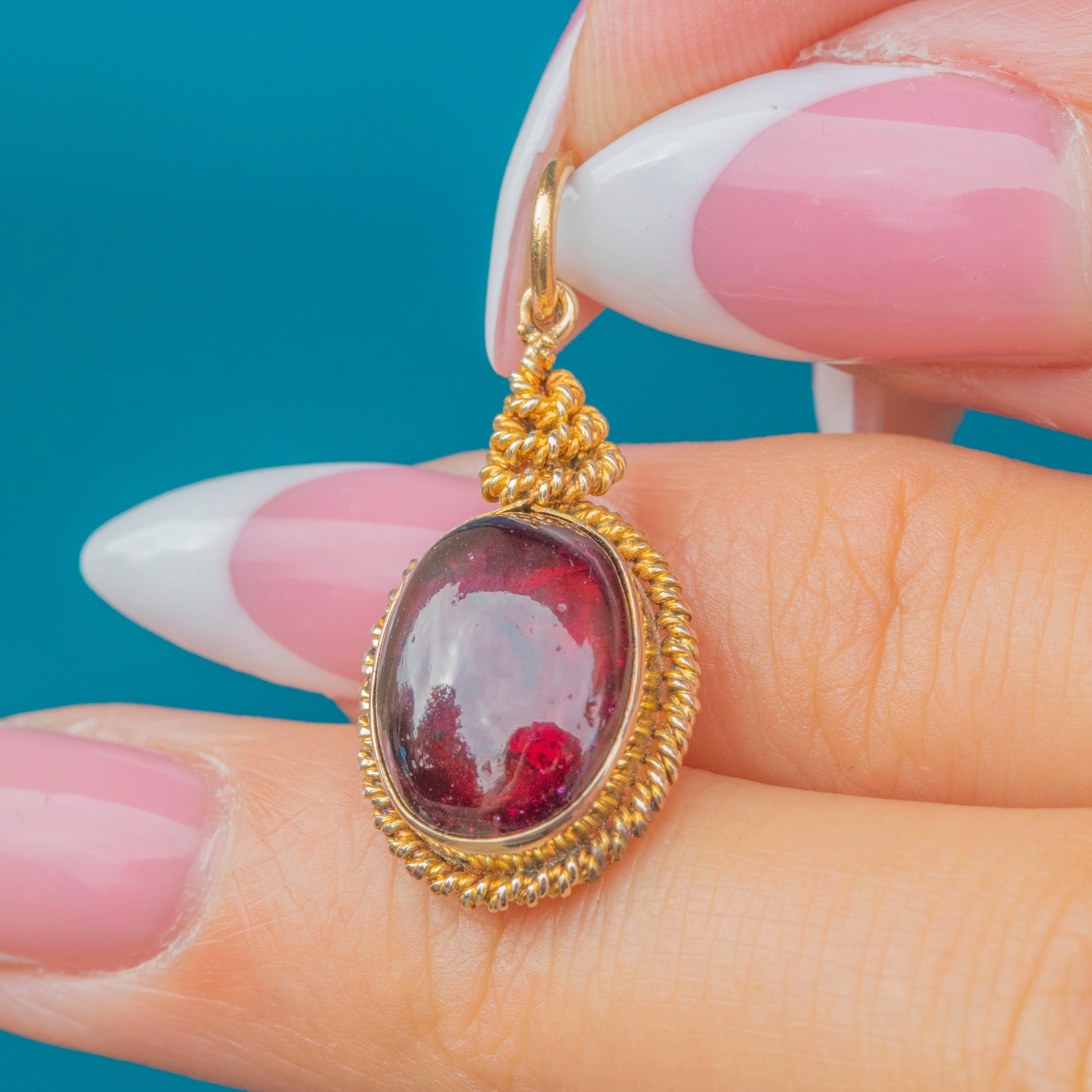 A Victorian 9ct Gold charm set with a rich red oval 3.25ct Garnet cabochon. The stone is bezel-set within a decorative rope-twist border, topped with an intricate knotted surmount and jump ring for easy wear.