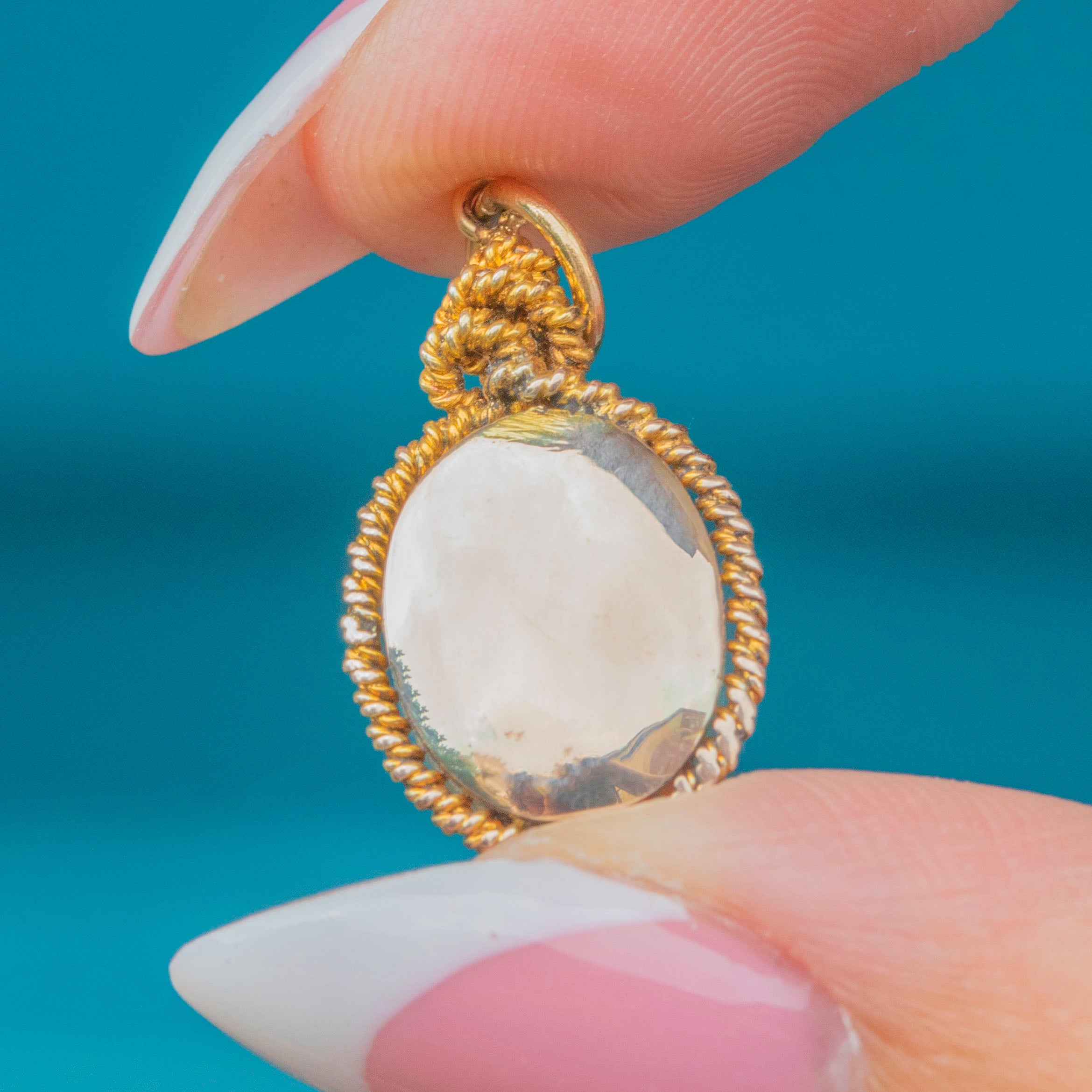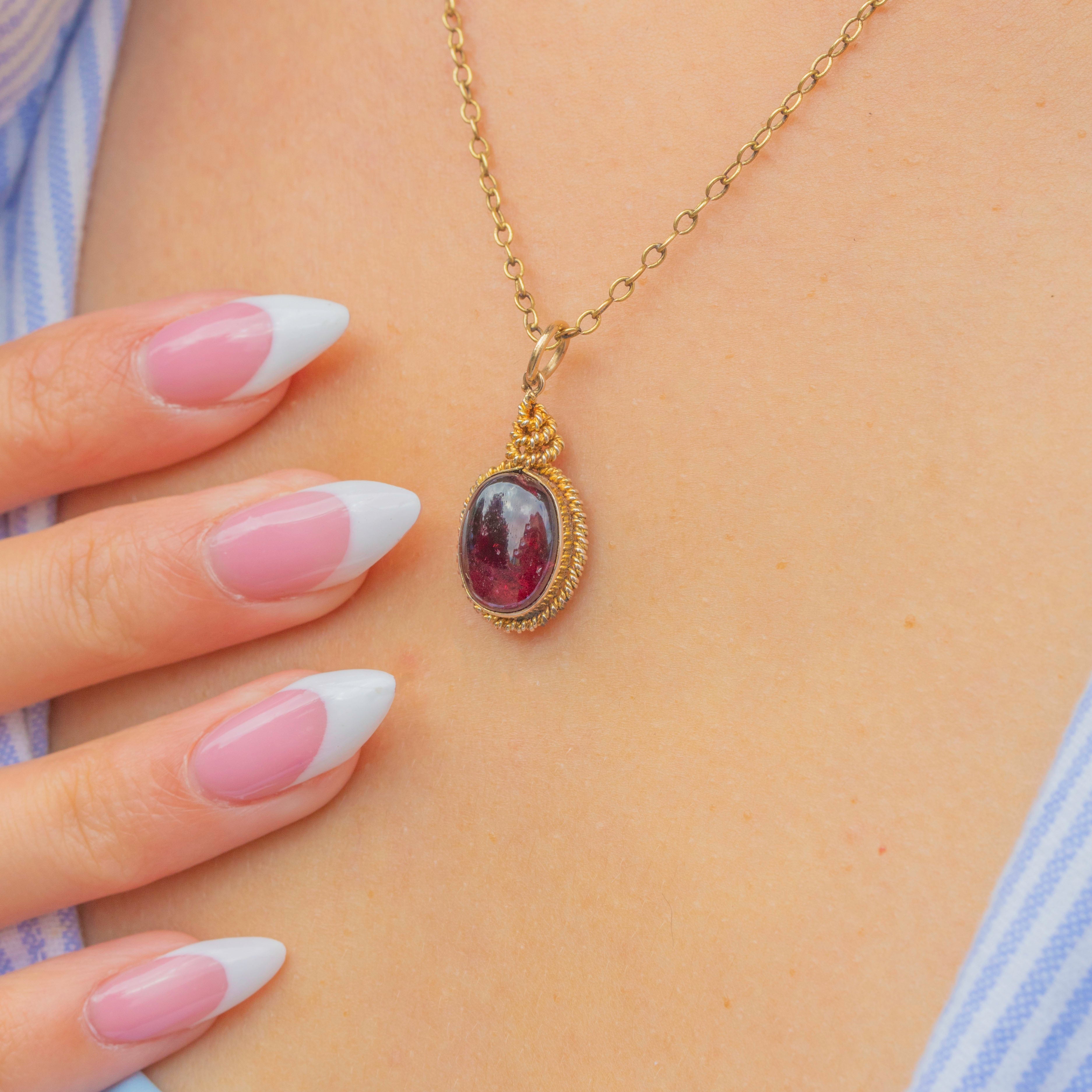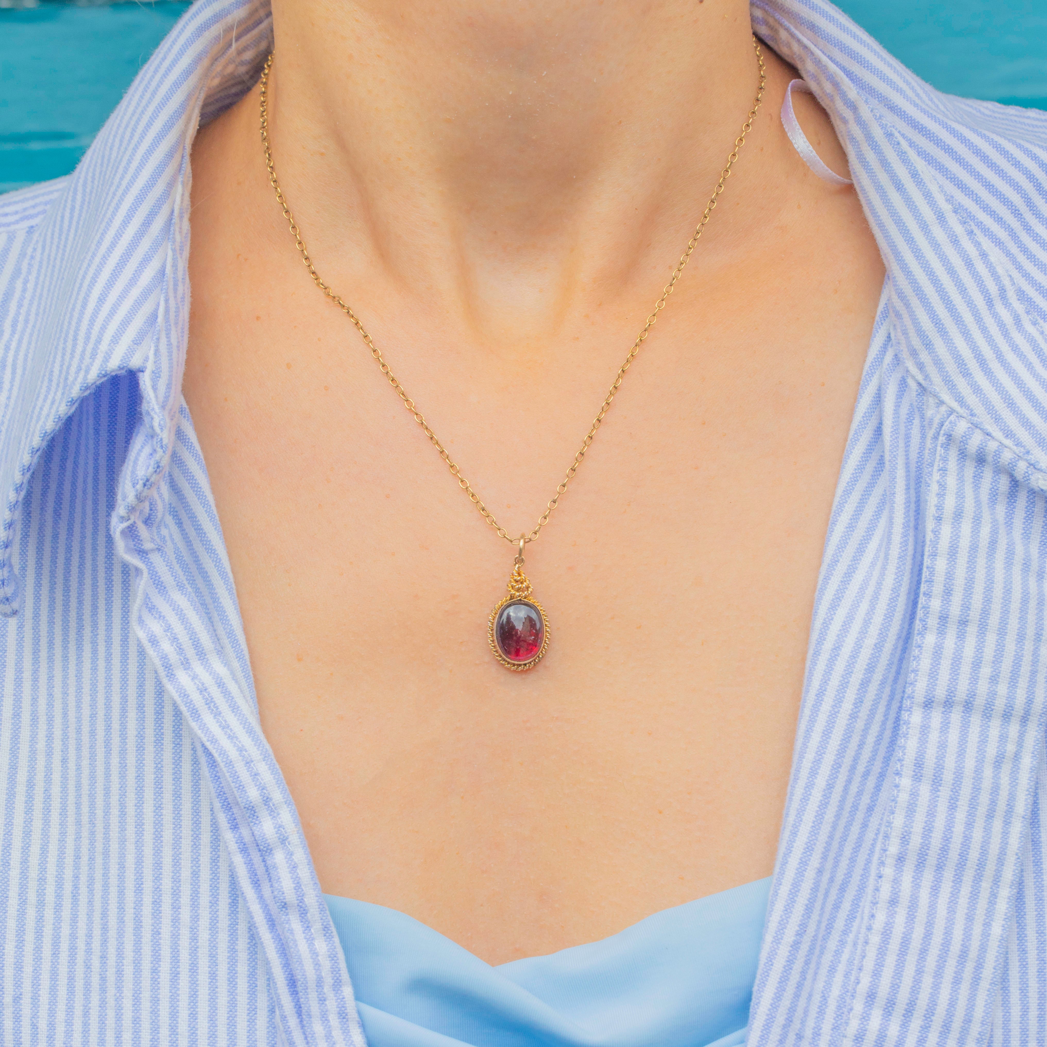 A Victorian 9ct Gold charm set with a rich red oval 3.25ct Garnet cabochon. The stone is bezel-set within a decorative rope-twist border, topped with an intricate knotted surmount and jump ring for easy wear.