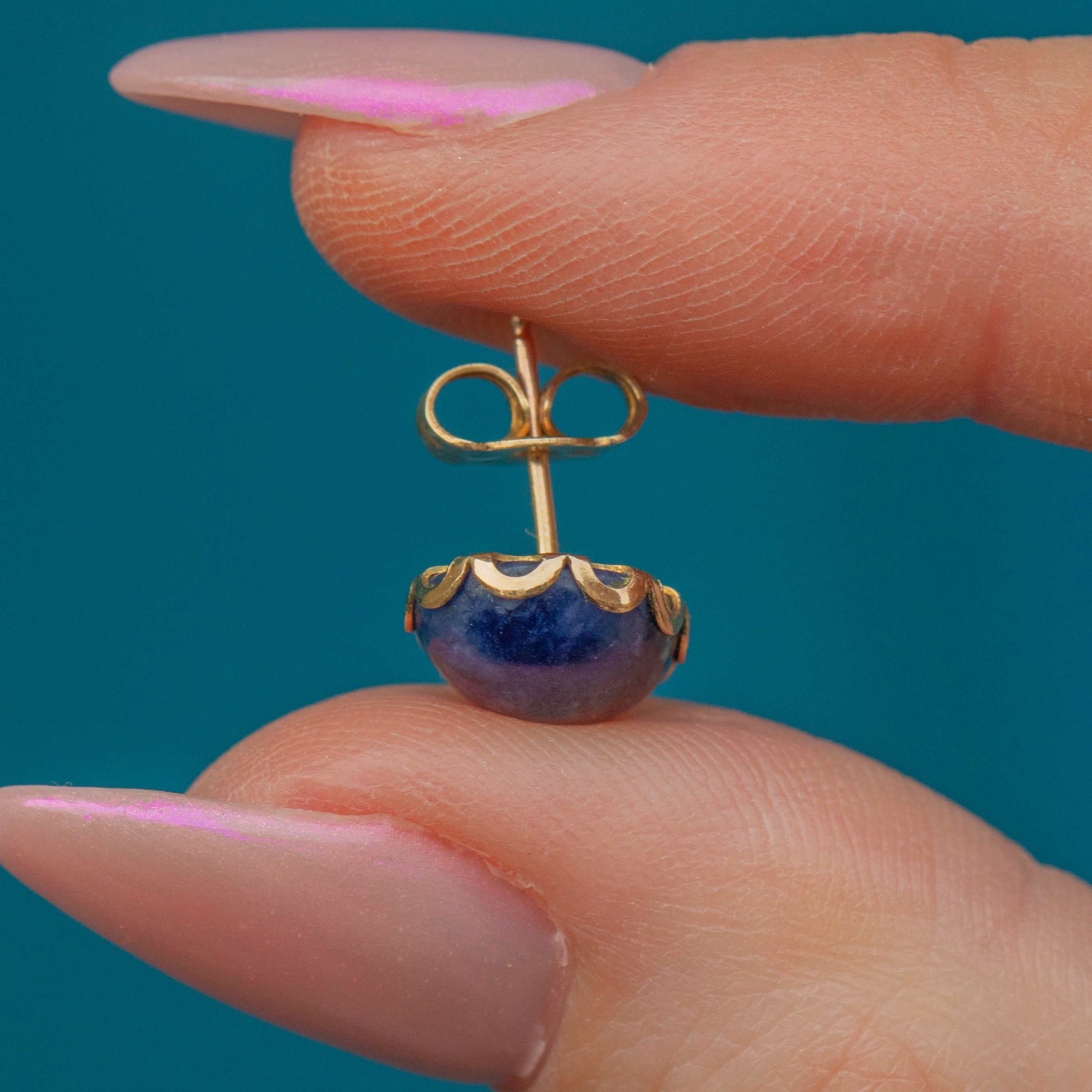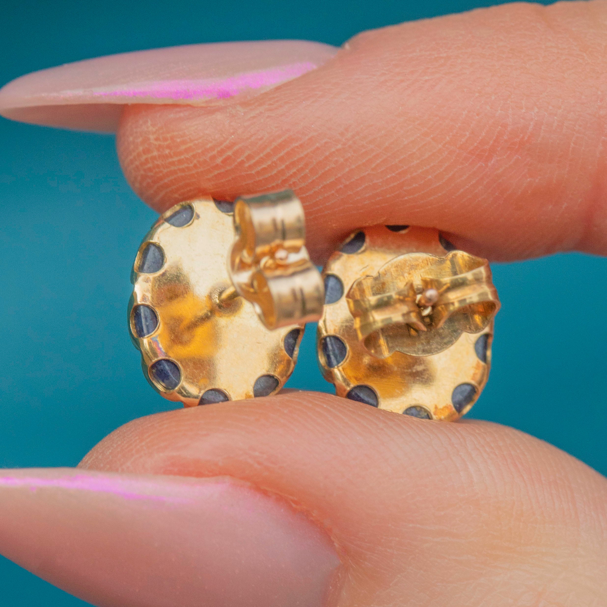 Admire the beauty of these striking antique 9ct Gold Lapis Lazuli stud earrings! Their twinkling midnight blue Lapis Lazuli centres are beautifully encapsulated in 9ct Gold settings.