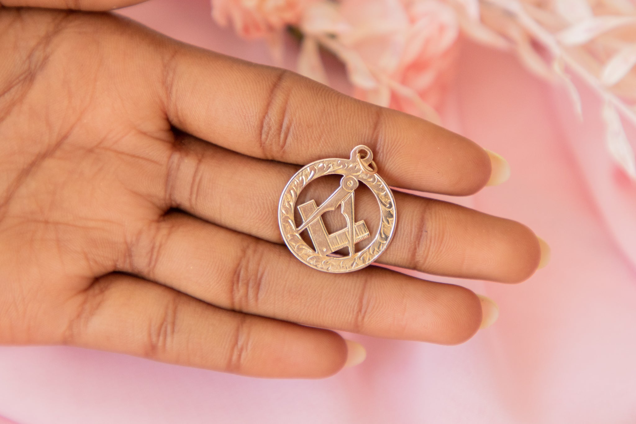 VERY GOOD. This antique 9ct Gold masonic compass pendant is in very good condition. The hallmarks are crisp and the front of the piece has been beautifully engraved. There is very minimal wear to the piece overall, and she can be worn with a Gold chain with ease!