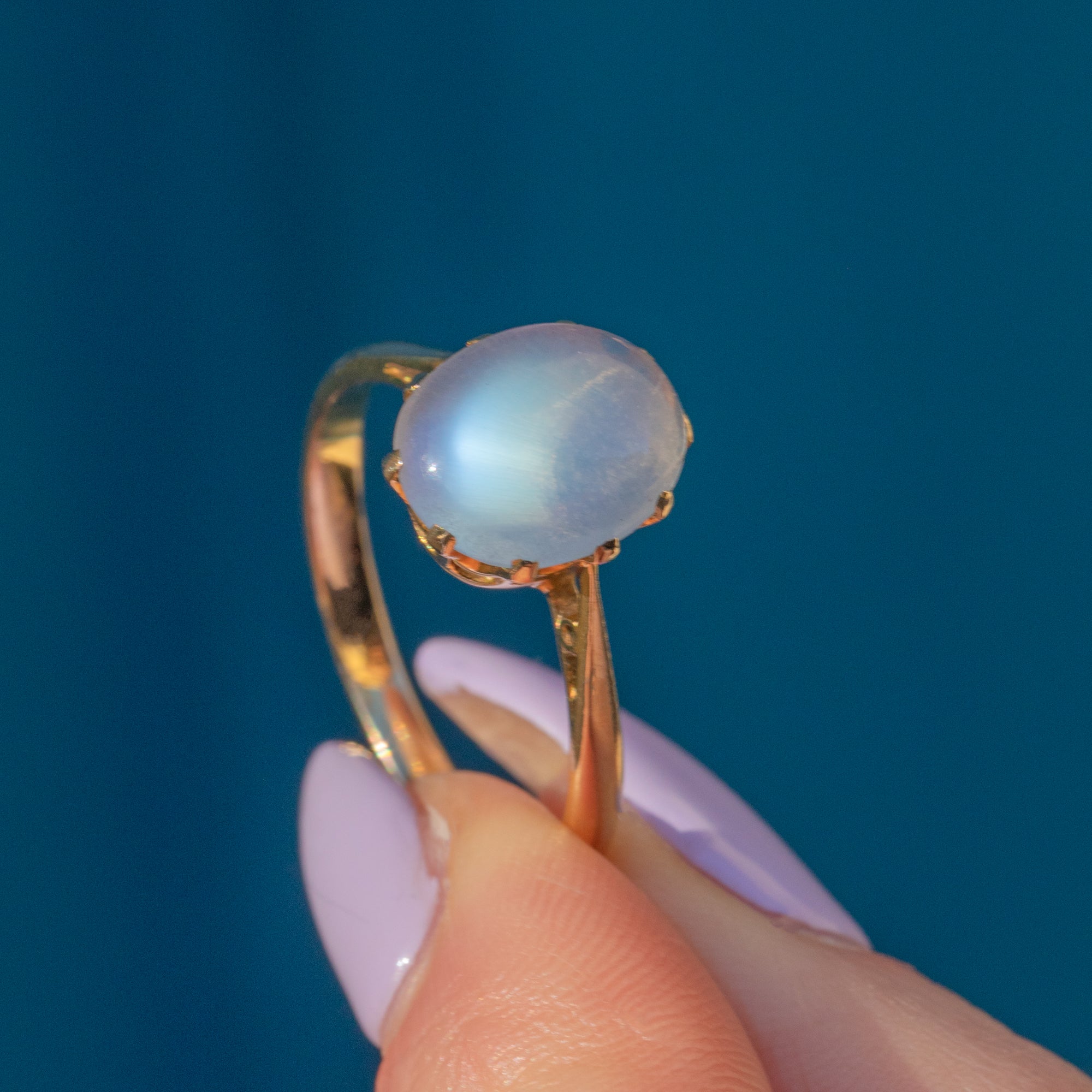 This gorgeous antique 9ct Gold Moonstone cabochon ring is fit for a princess! This exceptional Victorian ring fits the bill of magical and mystical, with a large cabochon-cut Moonstone at her centre!