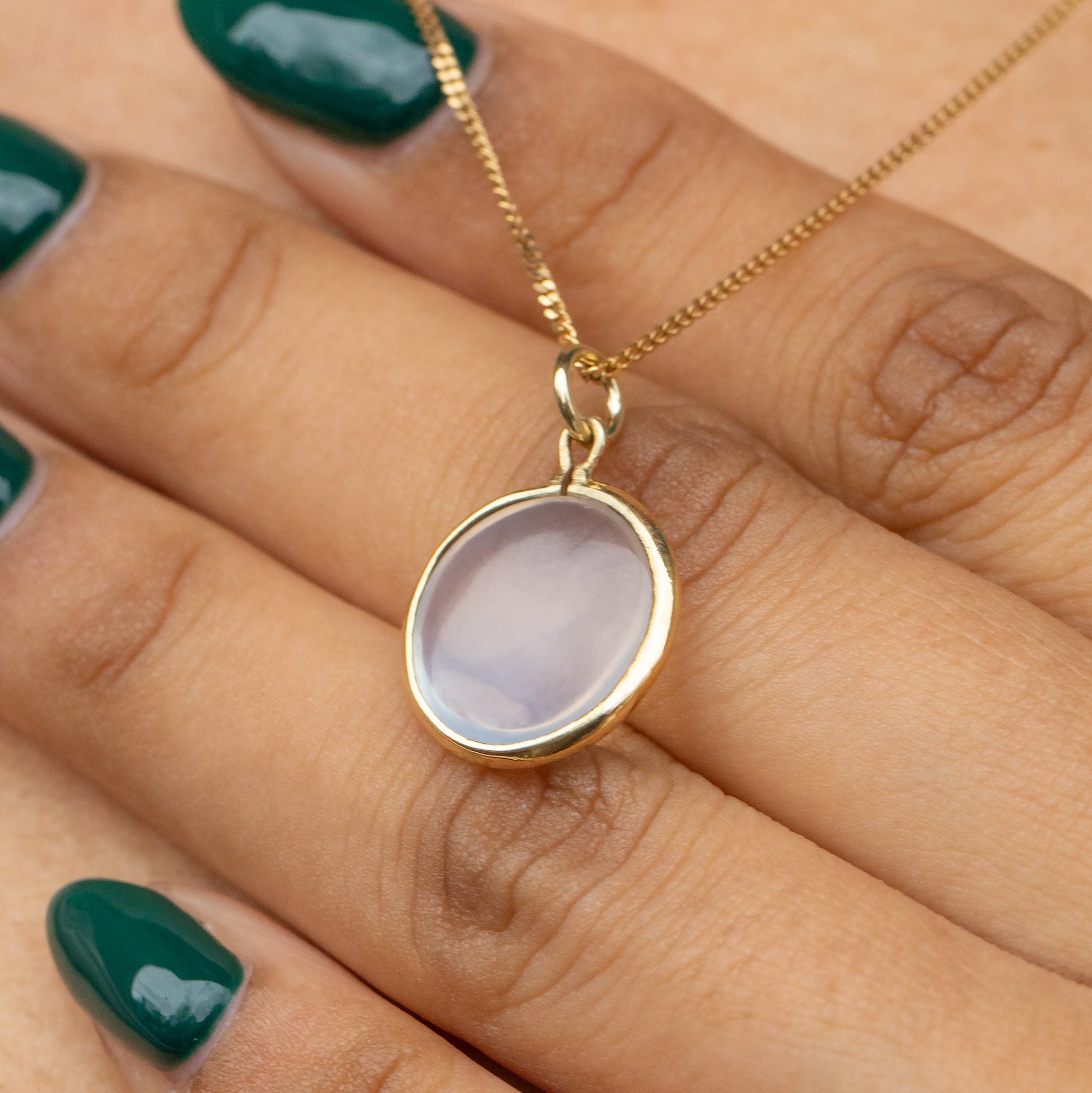This Moonstone charm will sit perfectly suspended from a fine Gold chain and is ideal for everyday wear. Stack her alongside your other gems, or simply wear her alone to add some Victorian charm to your look.