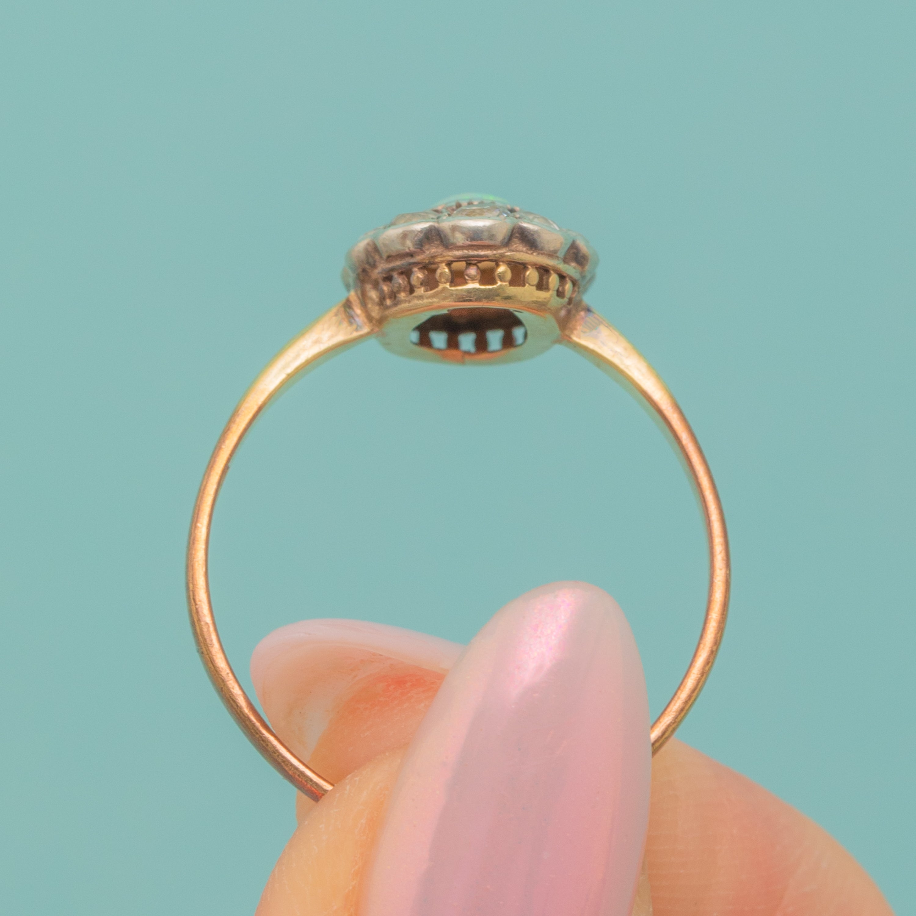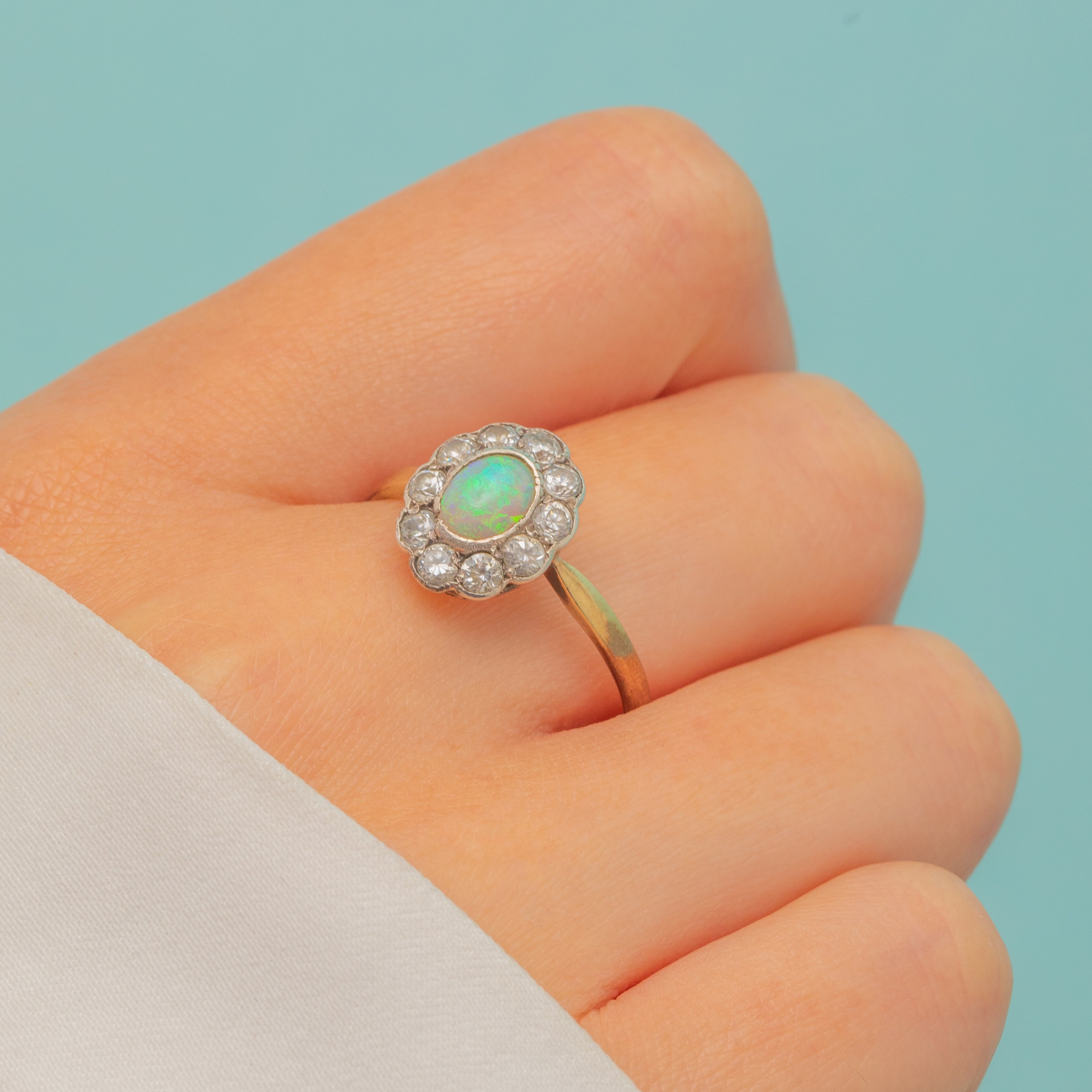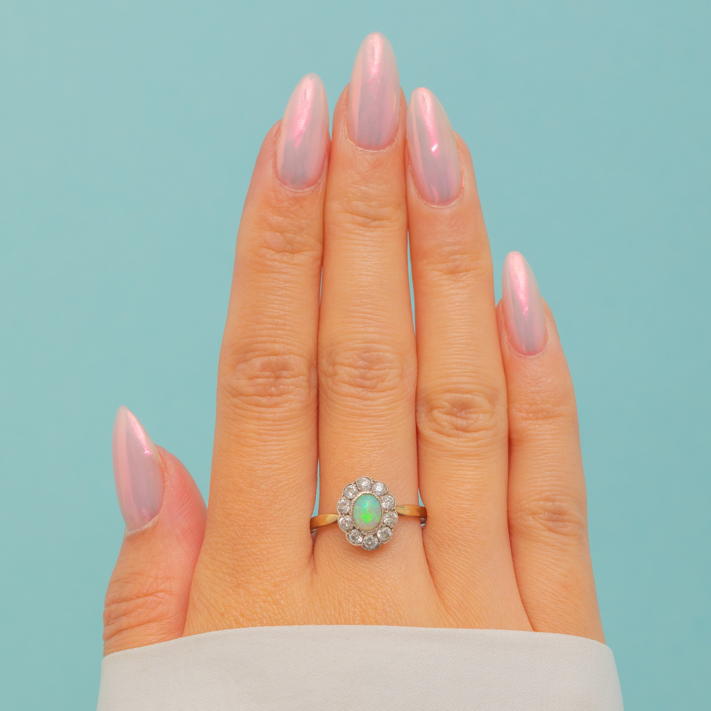 VERY GOOD: This antique 9ct Gold Opal & Paste cluster ring is in very good condition throughout. The Opal itself is free from chips or nibbles, and while there is a little wear to the setting, she is set securely. There is also some discolouration and a resize mark to the ring band, which has accrued a satisfying rosy colour over time. She is a delightful little piece that will be worn and enjoyed for years to come!