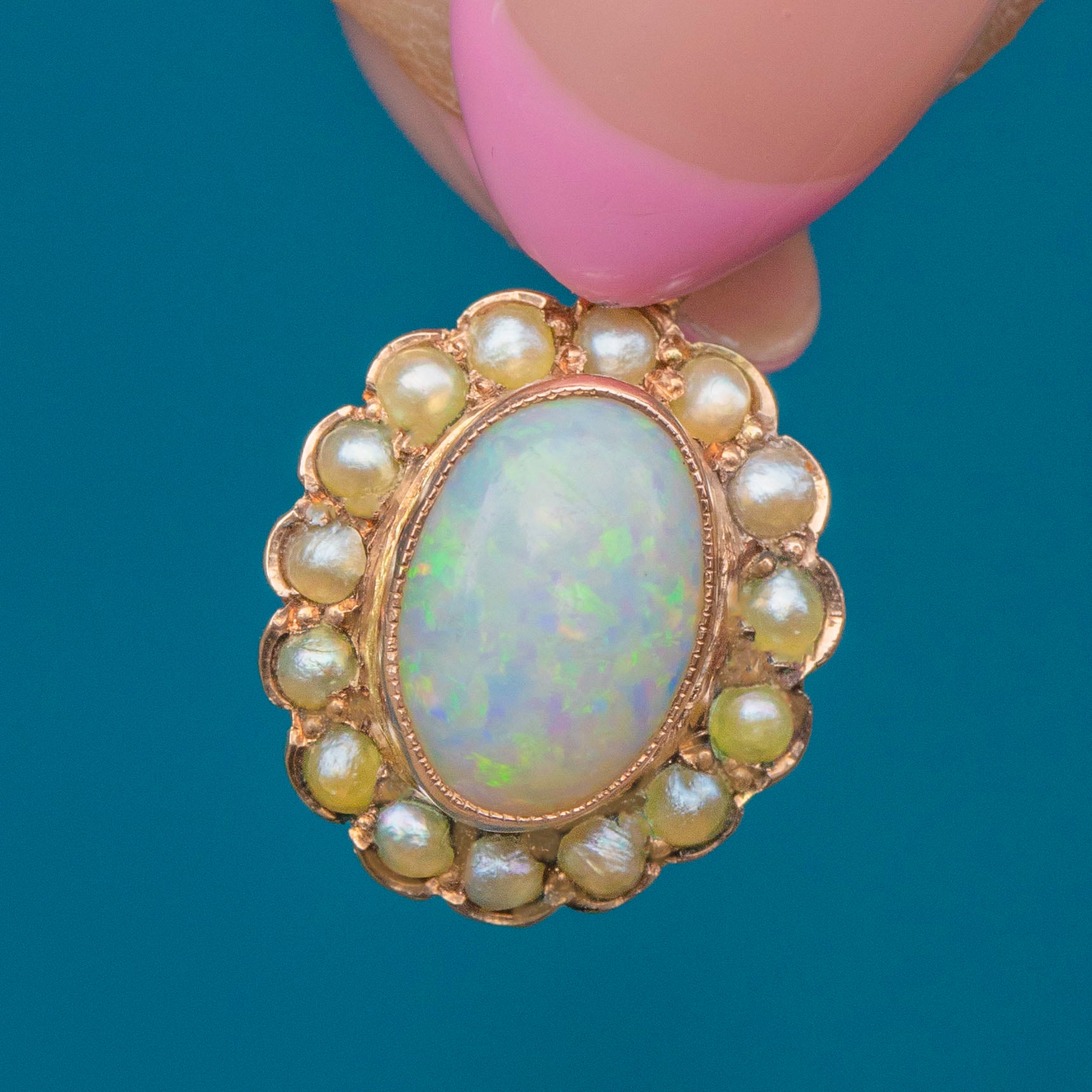 The combination of an iridescent Opal and luminous Pearls makes her fit for royalty! This exceptional Edwardian charm will add decadence and elegance to any outfit.
