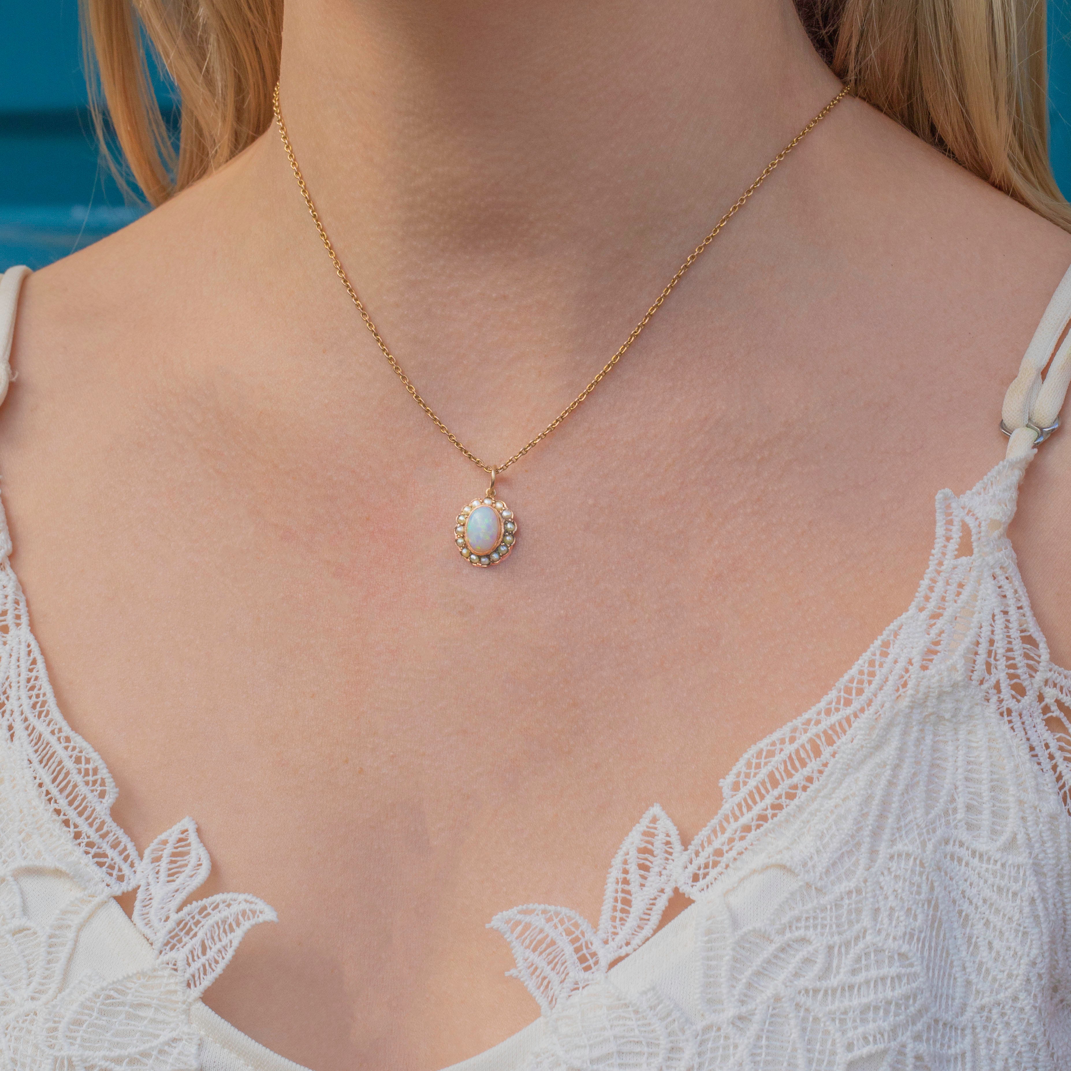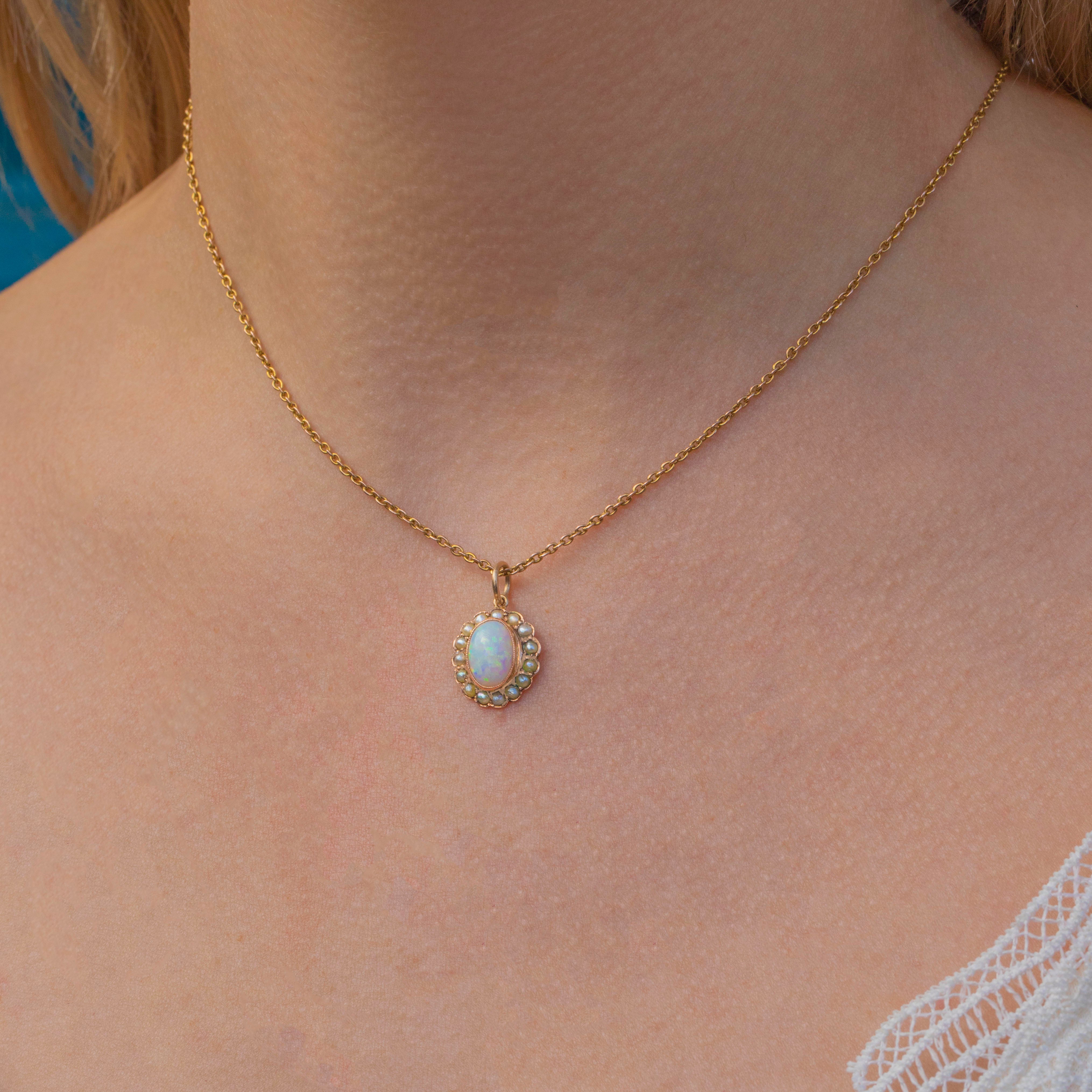 EXCELLENT.  This antique 9ct Gold Opal and Pearl charm is in excellent condition throughout. Her Opal cabochon is smooth to the touch, with no chips or scuffs to note, wrapped securely in its 9ct Gold bezel. The Seed Pearls are all present in the cluster, with a lovely luminous tone.