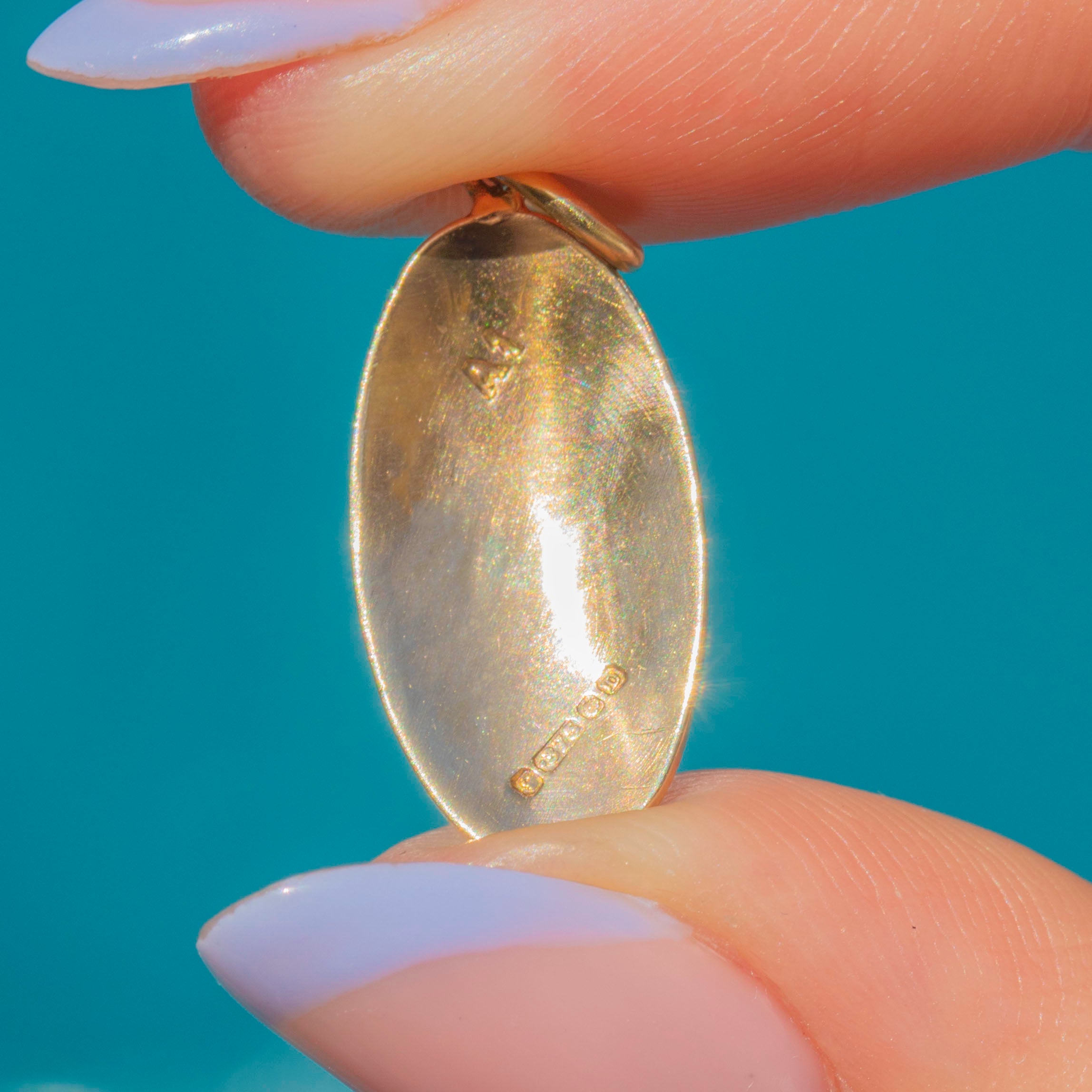 EXCELLENT: With little to report, this antique 9ct Gold oval pendant is in excellent condition. On the front, her Gold has a super glossy, mirror finish with a warm tone throughout. On the reverse, you can see her set of English hallmarks dating her back to 1852. There is a small area of lightened Gold in the centre of the back of the pendant, but rest assured this cannot be seen when worn. With a soldered jump-ring, she can be worn with the utmost confidence!