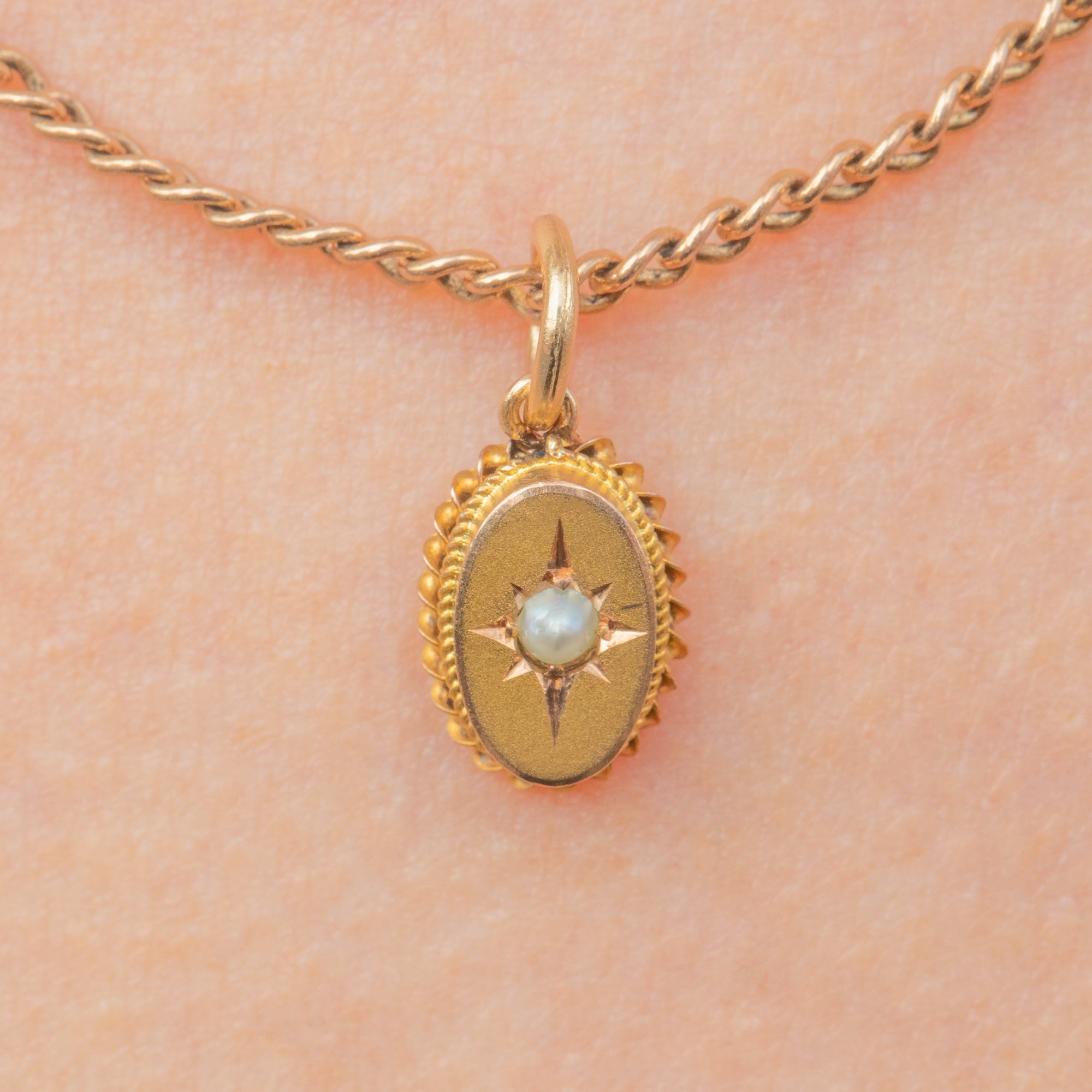 VERY GOOD. This antique 9ct Gold Pearl star set charm is in very good condition! The Pearl has retained all its nacre and is secure in its star setting. The 9ct Gold has a wonderful saturated hue and the rope detailing is firmly soldered around. On the back, there is some subtle wear from her conversion from a stick pin, however, this can't be seen when worn. This Victorian Pearl pendant will provide you with ample styling opportunities!