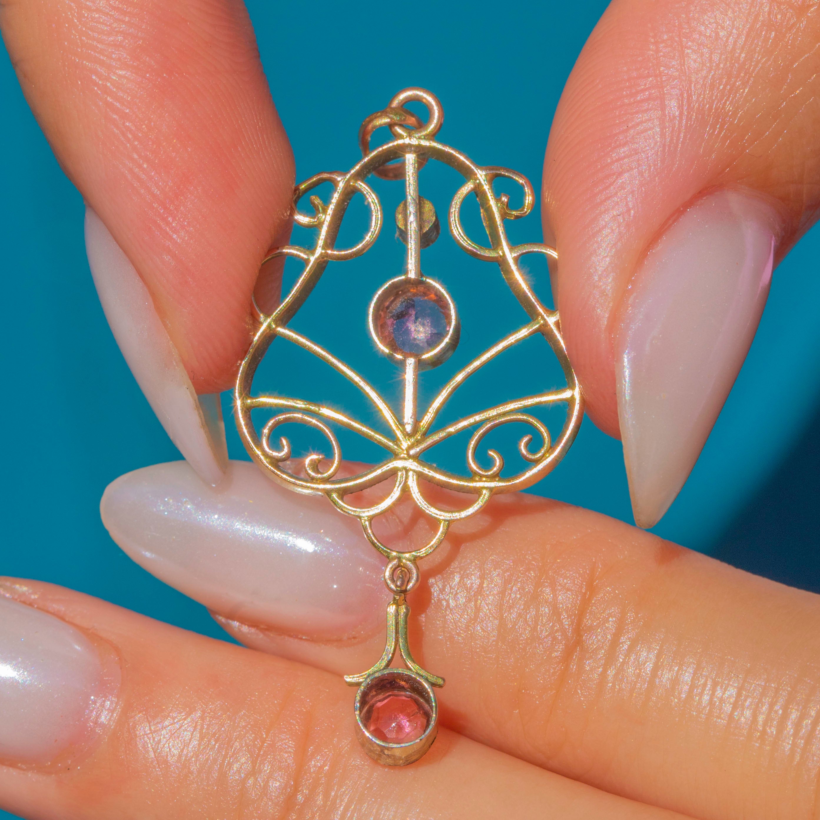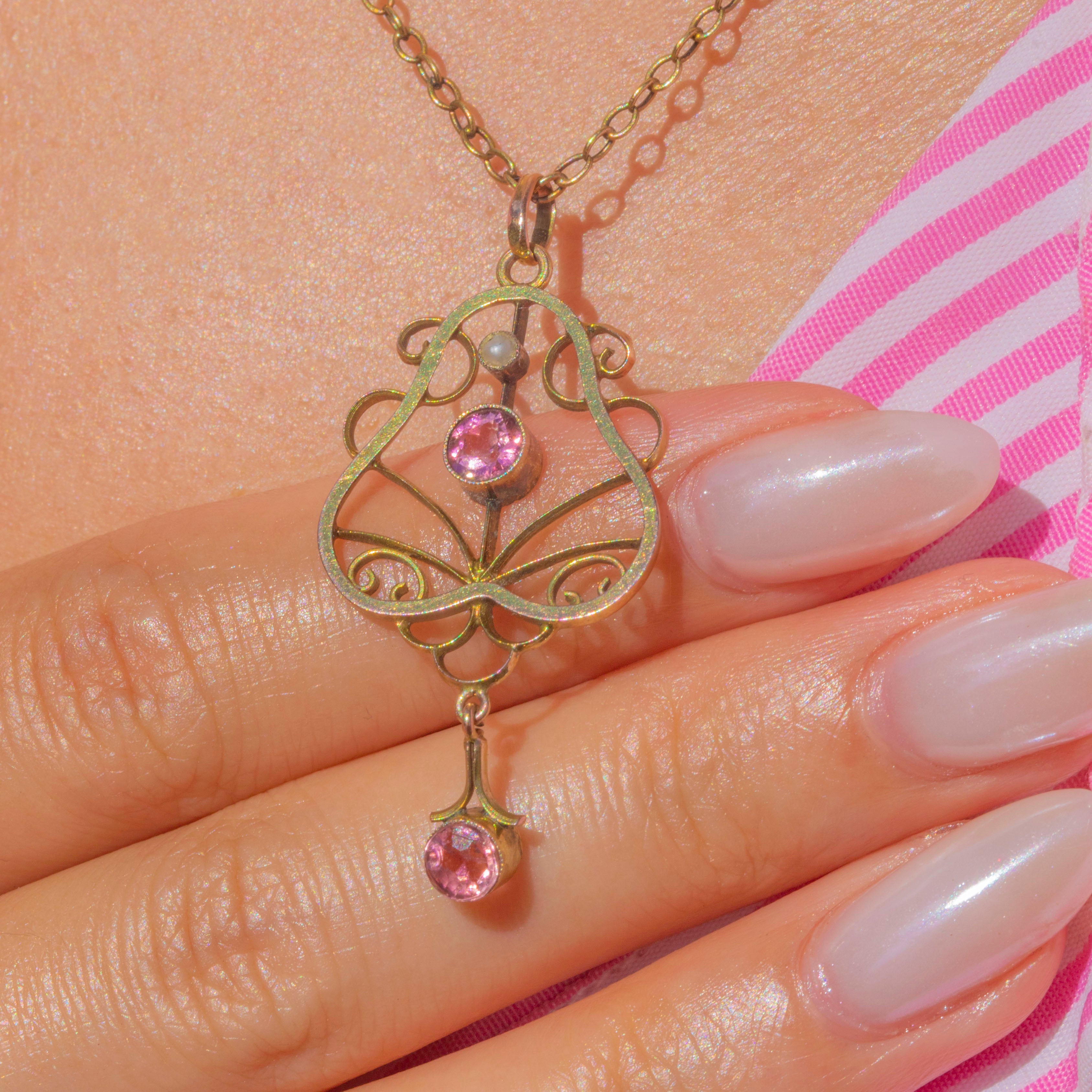 Pretty in pink, this pink Tourmaline pendant is perfect for lovers of Edwardian treasures. The pendant has a wispy and feminine form that perfectly captures the delicate designs of the era!