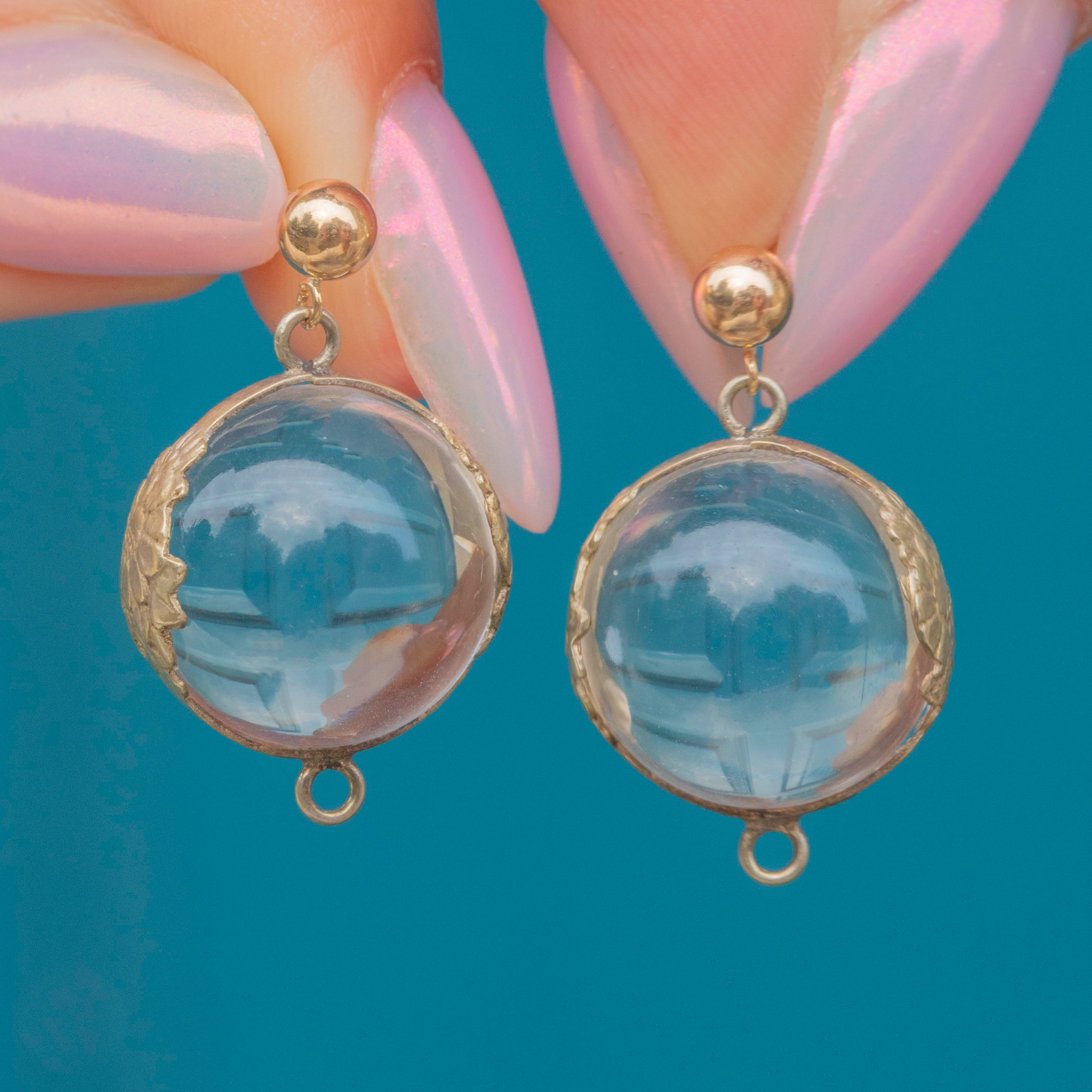 VERY GOOD-EXCELLENT: These Victorian Pools of Light Rock Crystal drop earrings are in great condition. Each Rock Crystal billows the light beautifully and is secure in its settings. There is some surface wear present, including minor scratches and fleabites, though this is difficult to spot when wearing. With secure butterfly backs, these antique earrings can be worn with utmost confidence.