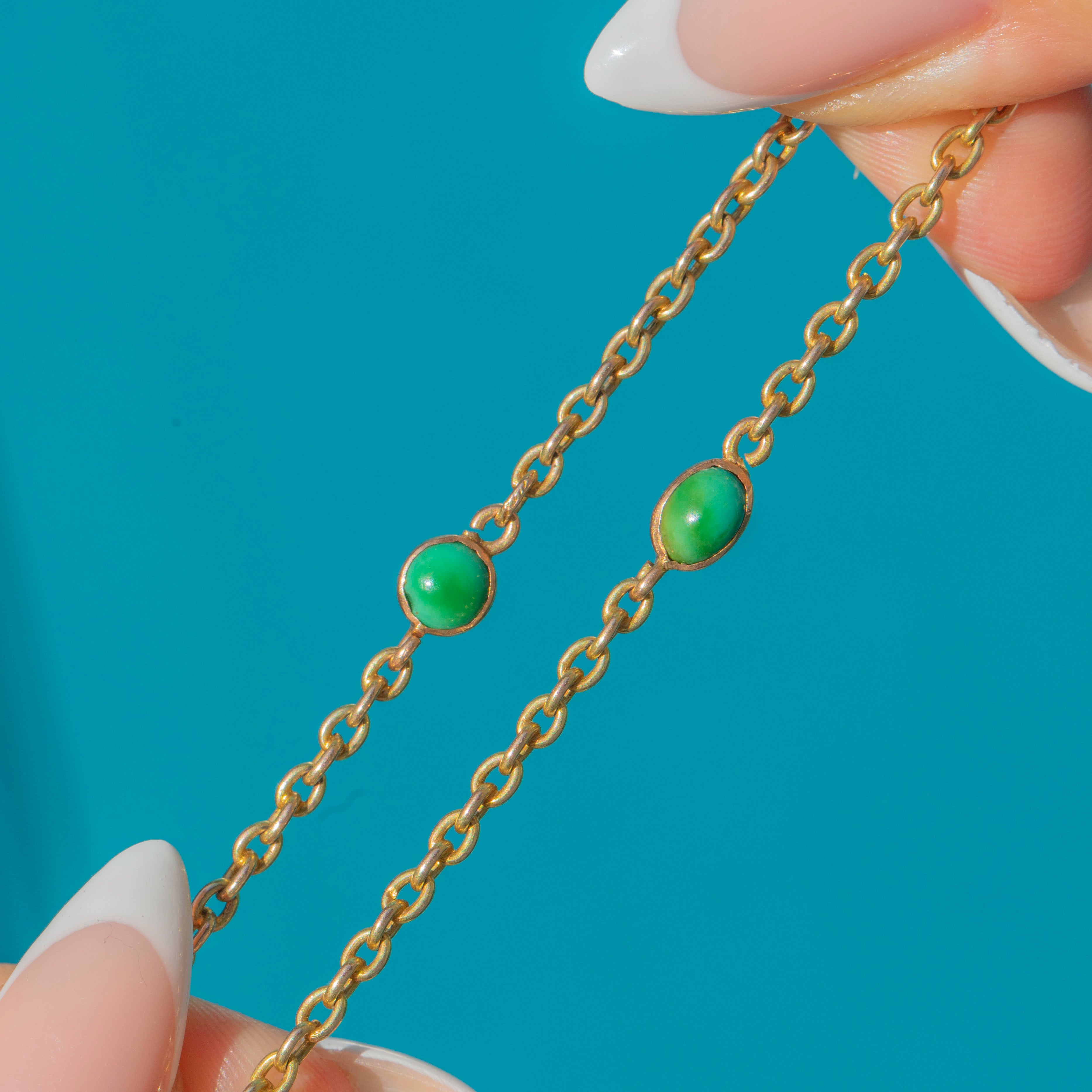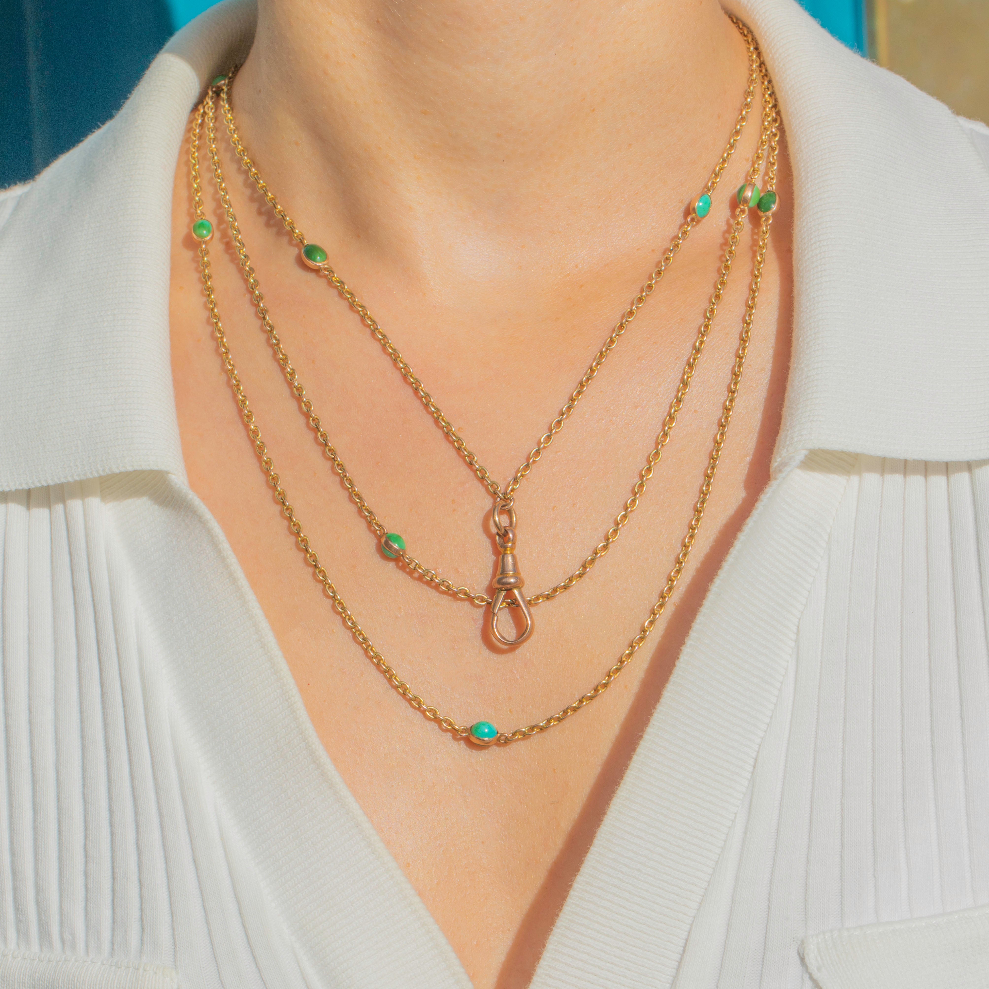 This impressive Victorian longuard chain is crafted in rich 9ct Gold and set at intervals with vibrant Turquoise cabochons. The Turquoise beads bring bright pops of colour against the warm Gold, creating a striking and versatile antique jewel.