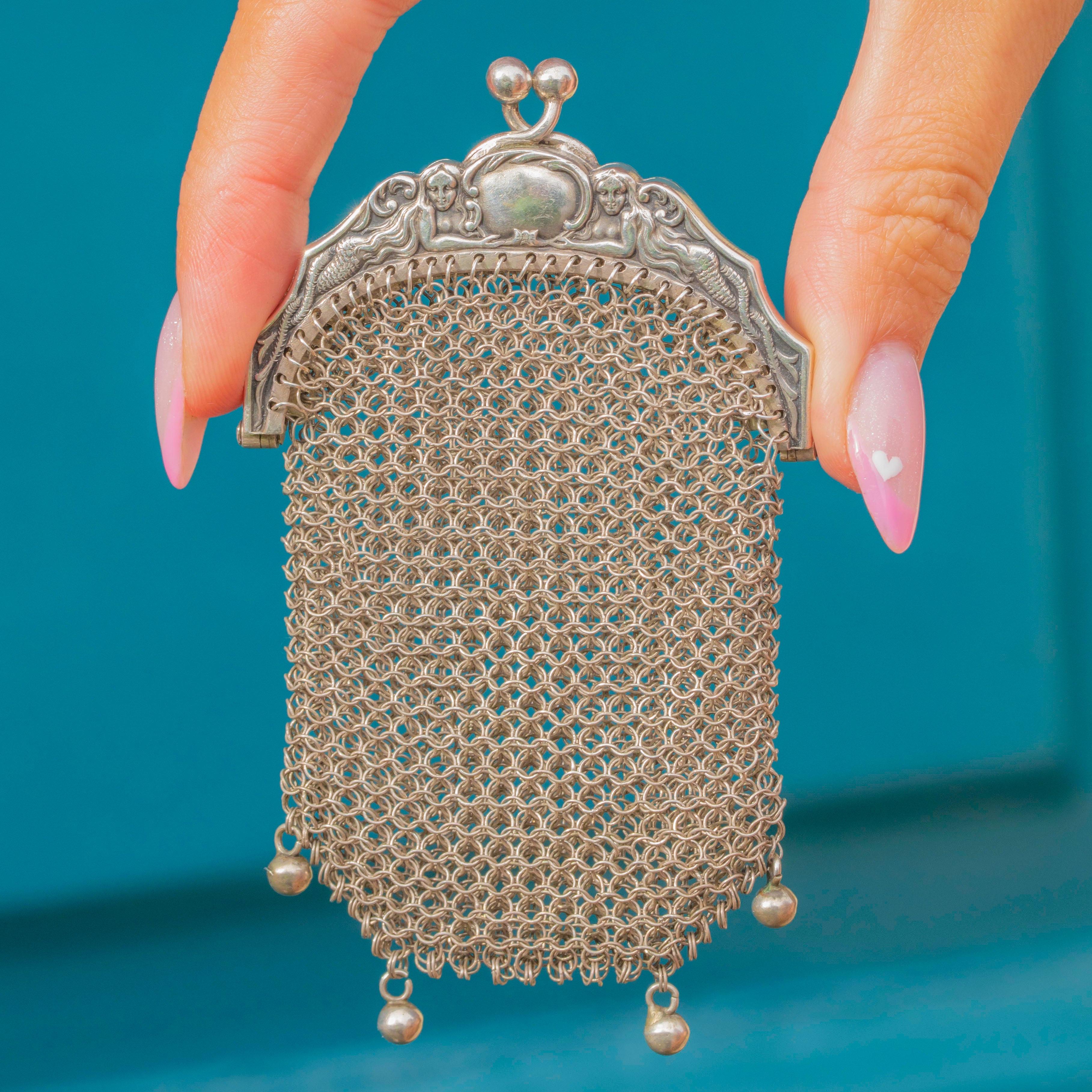 Antique Art Nouveau Silver Chainmail Coin purse with Mermaids.