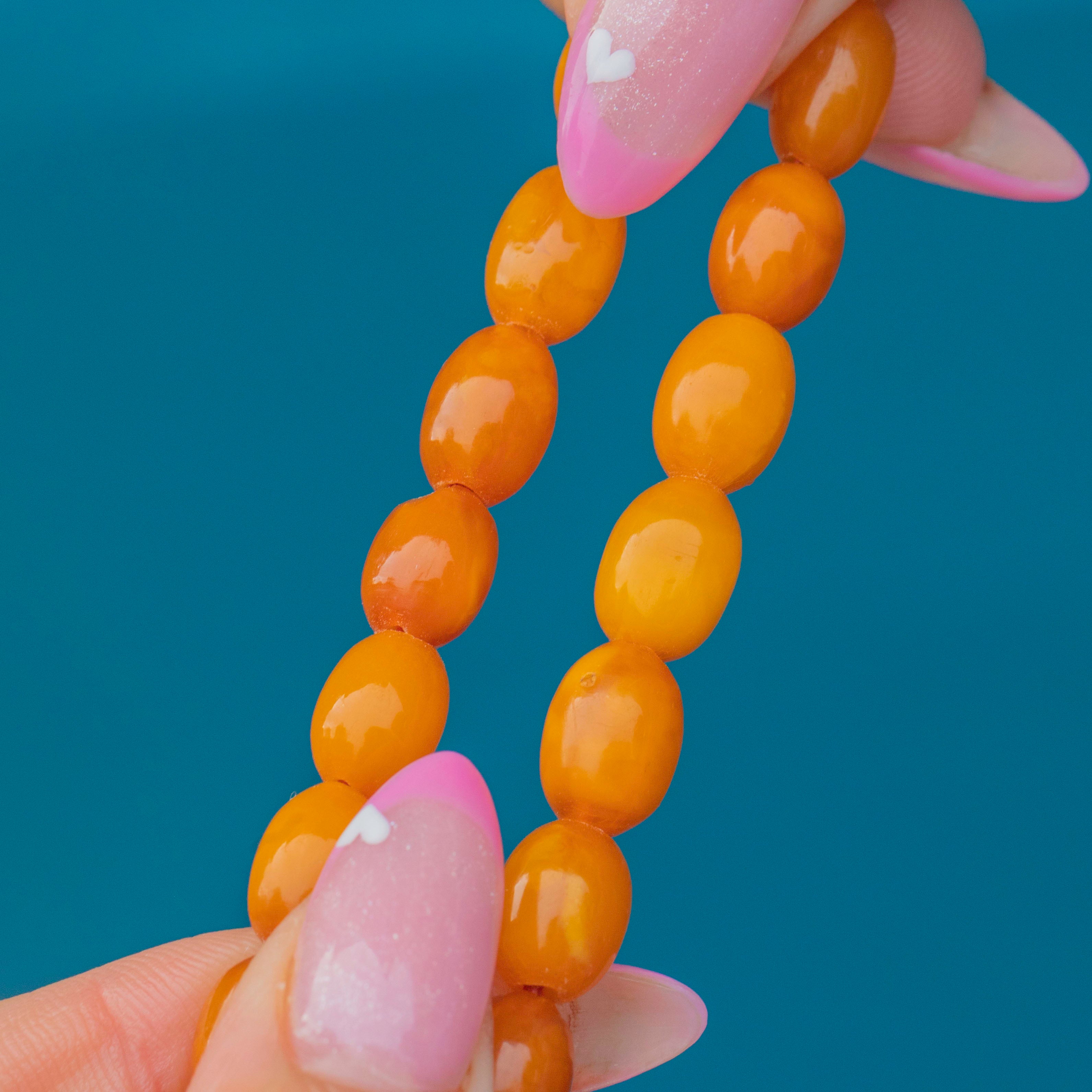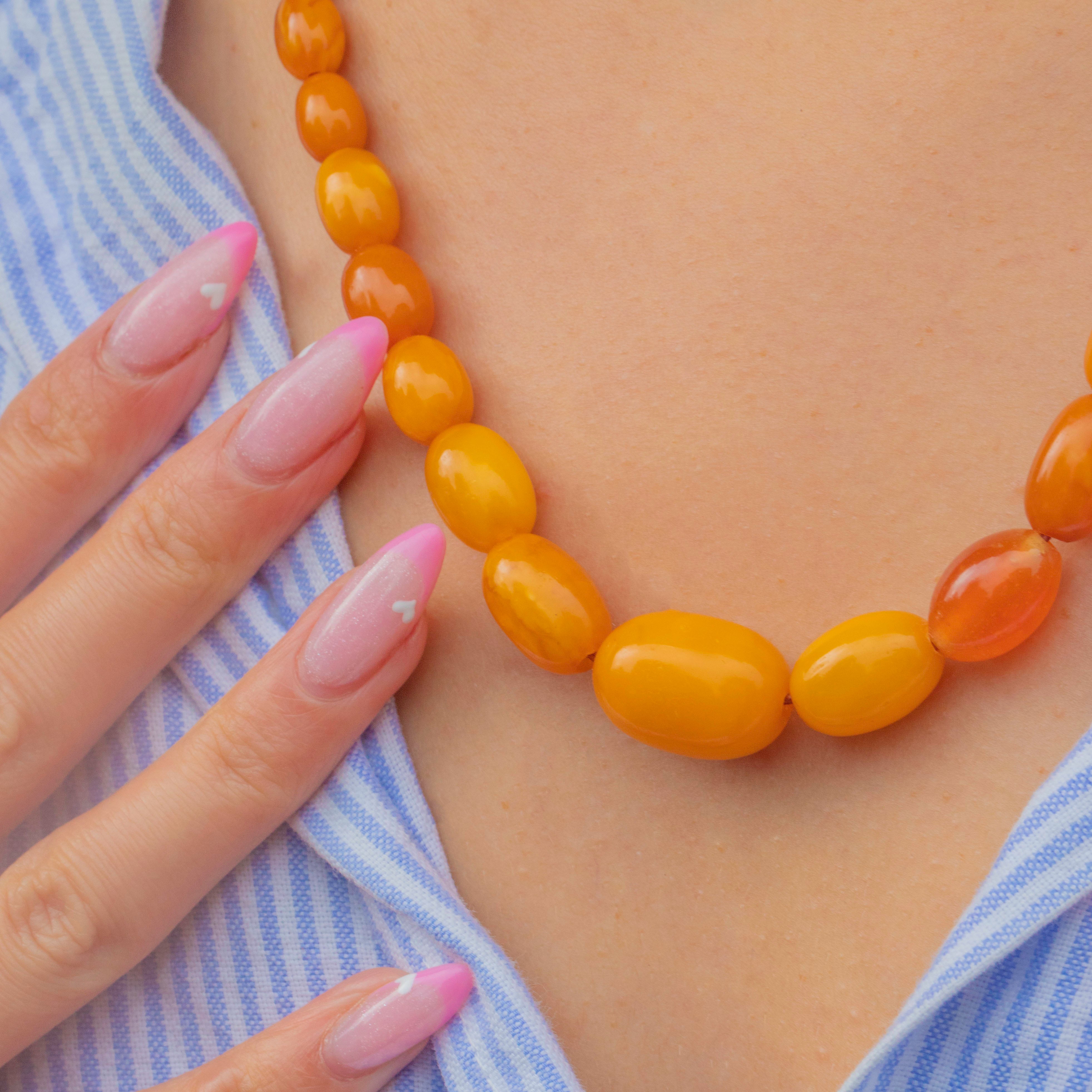 A glowing strand of natural Butterscotch Baltic Amber beads, beautifully graduated and paired with an original antique 9ct Gold bolt-ring clasp. The Amber shows the warm, creamy tones so loved in the Art Deco era, with a smooth tactile polish that feels wonderful against the skin.