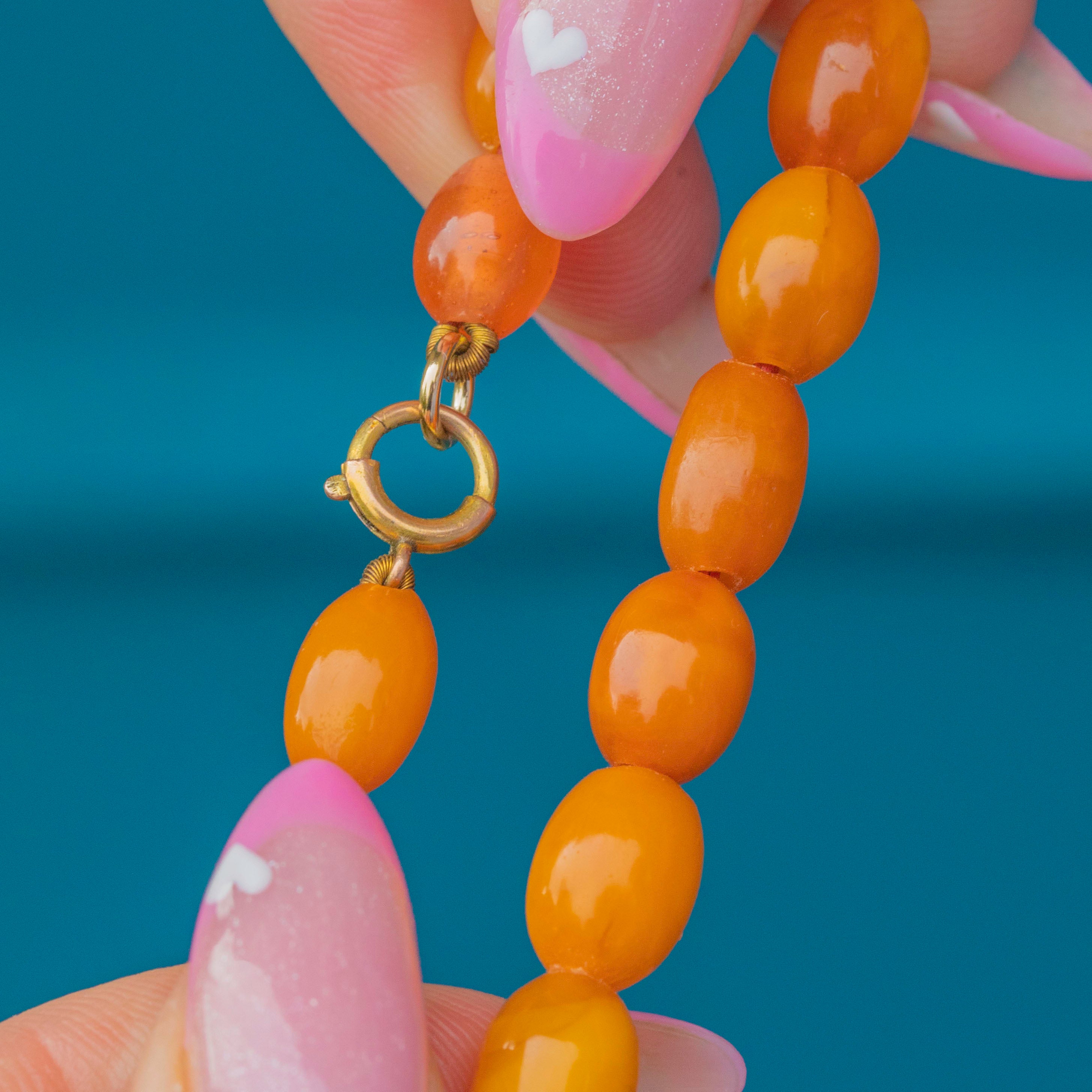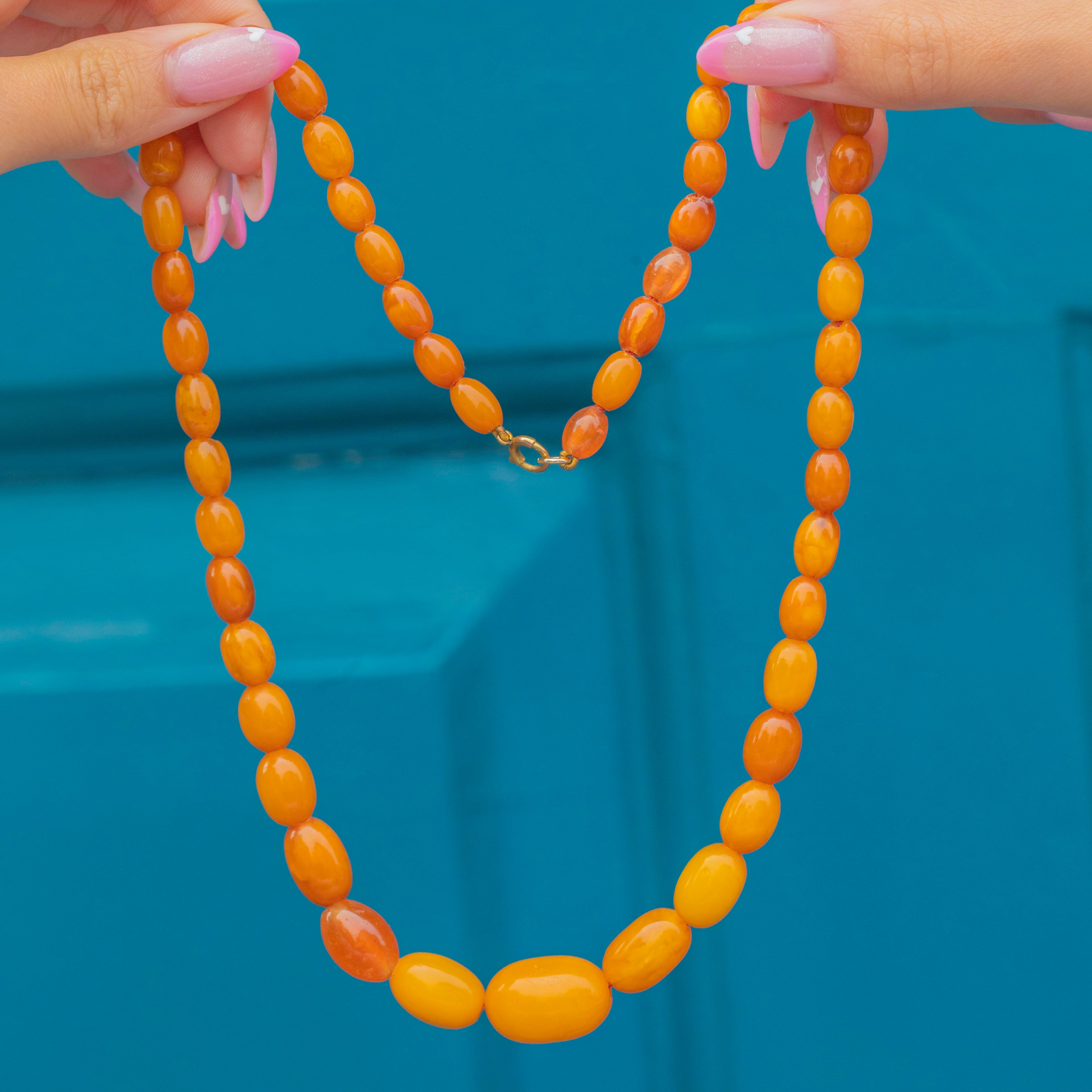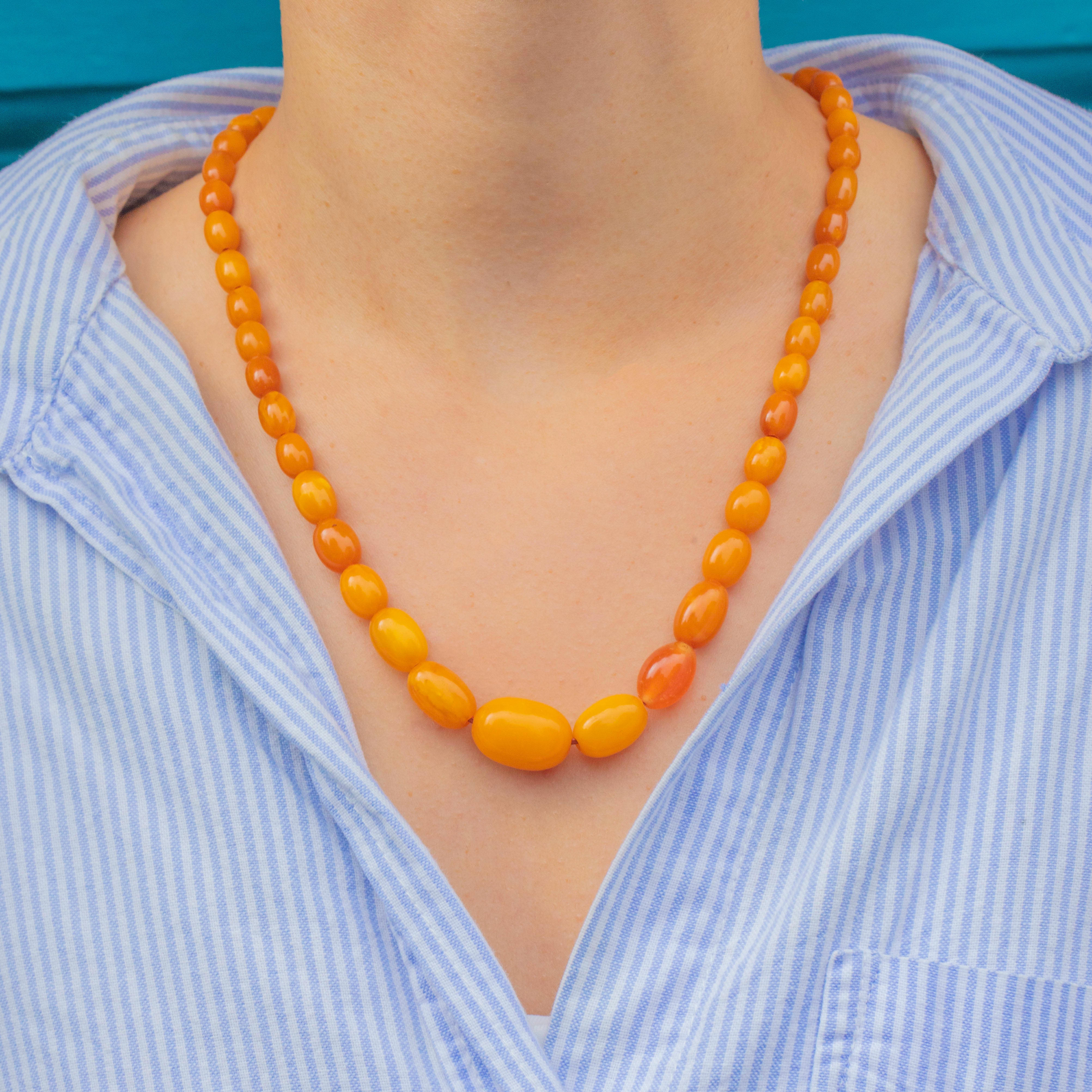 VERY GOOD: Amber beads are smooth with no chips or cracks, retaining a lovely polish and colour. The 9ct Gold bolt-ring clasp is secure and in excellent working order. The strand is not knotted between beads, consistent with many period examples.