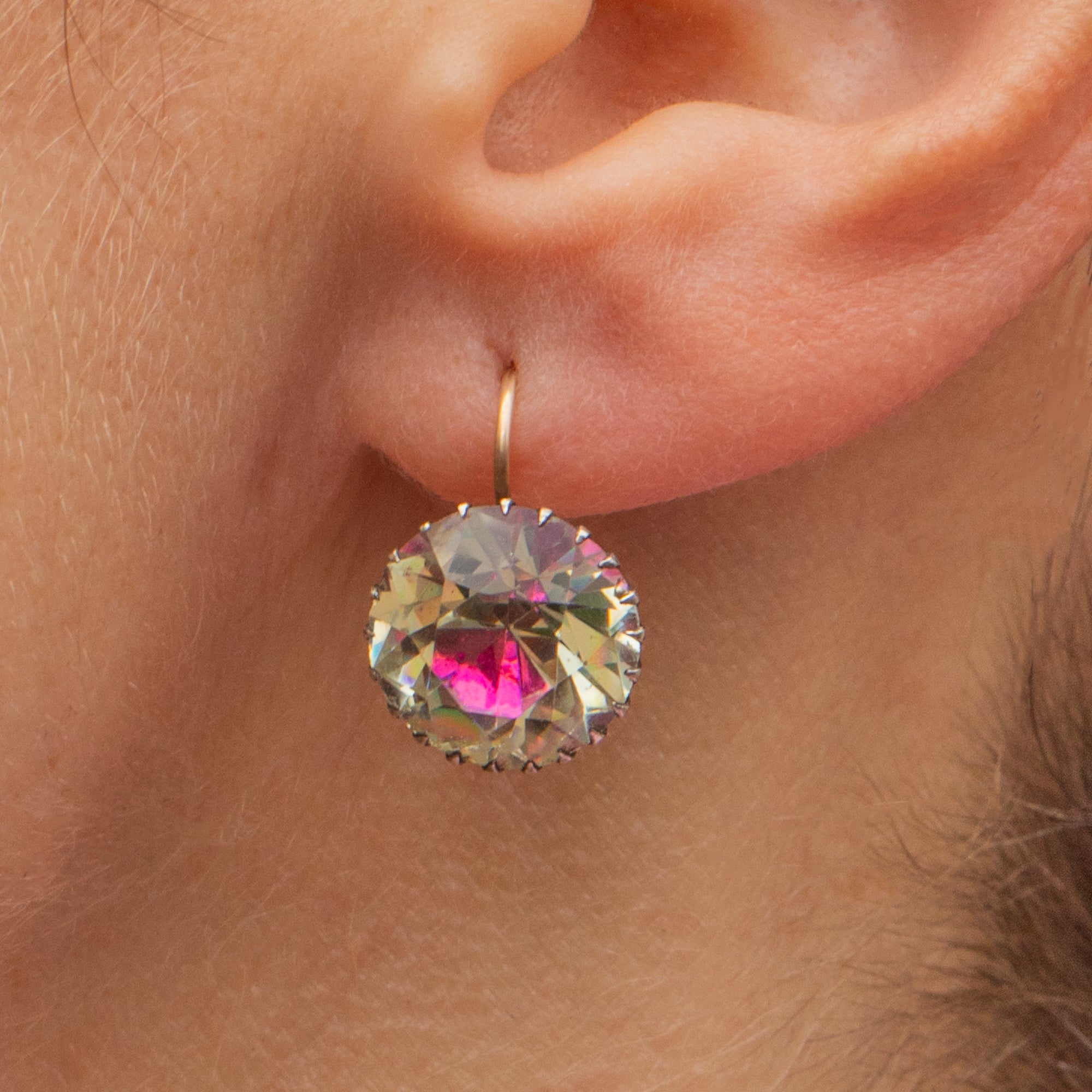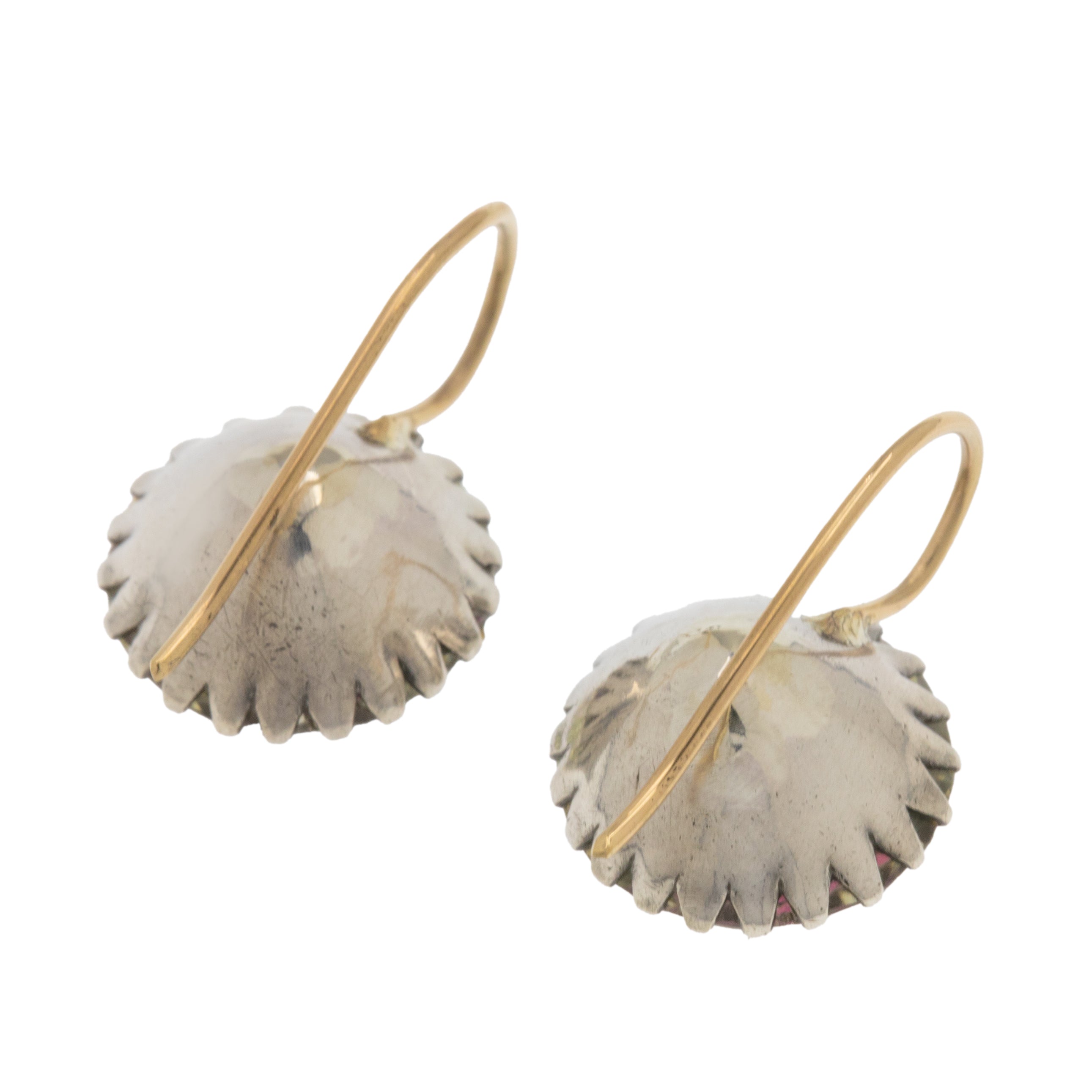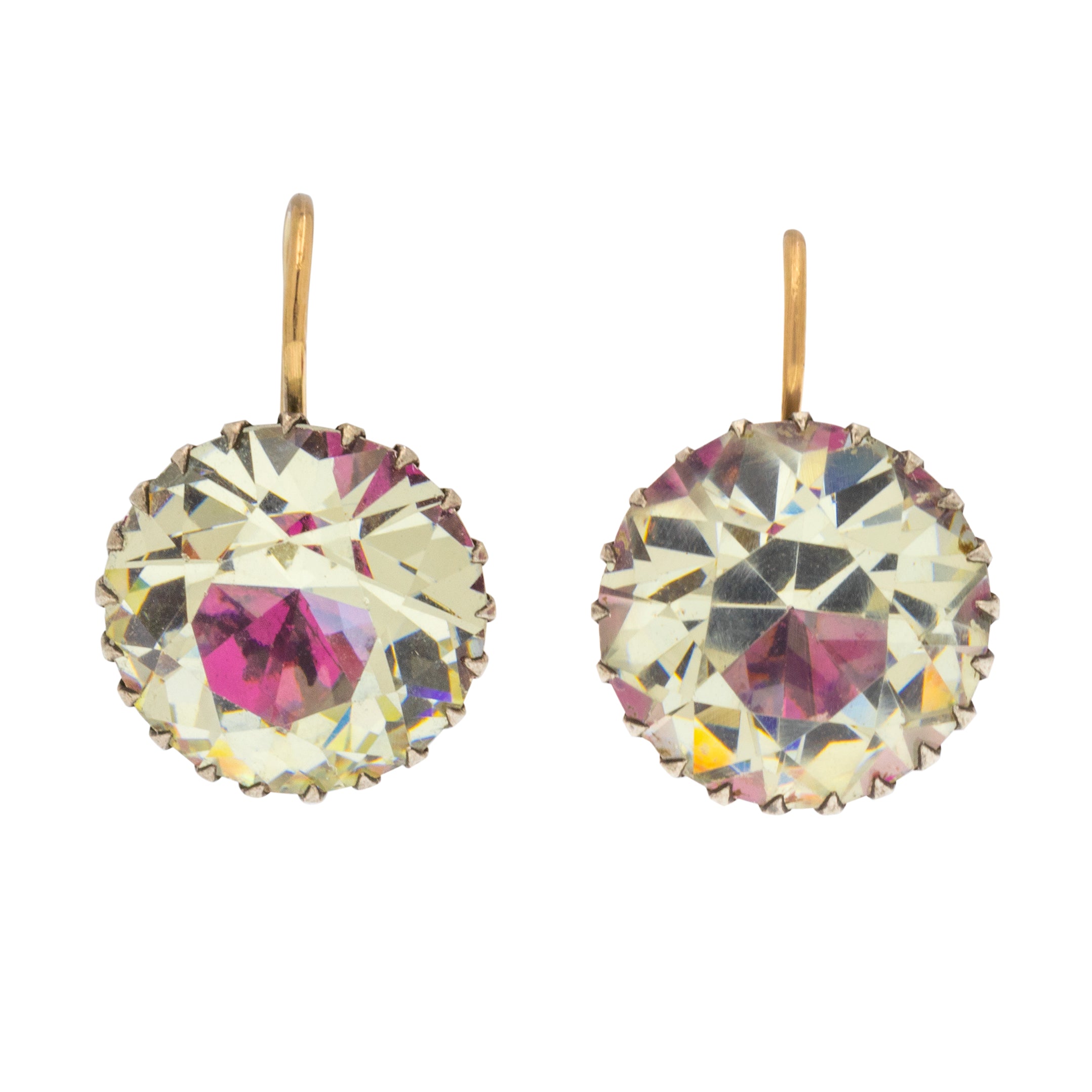 EXCELLENT. These antique foiled pink Paste earrings are in wonderful condition. The Paste gemstones have a beautiful pink hue and the foils have been well preserved. The 15ct Gold hooks are robust and generously sized, allowing you to confidently wear these magnificent Victorian Paste earrings comfortably whatever the occasion! The domed back of the earrings have some slight surface wear present, but they are smooth and for the most part even in colour.