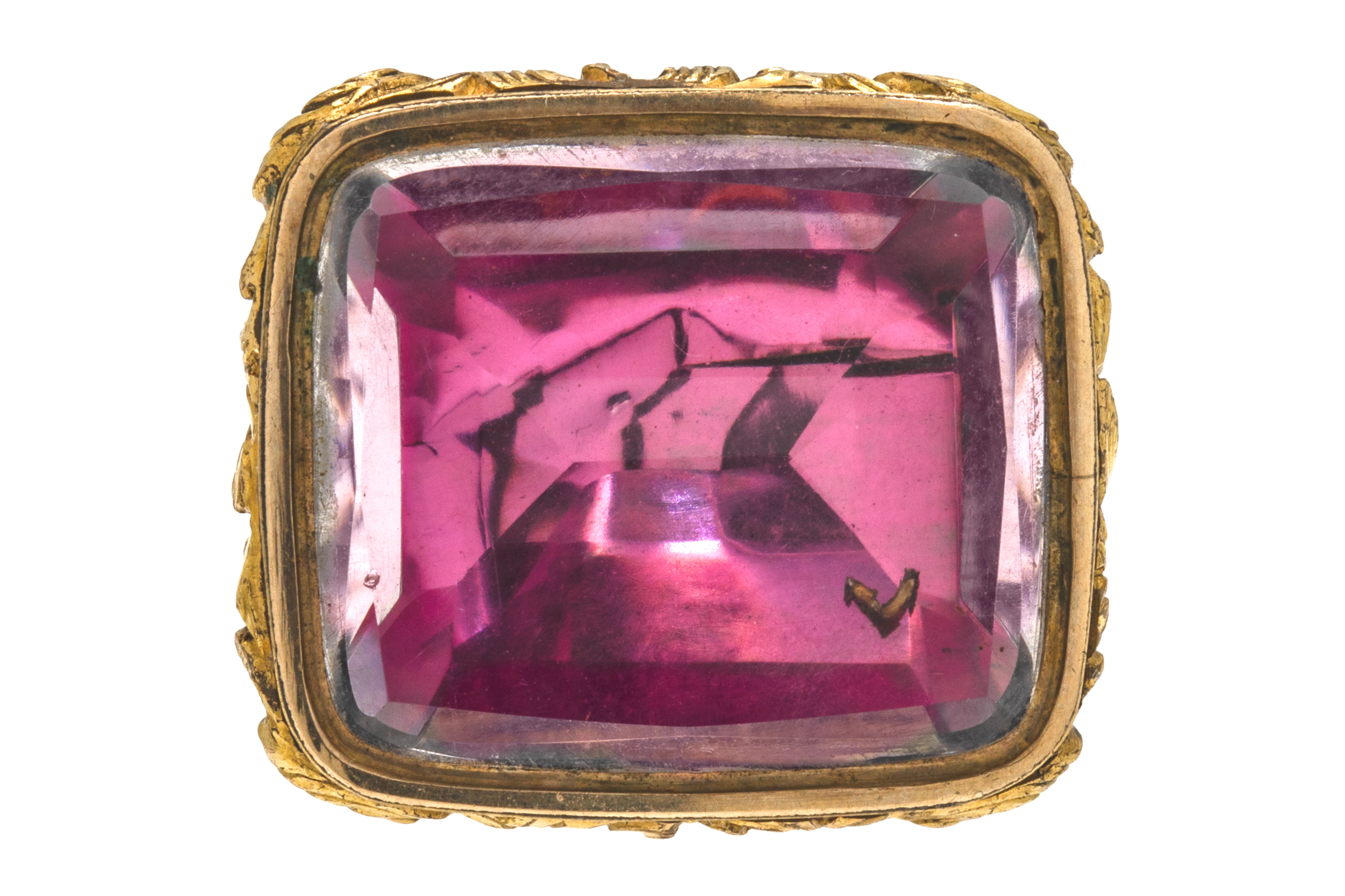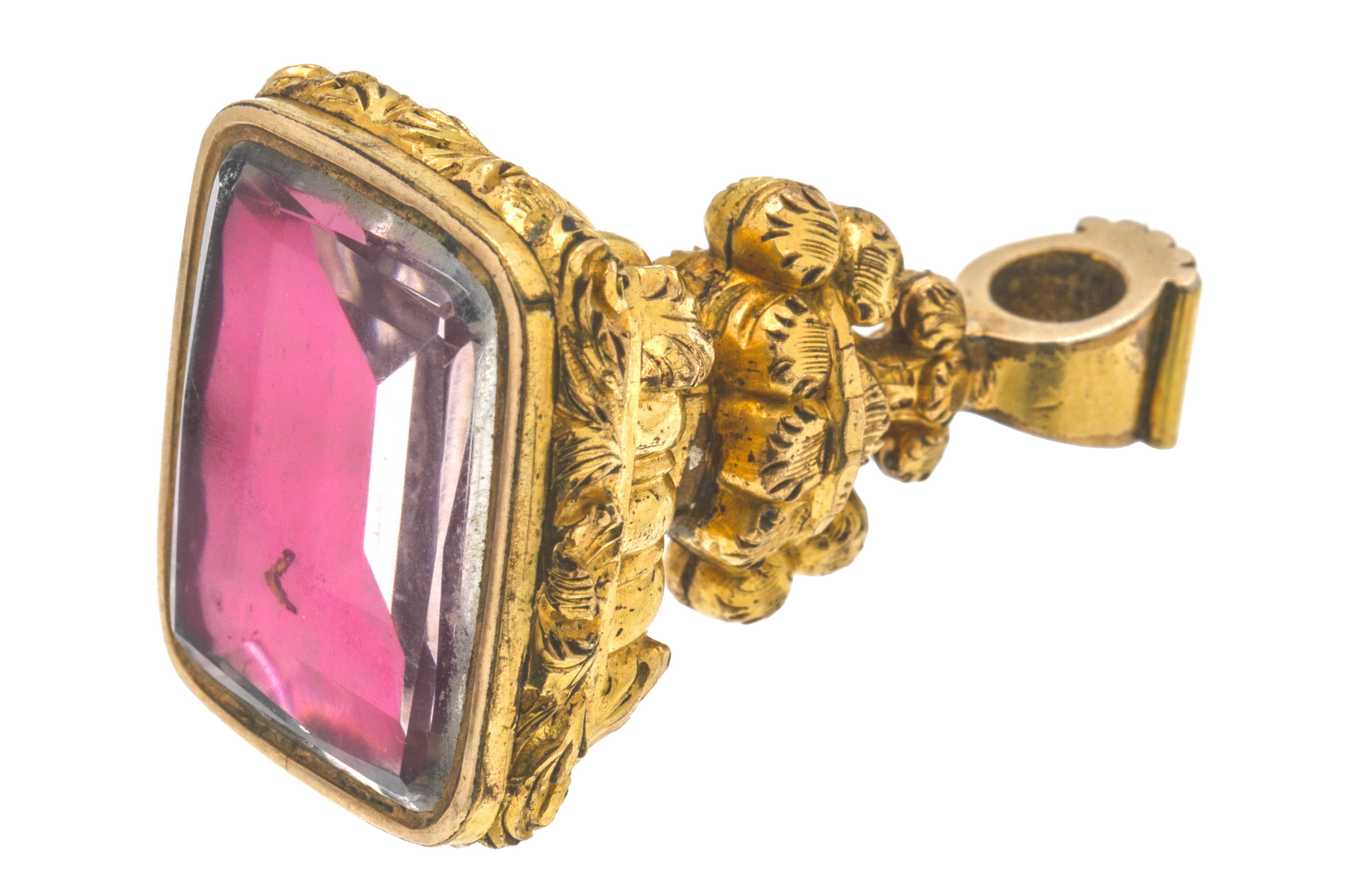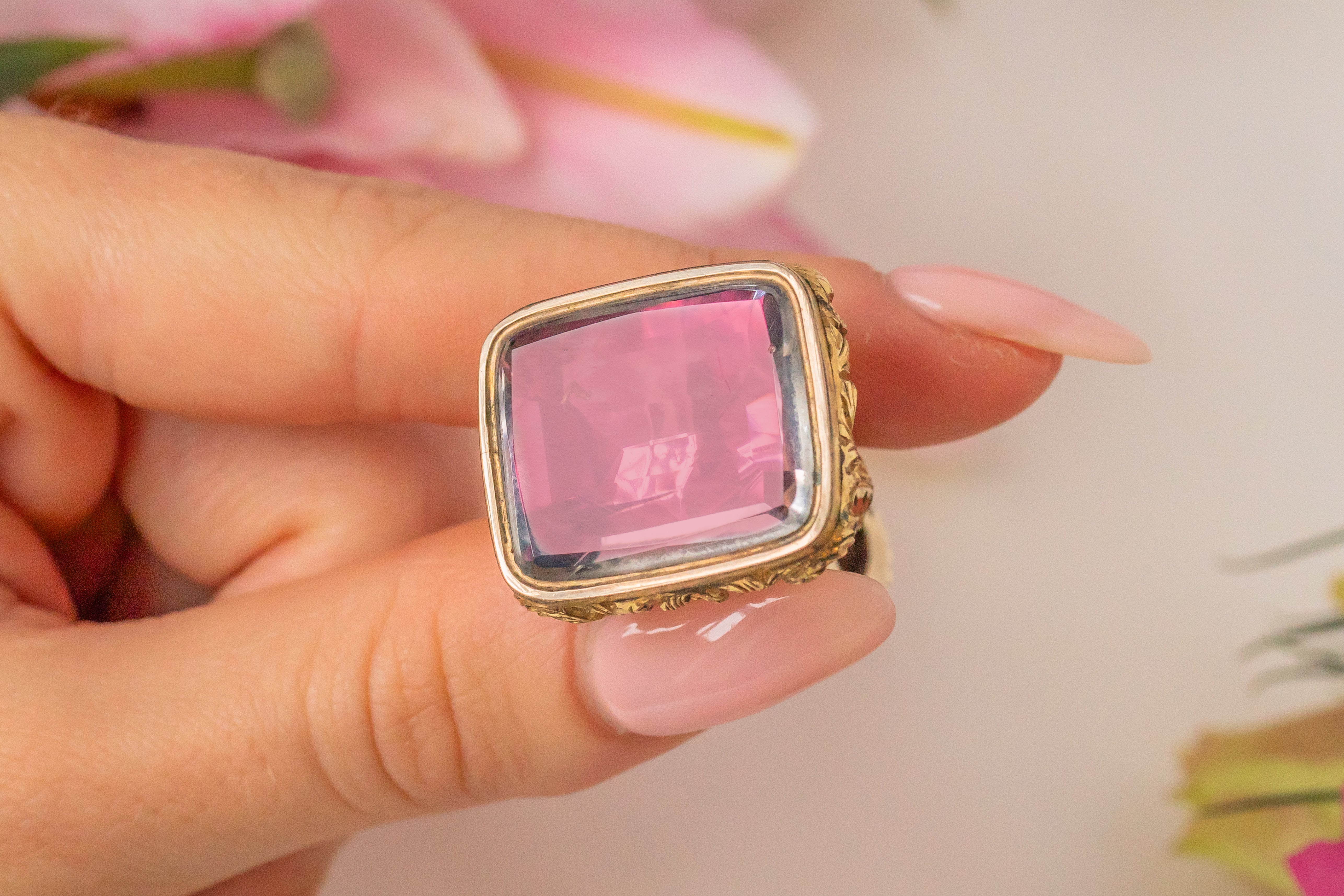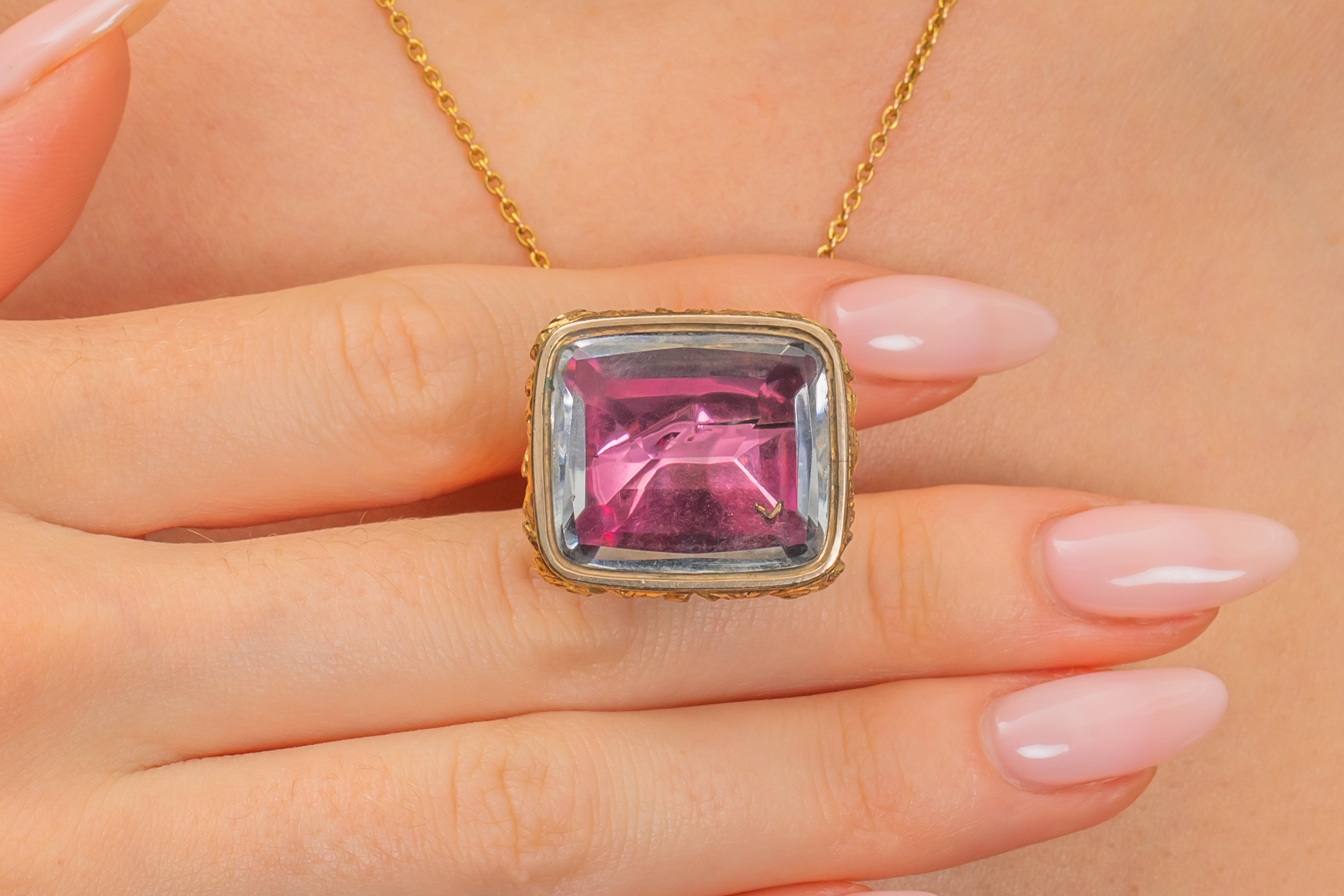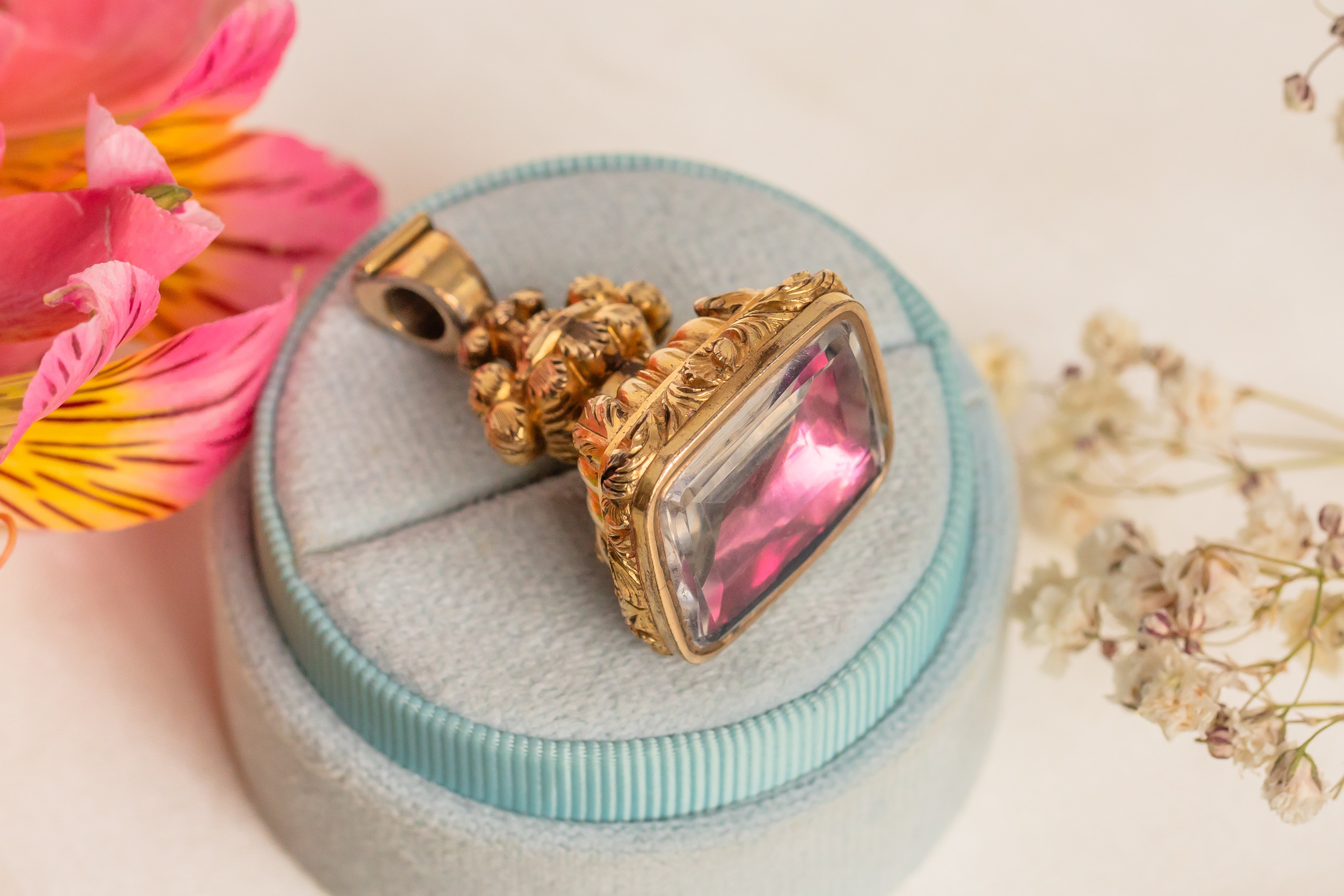 VERY GOOD: This antique foiled Rock Crystal fob pendant is in great condition. Parts of the pillar have worn a little, but overall it still possesses great shine and colour. The Rock Crystal is secure in its settings, free from chips or scratches, and the foiling is completely intact - giving you a bold berry-hued flash when the light hits!