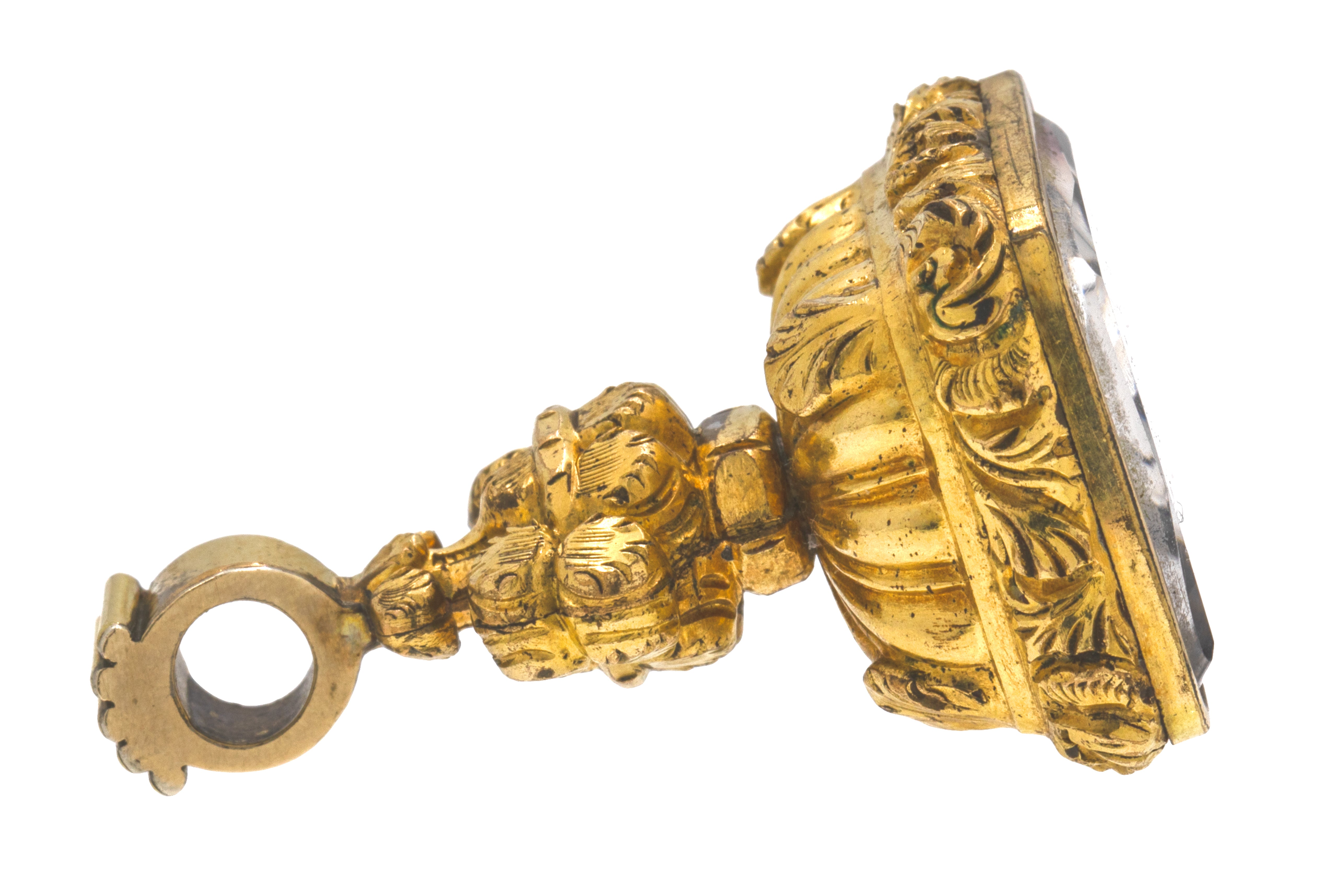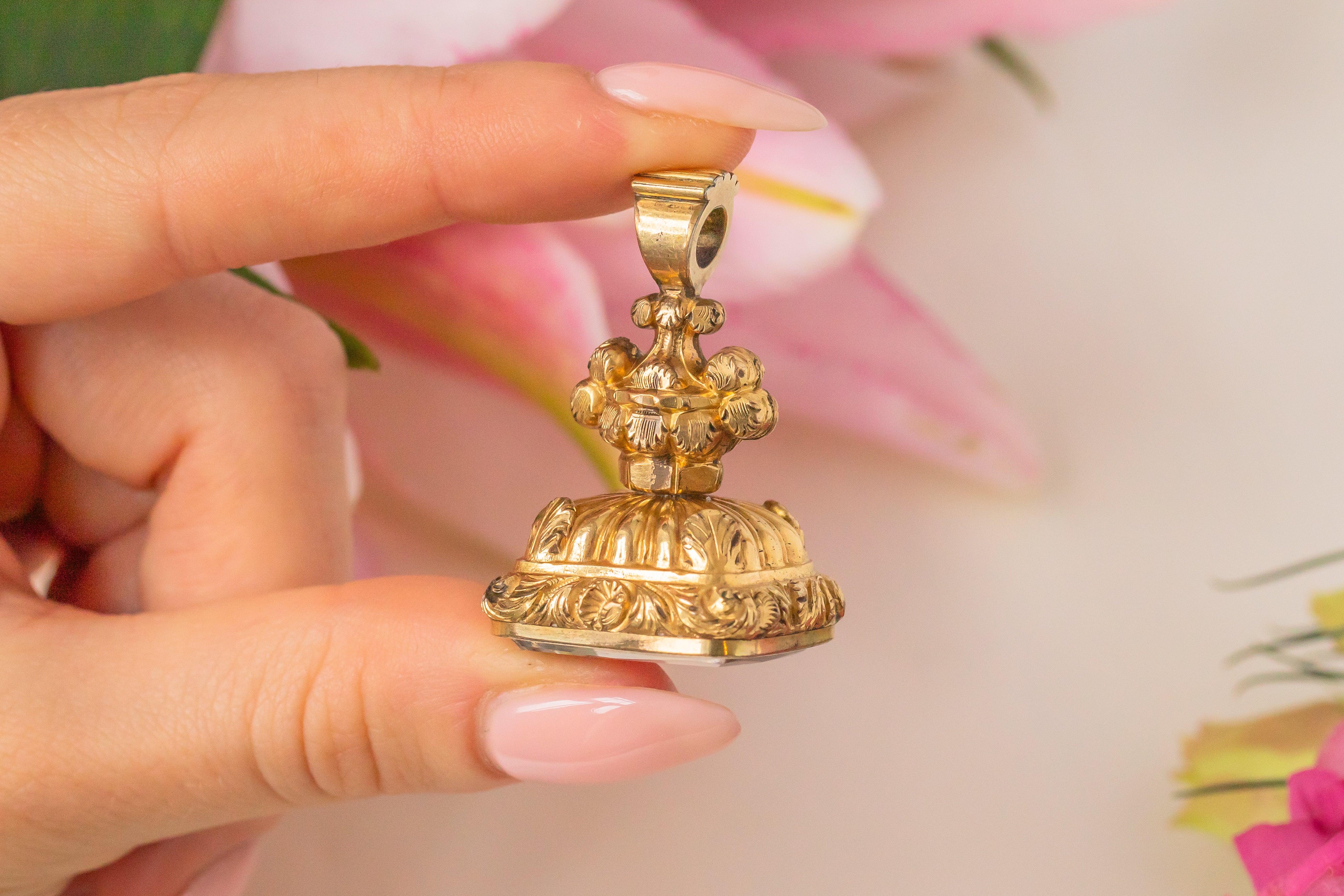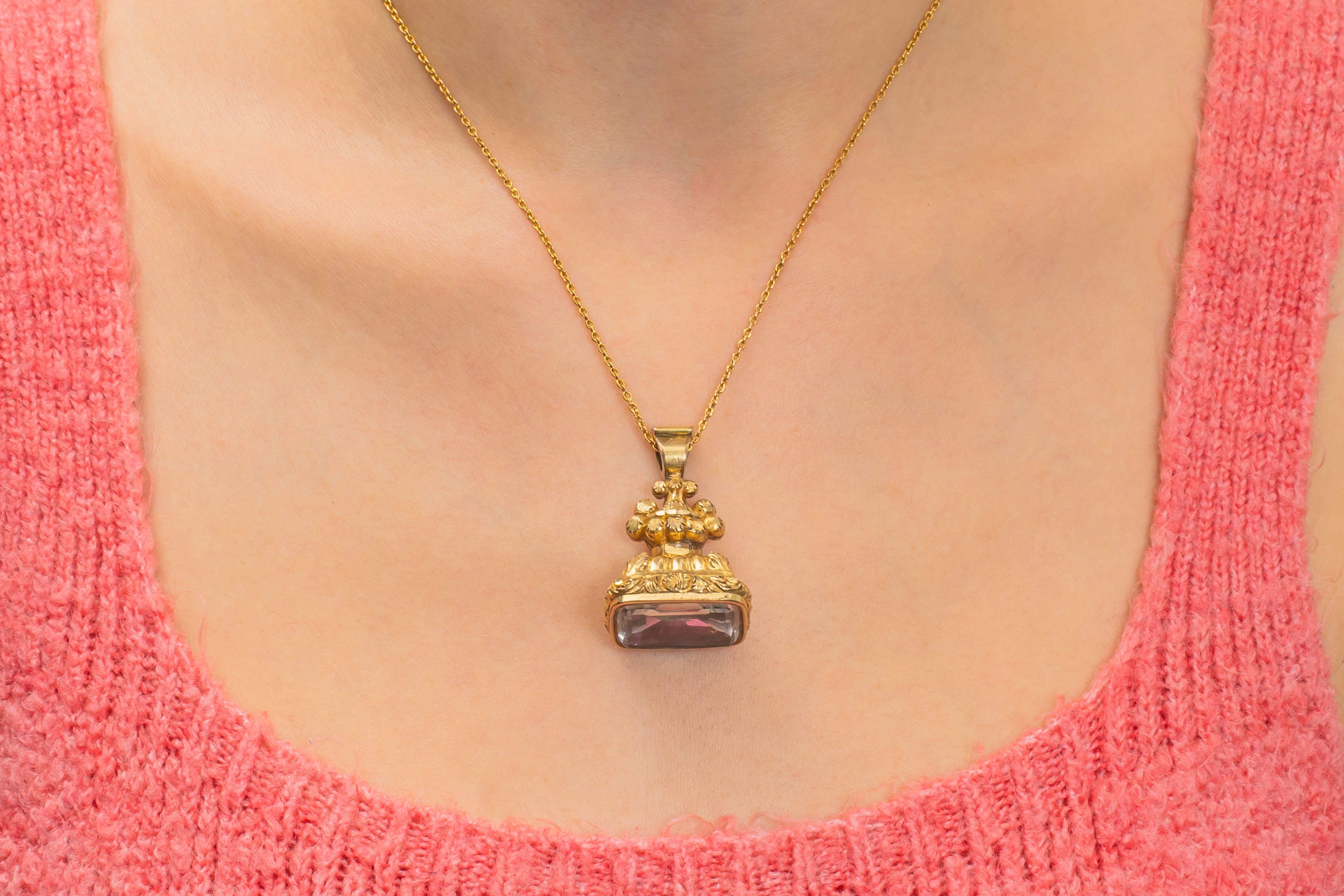 Every millimetre of this antique fob pendant has been well-thought-out, from the elaborate pillar to the repoussé acanthus leaves. Her 19.80ct Rock Crystal centre has a distinctive magenta foiled back, showcasing her incredible clarity and giving this fine fob further depth. Steeped in Victorian charm, she would make a striking statement suspended from an antique Gold chain!