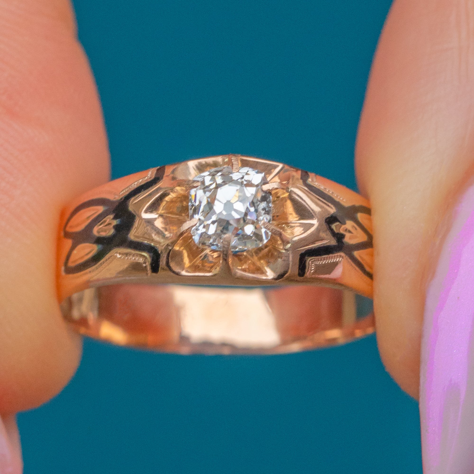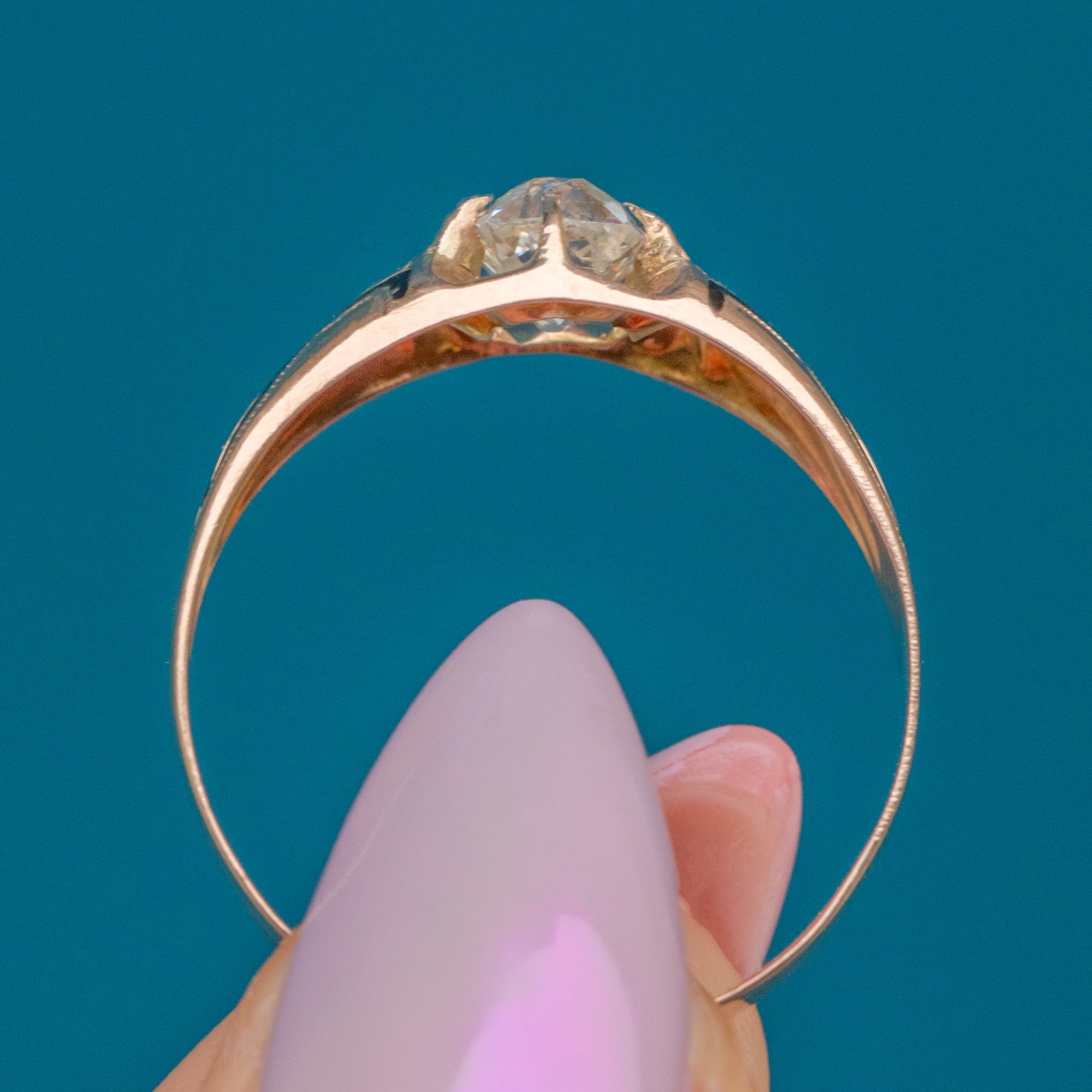 Cirda 1860, this exquisite French Victorian ring is crafted in 15ct Gold and set with a bright 0.35ct rare Peruzzi-Cut Diamond. One of the most legendary and sought-after antique cuts in the world of Diamonds, the so-called 'Peruzzi' cut, is credited to a Venetian lapidary named Vincenzo Peruzzi during the 1600's. The distinctive Diamond sits proudly in a beautifully hand-carved buttercup setting, flanked by fine black Enamel details that add depth and drama to the design.