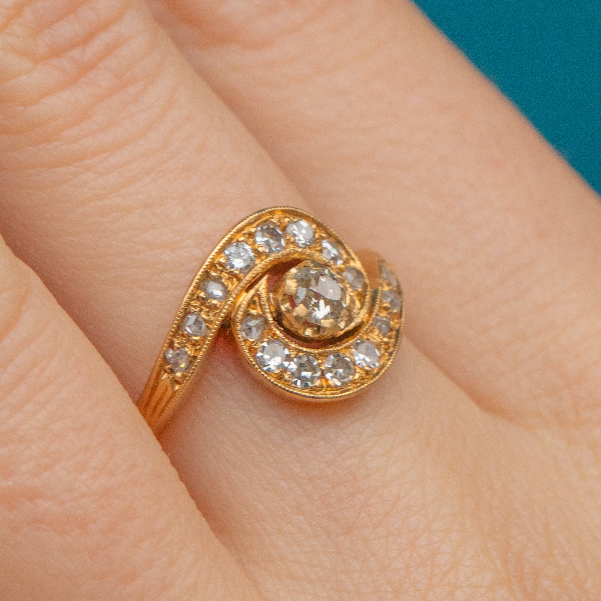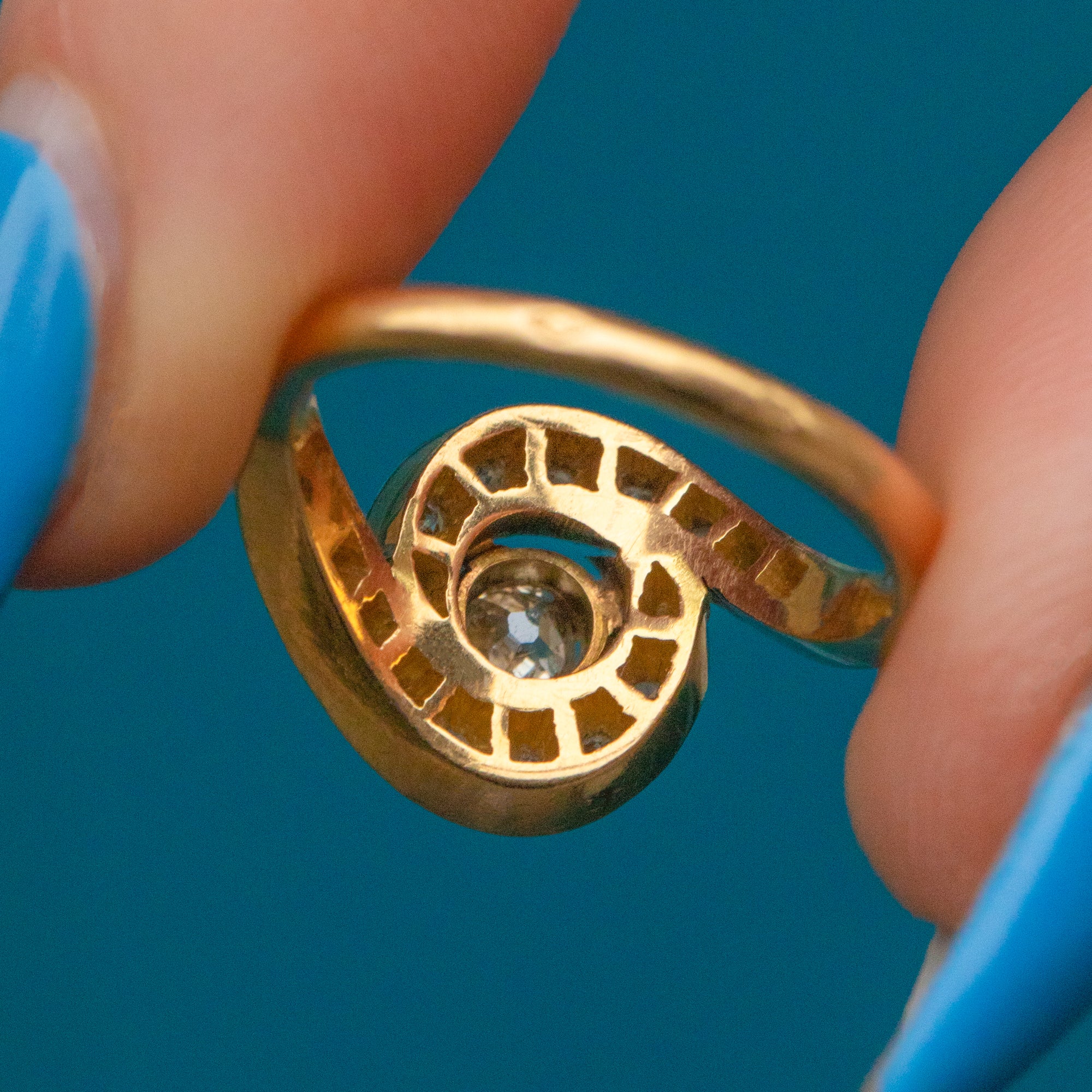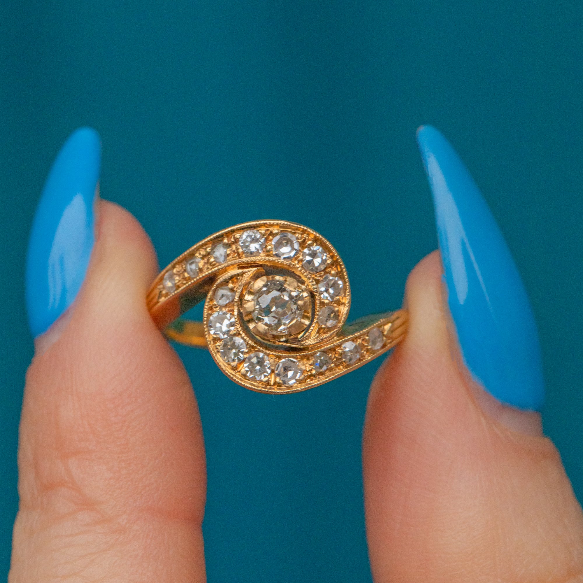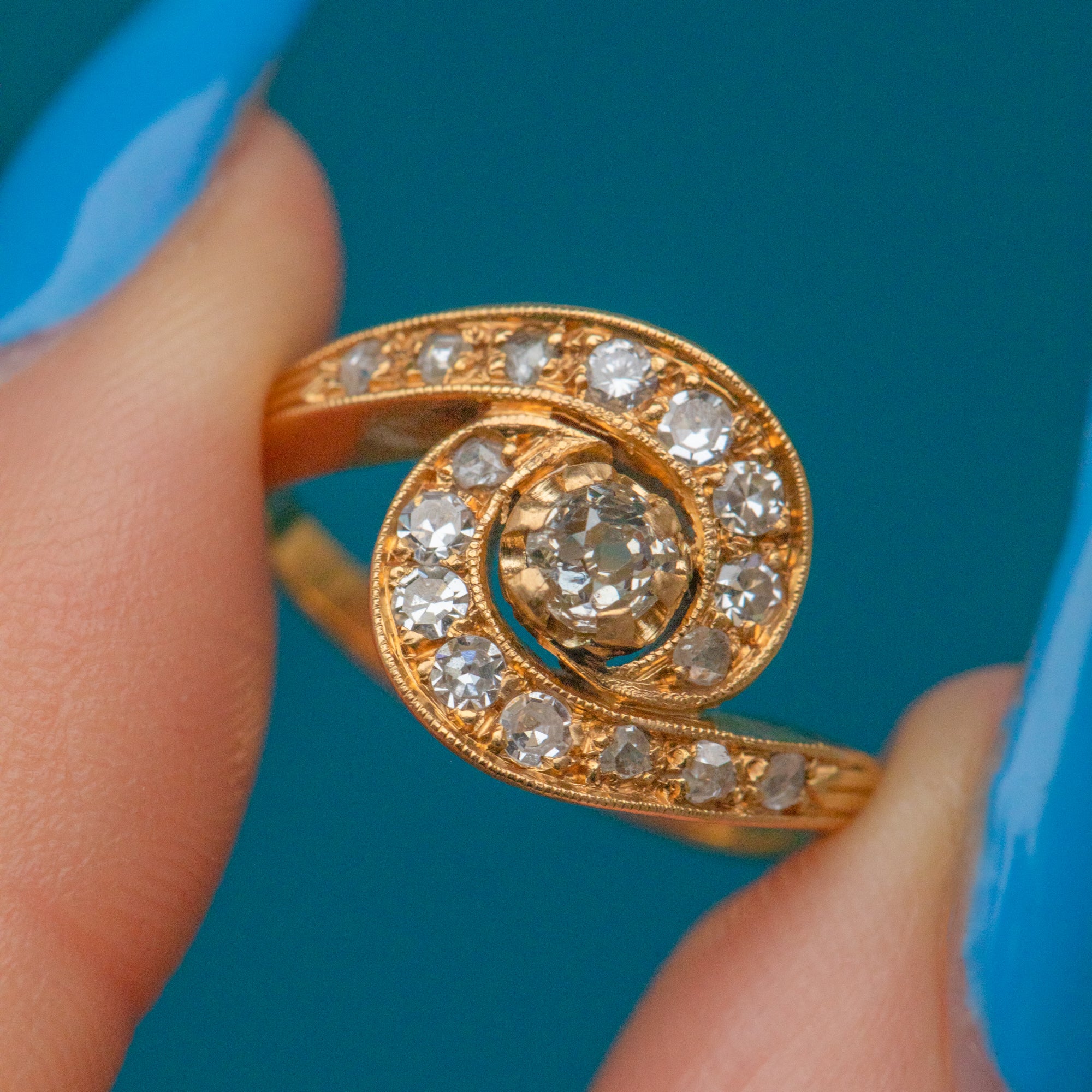 We adore this antique French 18ct Gold Diamond Tourbillon ring! This Diamond cluster has been crafted to perfection, with a central old-mine cut Diamond weighing a whopping 0.17ct.