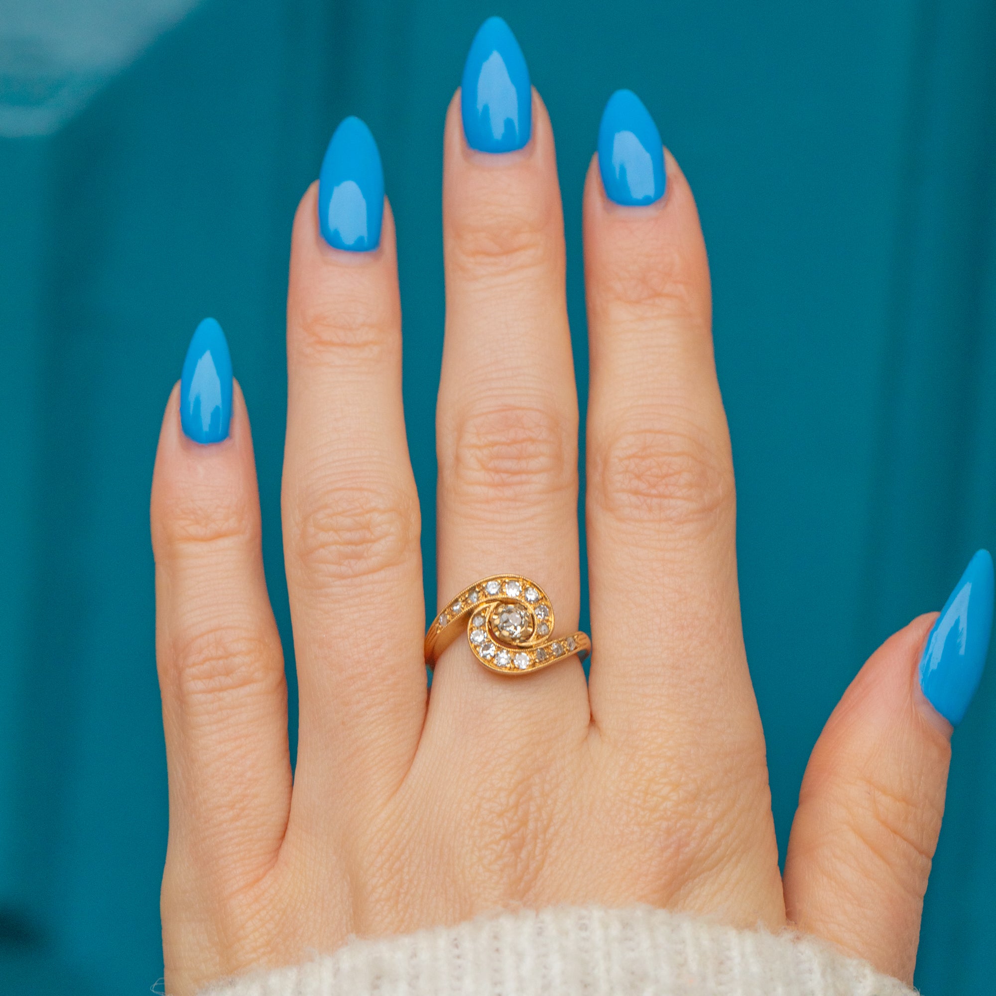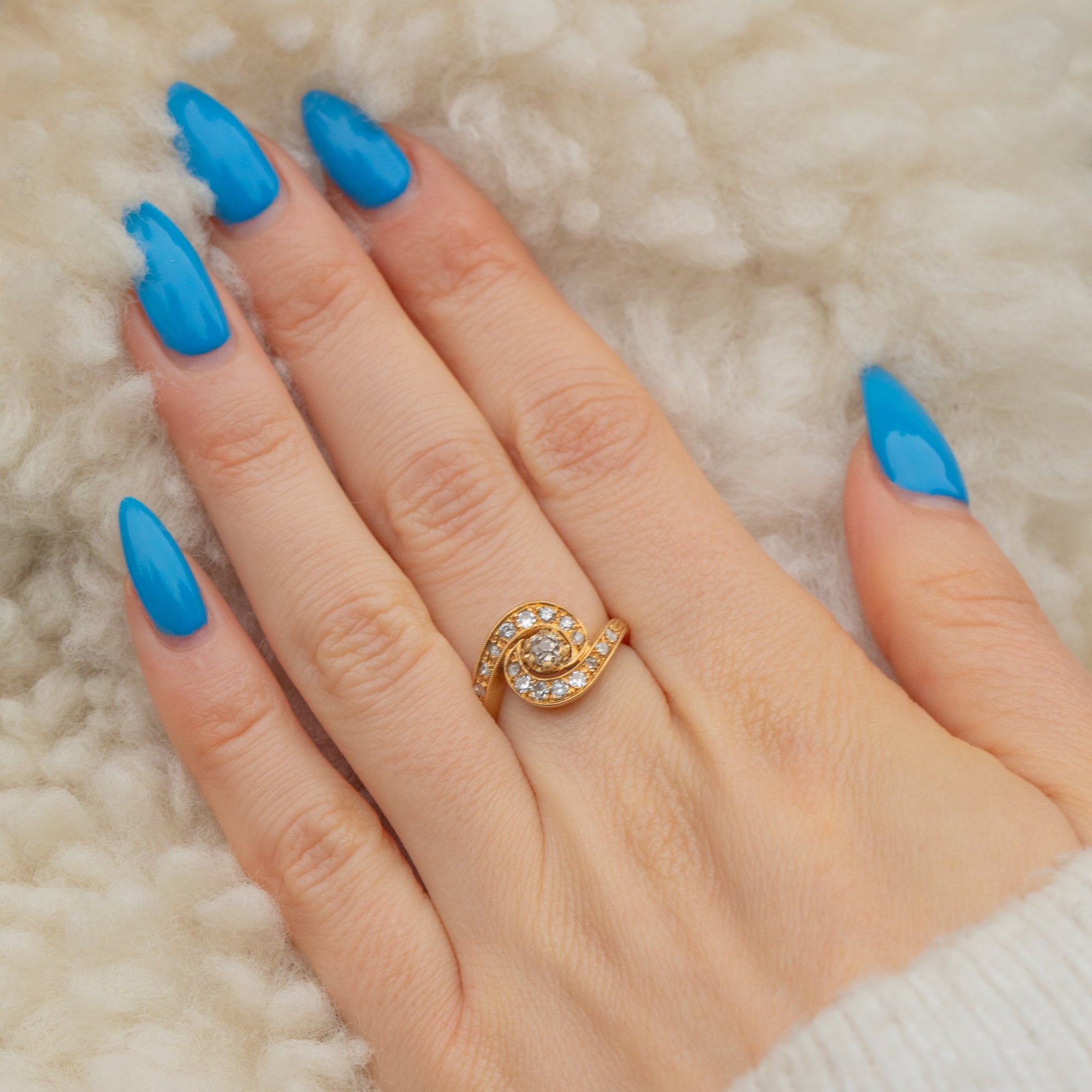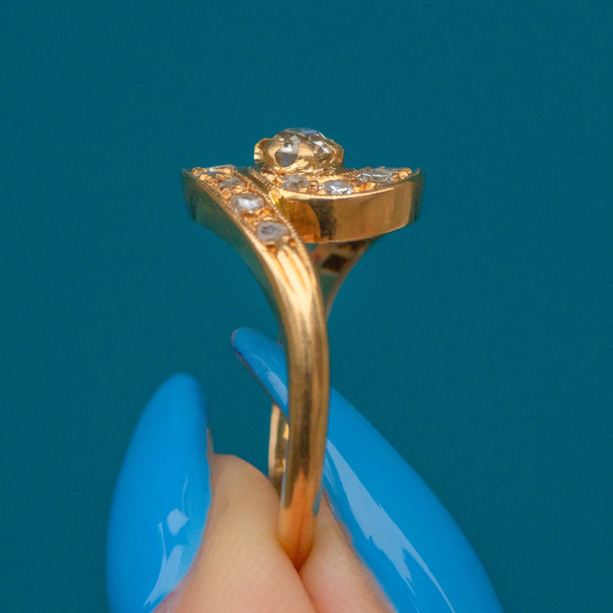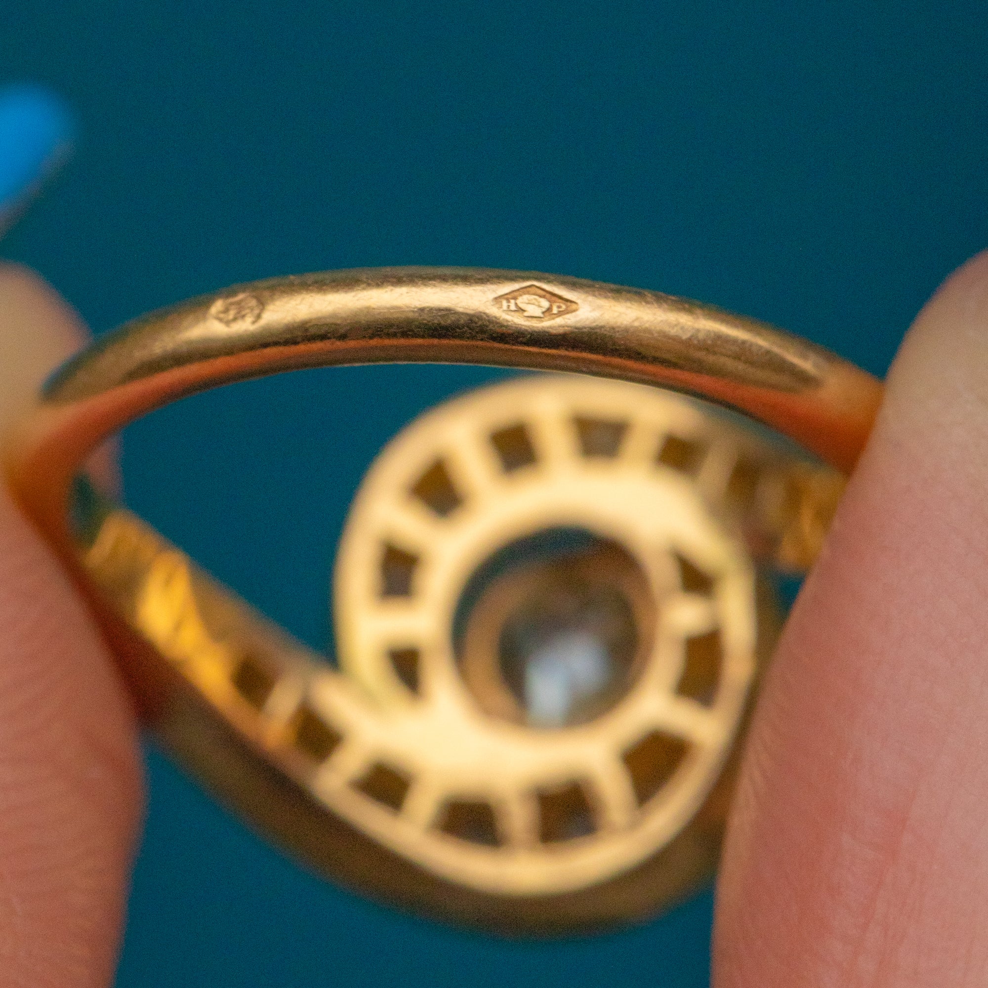 We adore this antique French 18ct Gold Diamond Tourbillon ring! This Diamond cluster has been crafted to perfection, with a central old-mine cut Diamond weighing a whopping 0.17ct.
