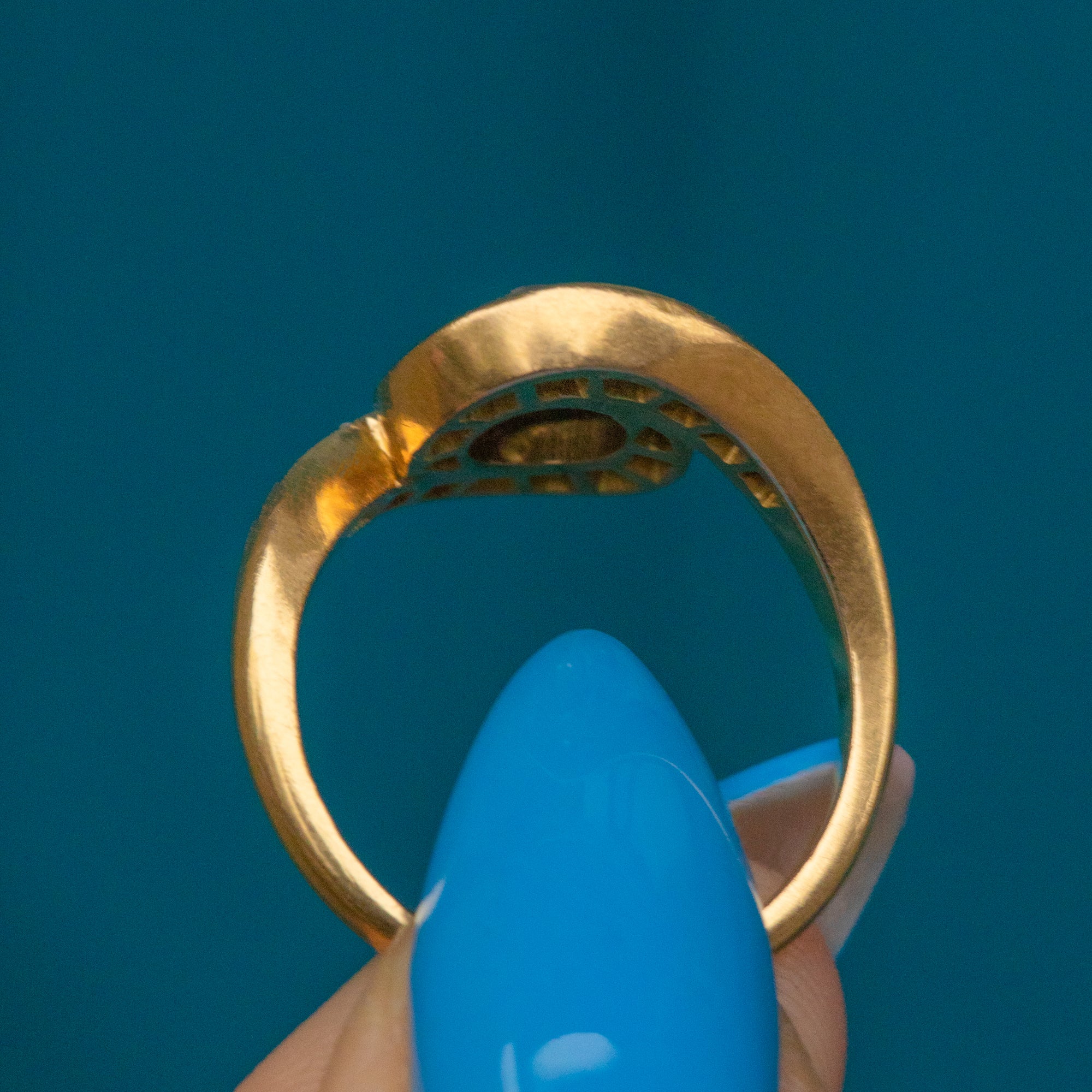 EXCELLENT. This antique French 18ct Gold Diamond tourbillon ring is in excellent condition! This ring has a lovely selection of Diamonds, all secure and sparkling beautifully. The French Eagles head stamp is crisp and the Gold is brightly saturated with no visible surface wear.