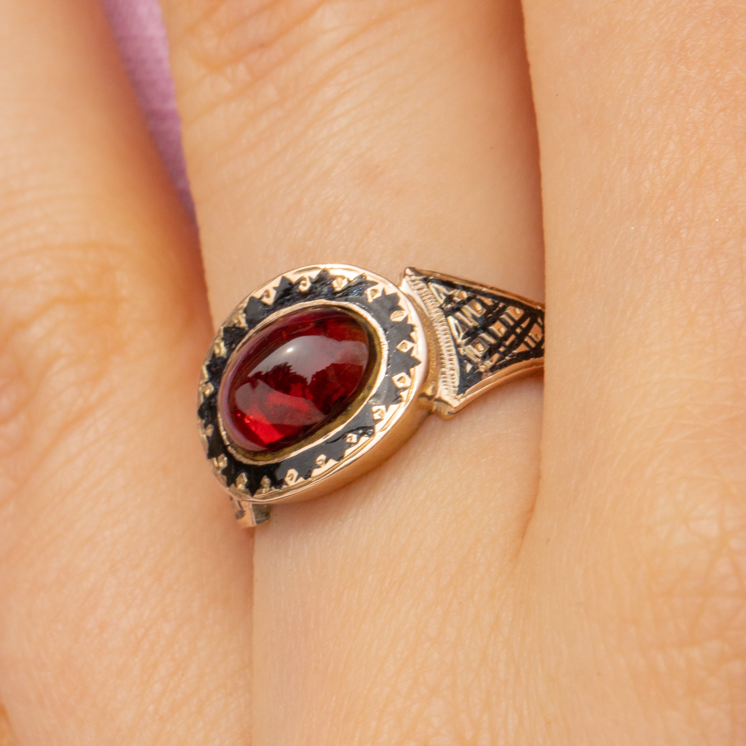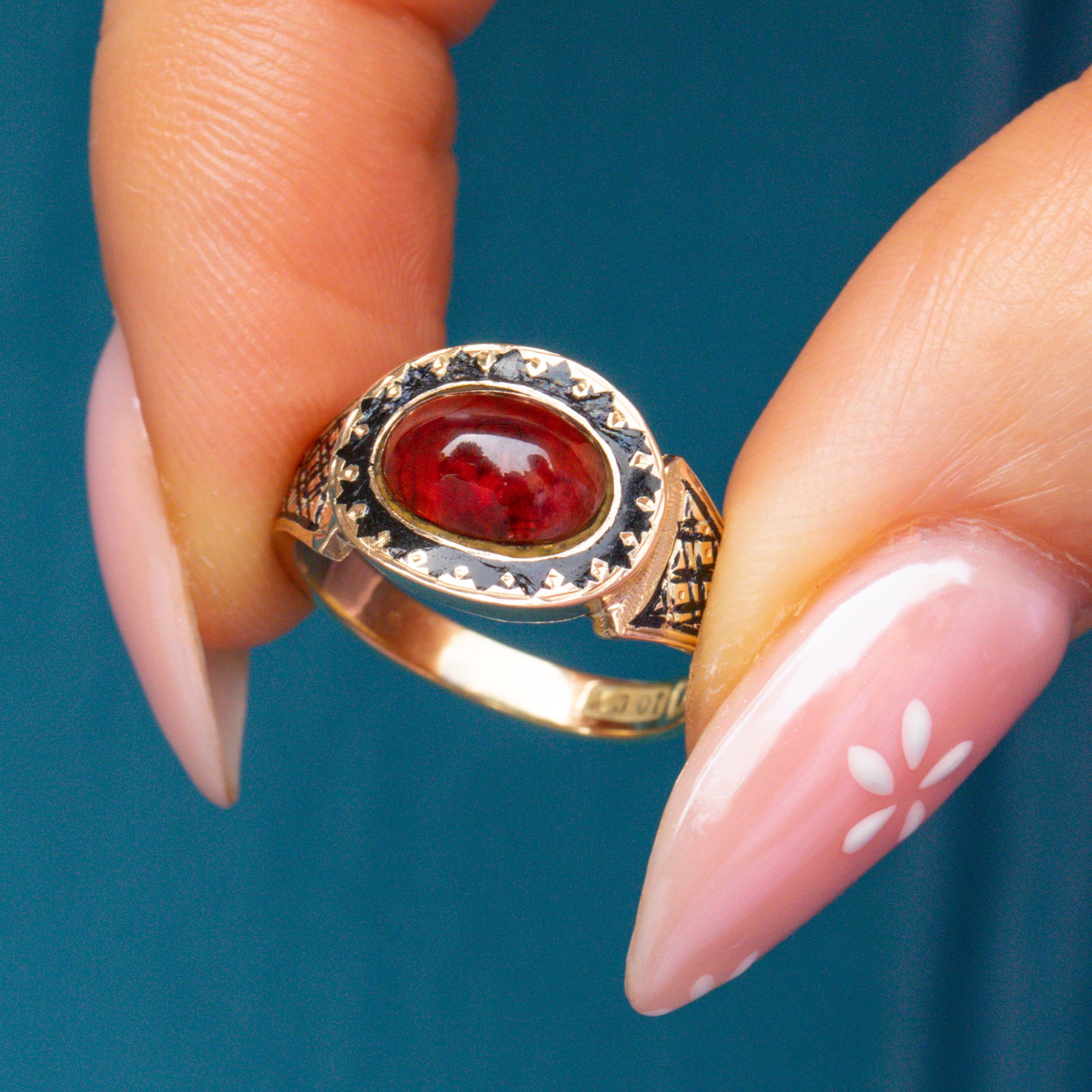 EXCELLENT. This antique 10ct Gold Garnet cabochon & black Enamel ring is in excellent condition! The Gold is buttery throughout and the band has retained its rounded form well, with nice clear stamps on the inside. The Garnet is smoothly domed and securely set, free from chips or abrasions and the Enamel is pristine with no wear to note. This superb piece of Victorian will make a fine addition to any antique jewellery collection!