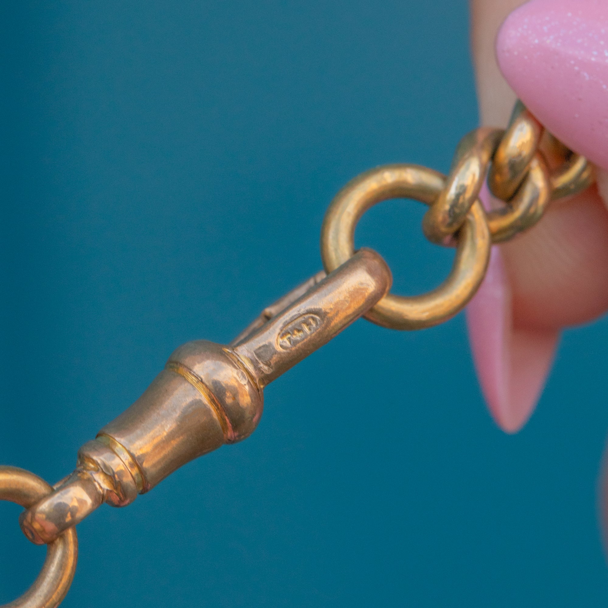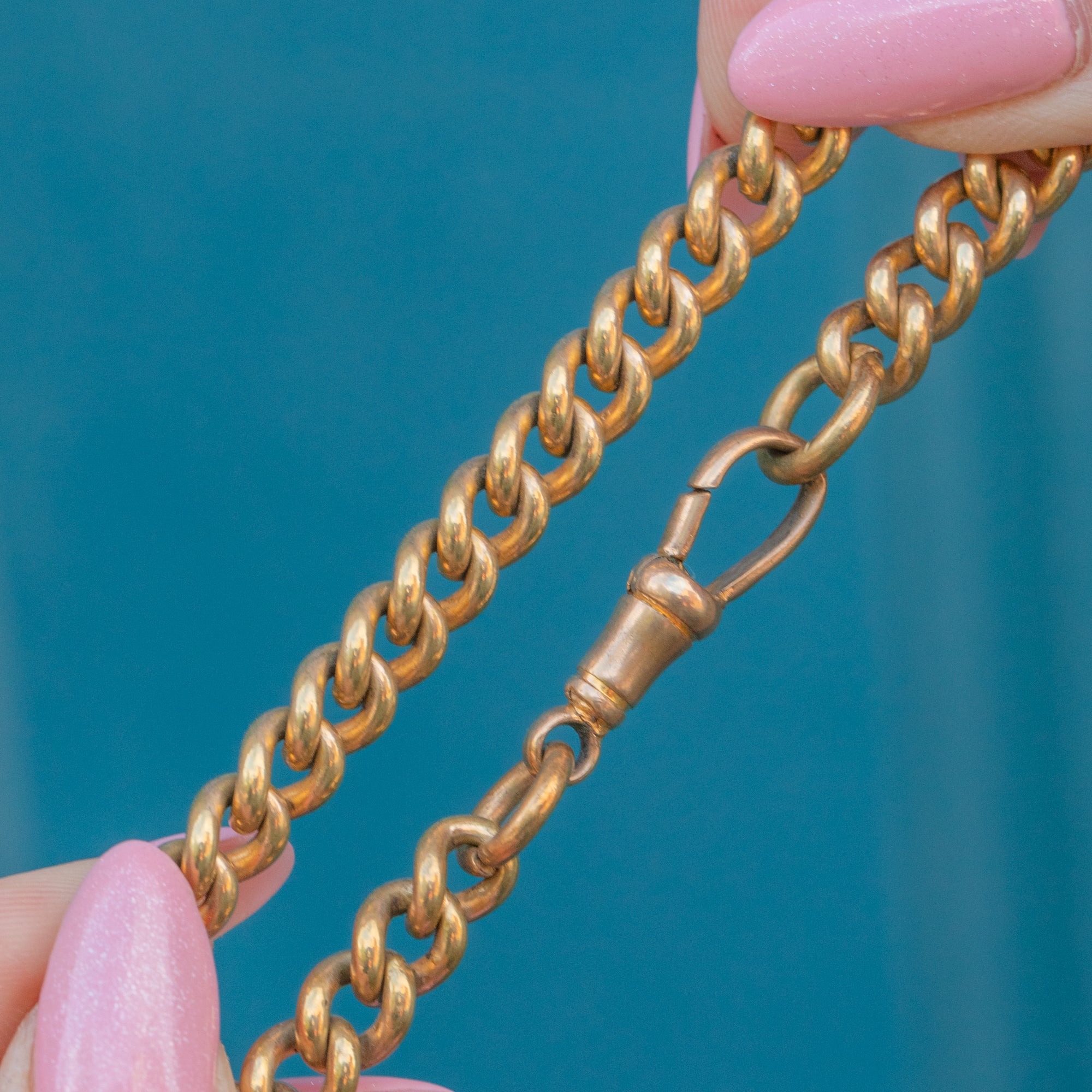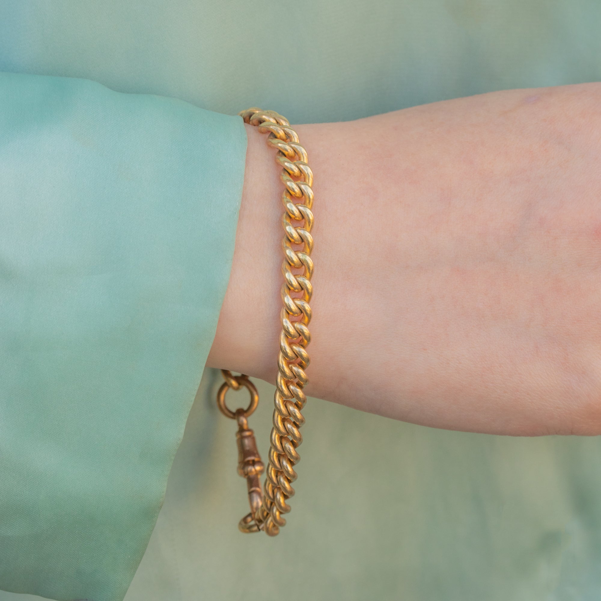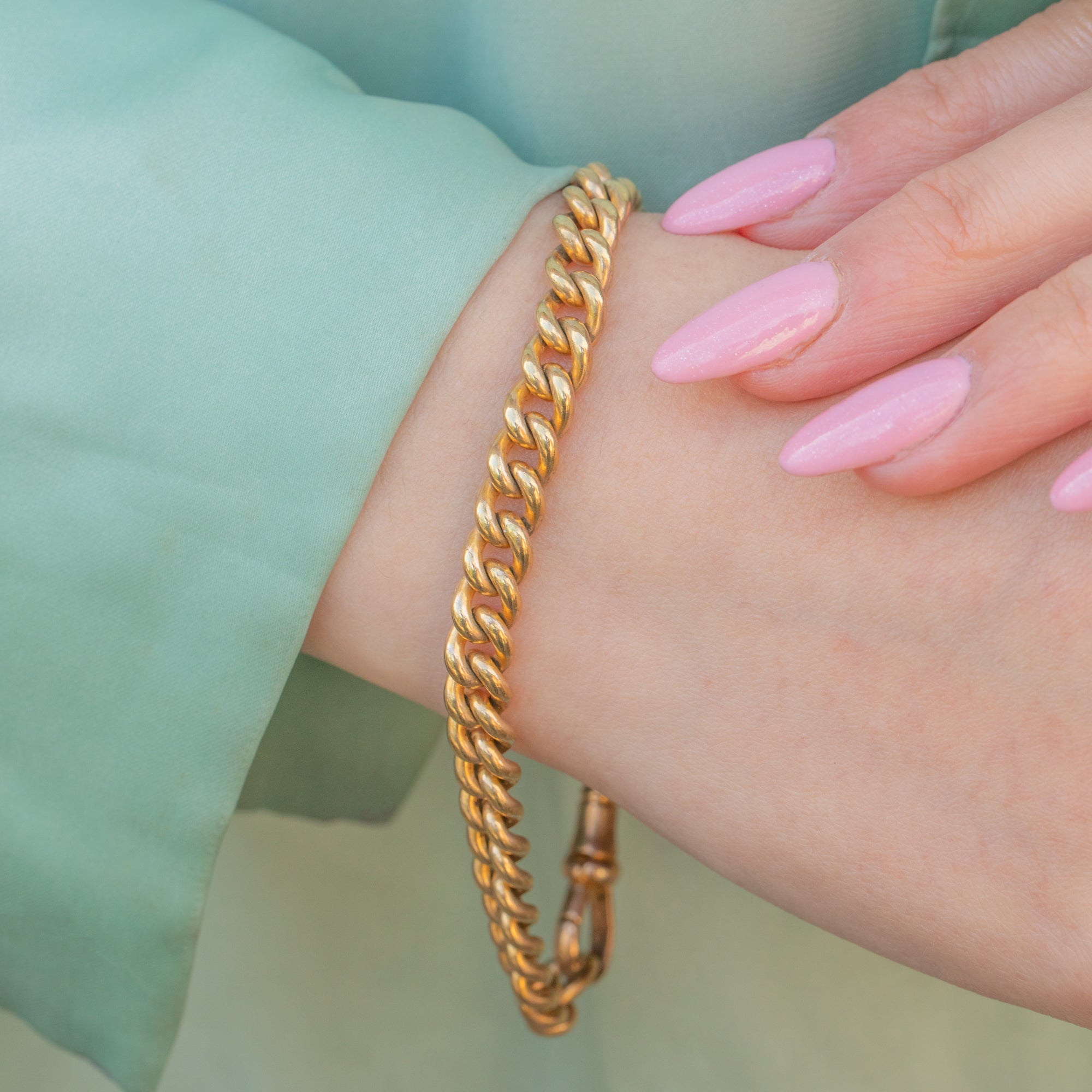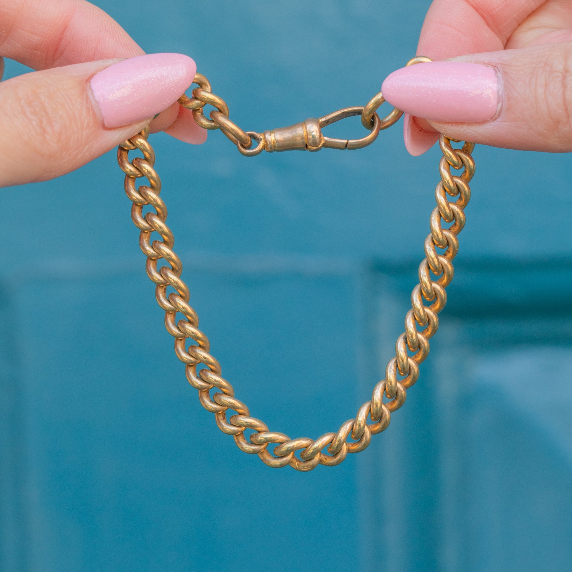 VERY GOOD. This antique Gold toned curb link bracelet is in very good condition! The links are secure, the dog-clip is in perfect working order and you can wear the bracelet confidently. The Gold tone has lasted very well, only the dog-clip has some surface wear commensurate with age.