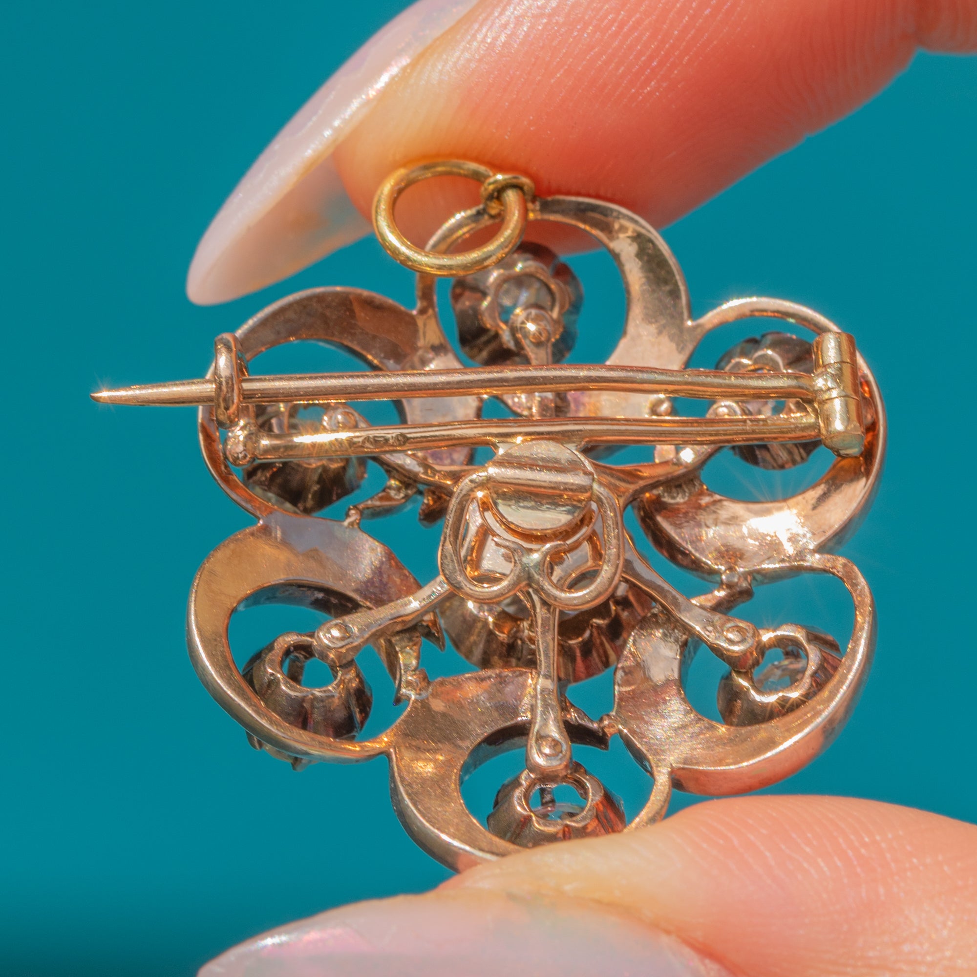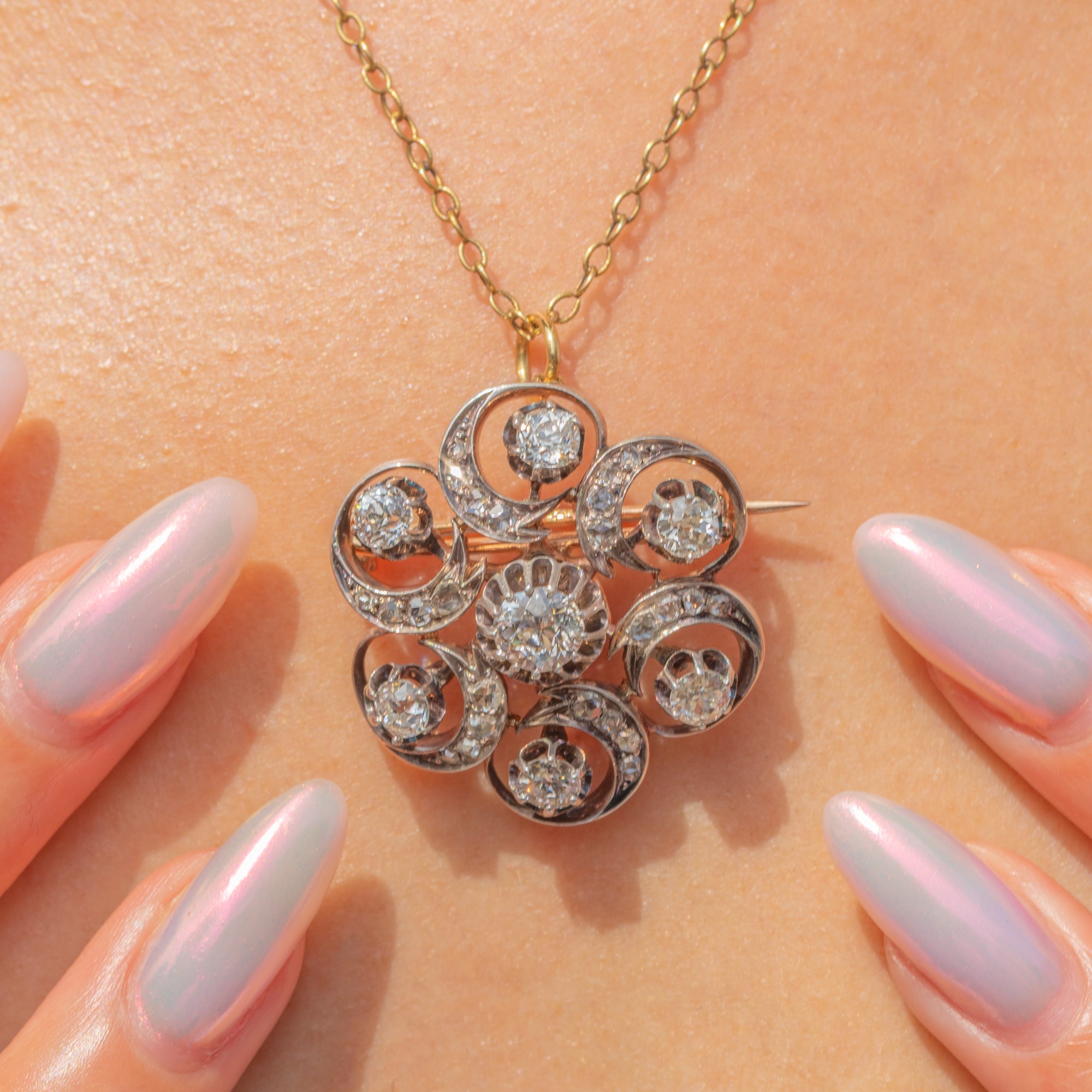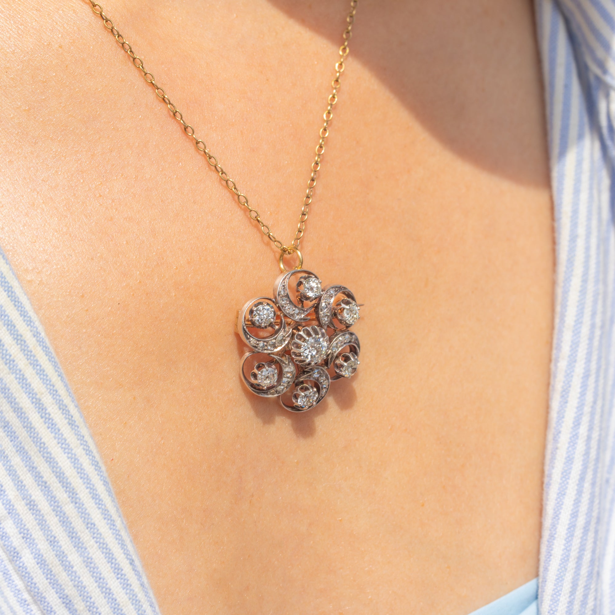 The Diamonds are all set within Silver swirls, providing the piece with a lovely fluidity and sense of movement. The pendant is backed with solid 18ct Gold and has removable brooch fittings, allowing you to style this antique Diamond pendant however you please!