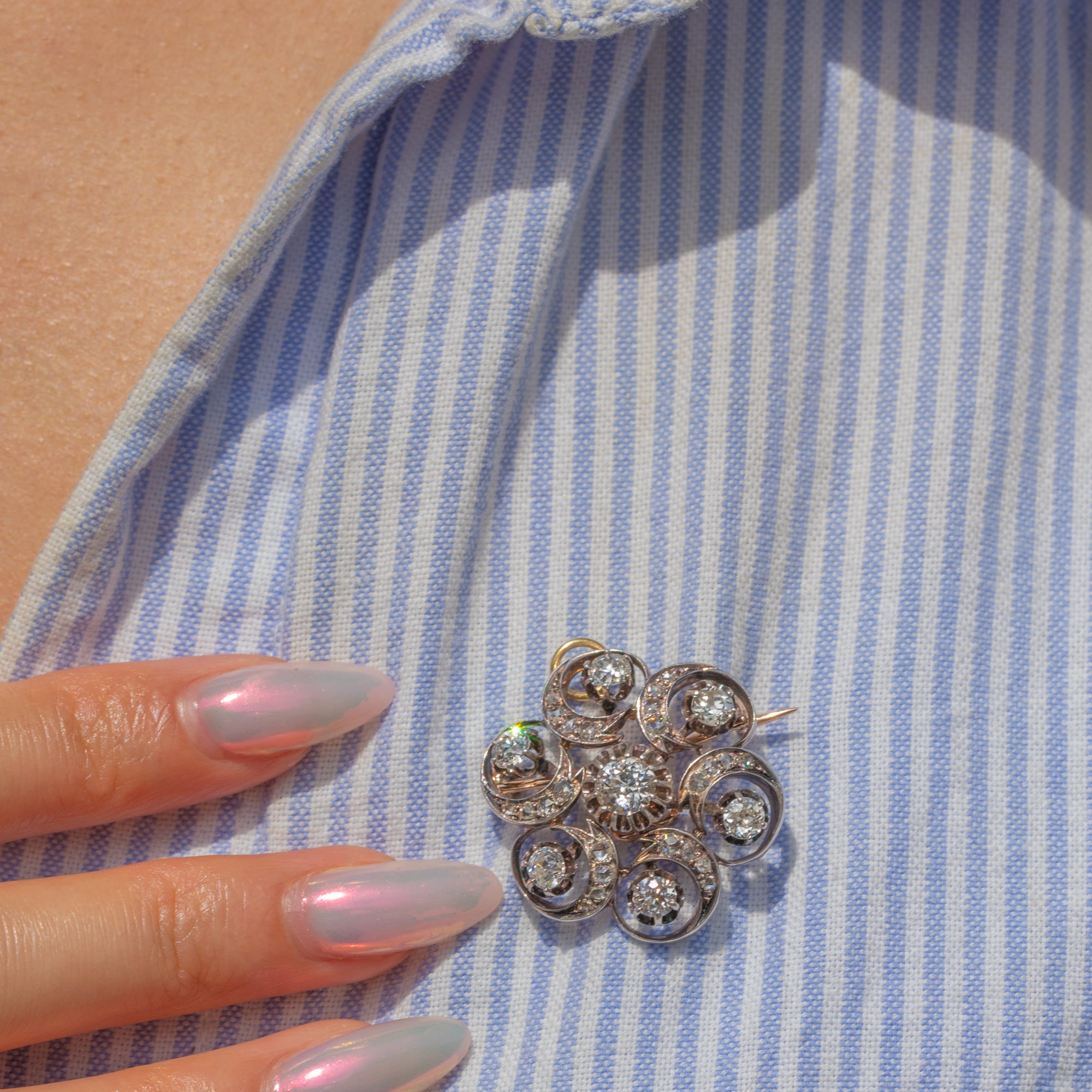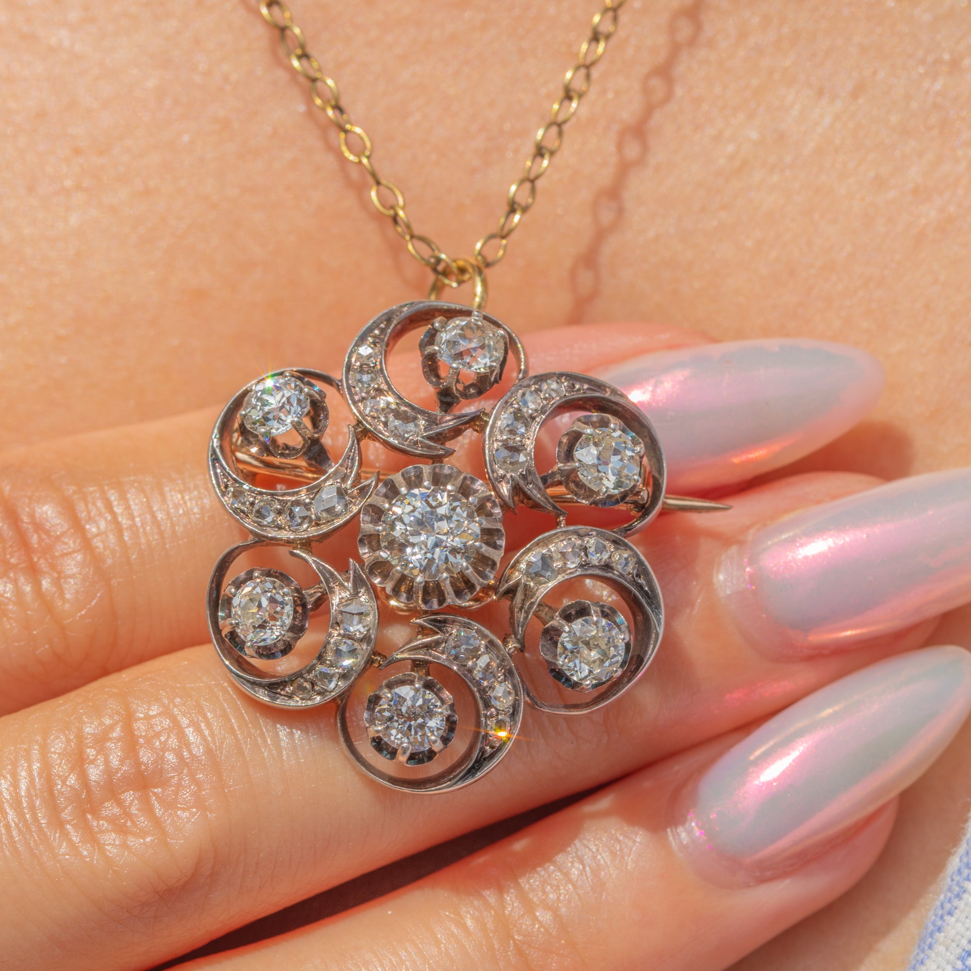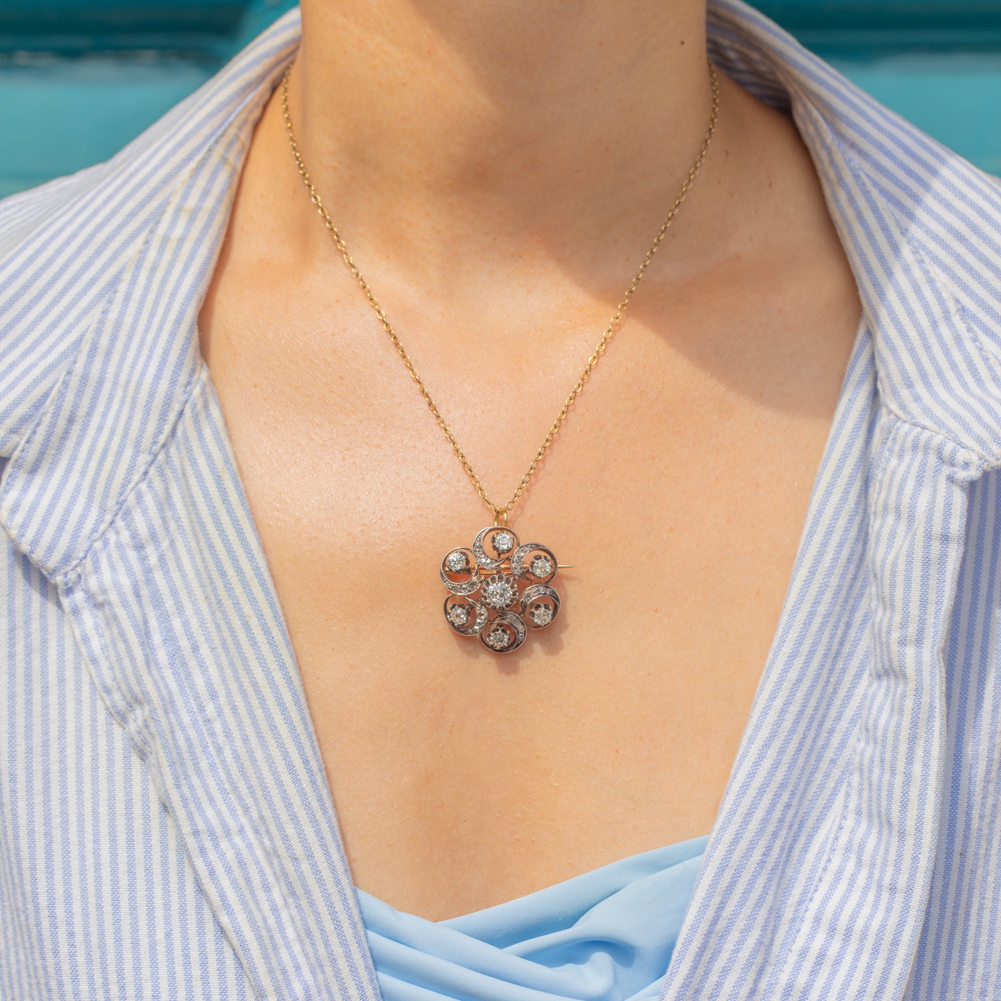 The Diamonds are all set within Silver swirls, providing the piece with a lovely fluidity and sense of movement. The pendant is backed with solid 18ct Gold and has removable brooch fittings, allowing you to style this antique Diamond pendant however you please!
