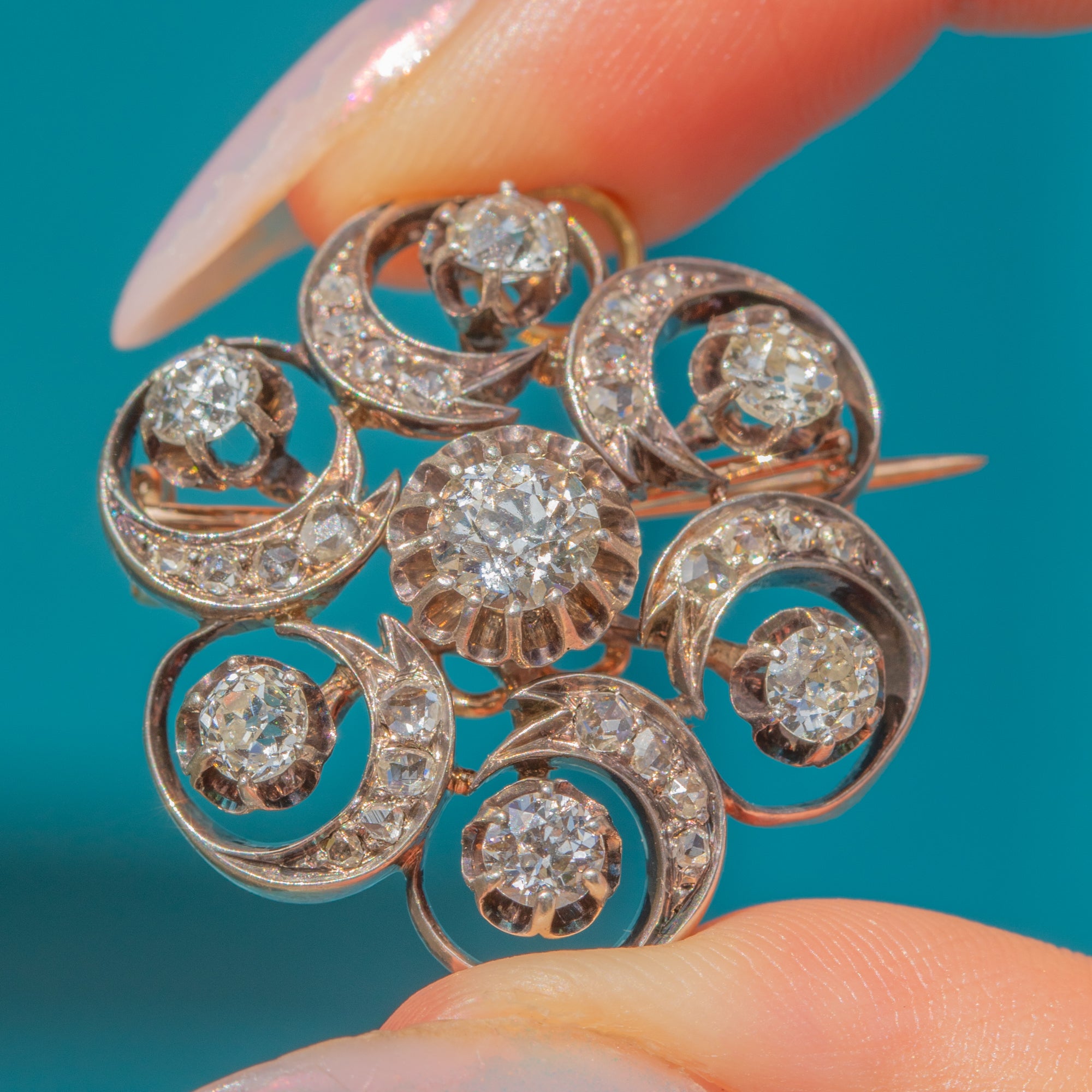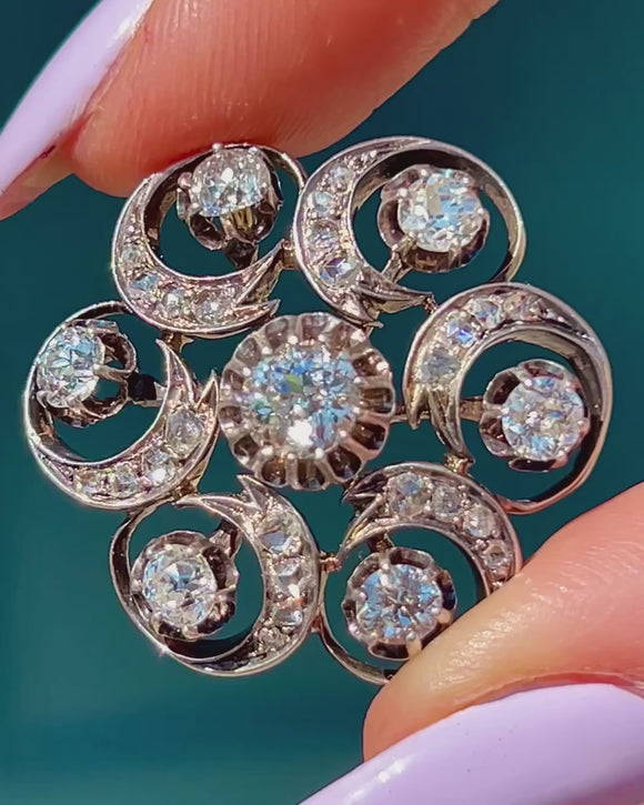 EXCELLENT: The 2.16cts of Diamonds are all amazingly bright, old European and rose-cut Diamonds, with chunky and gorgeous crisp facets and no abrasions or chips. All the components are in original condition, and the brooch fitting is in perfect working order.
