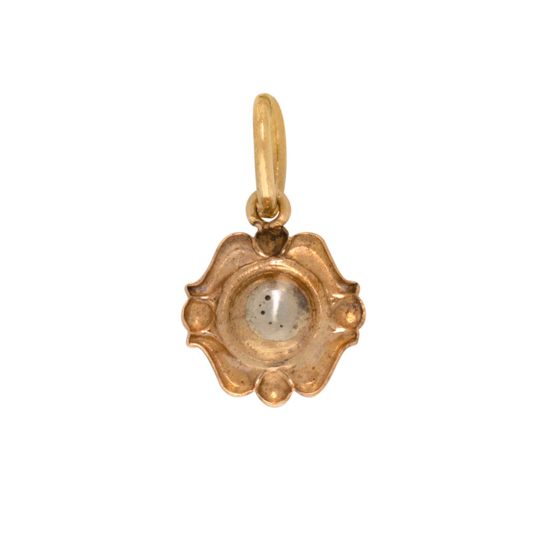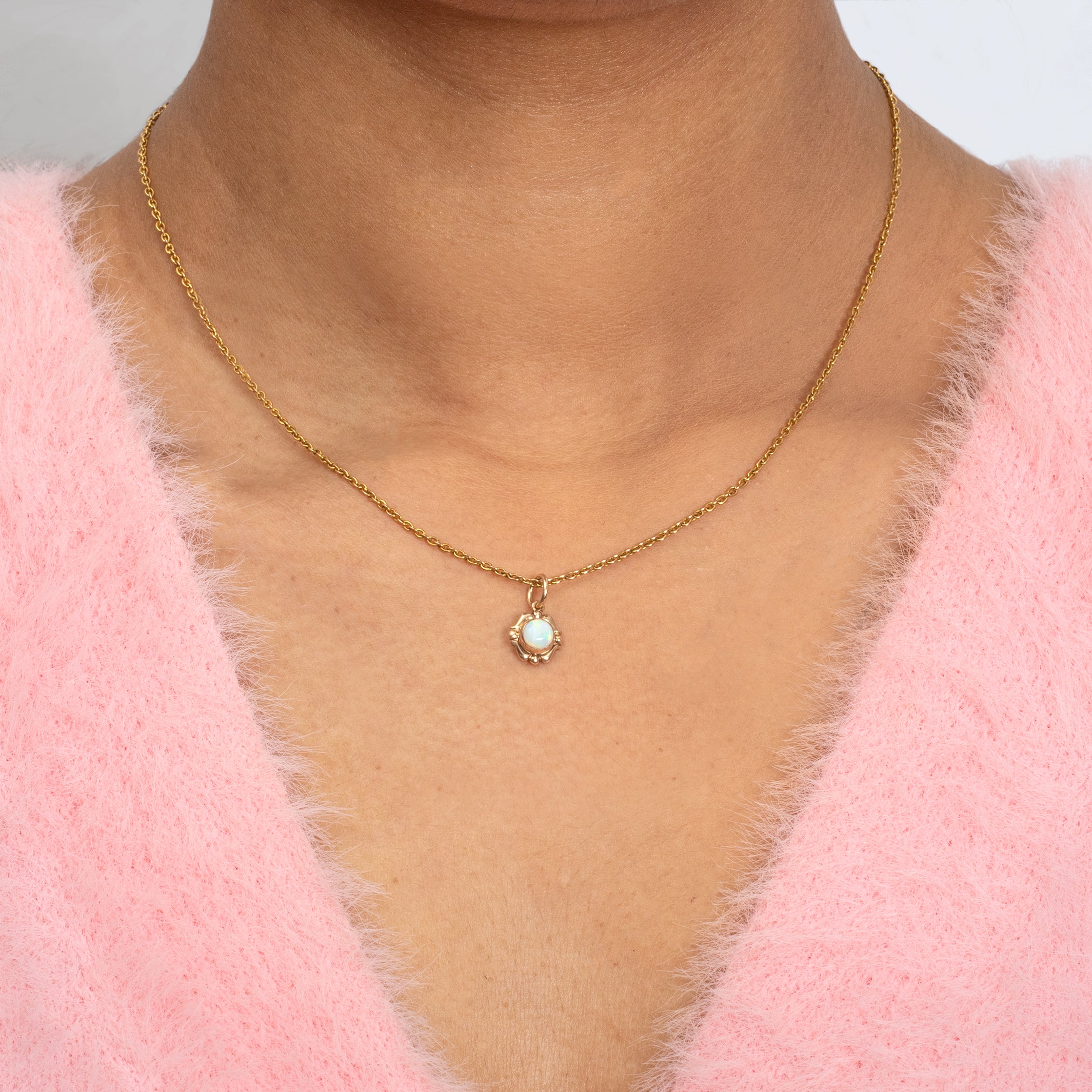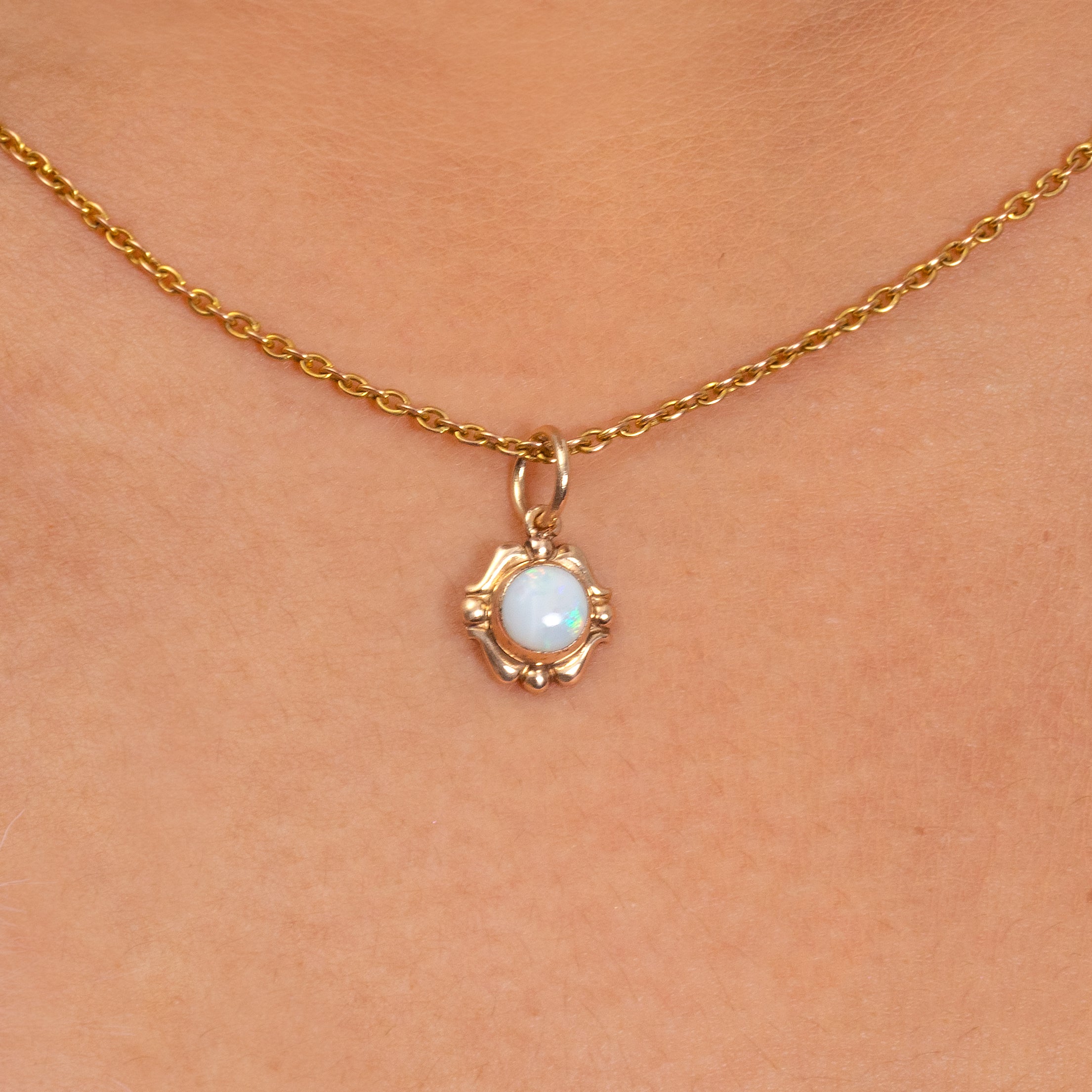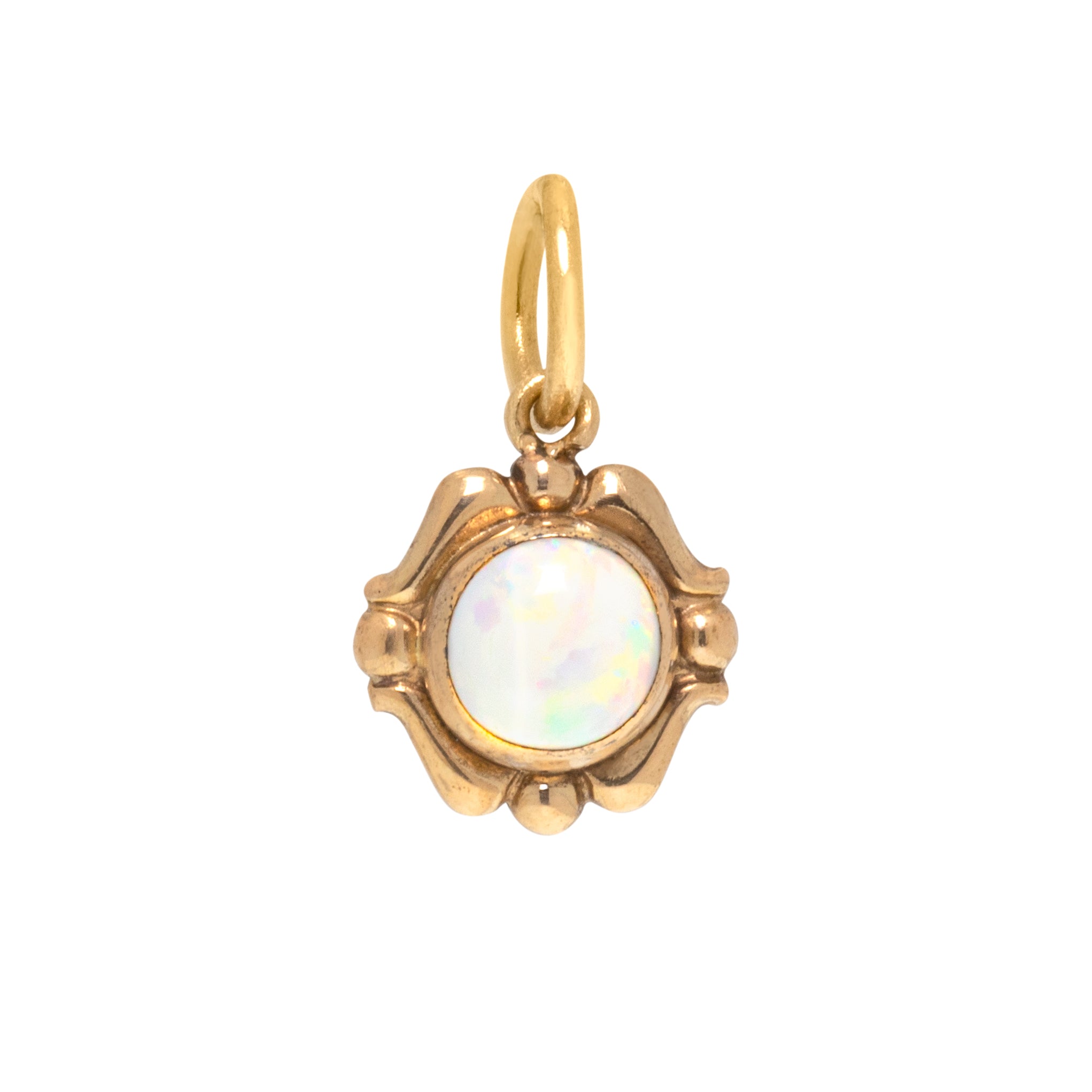Experience timeless elegance with this antique Opal charm. The Opal cabochon, with its mesmerising play of colours, will add a touch of mystique and allure to any jewellery collection. Encased in an antique Gold-toned setting, this