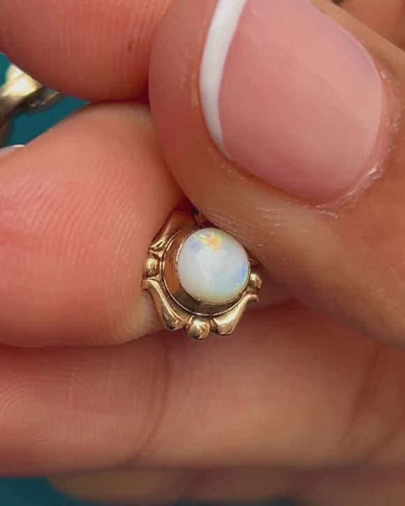 VERY GOOD. This antique Opal charm is in very good condition and is ready to be worn straight away! The natural solid antique Opal is secure, the Gold toned metal mimics the appearance of Gold very well and is friendly on the pocket! There is only slight wear on the back of the pendant from where it has been converted from a stick pin but this is only noticeable upon close inspection. From the front she is a delight!