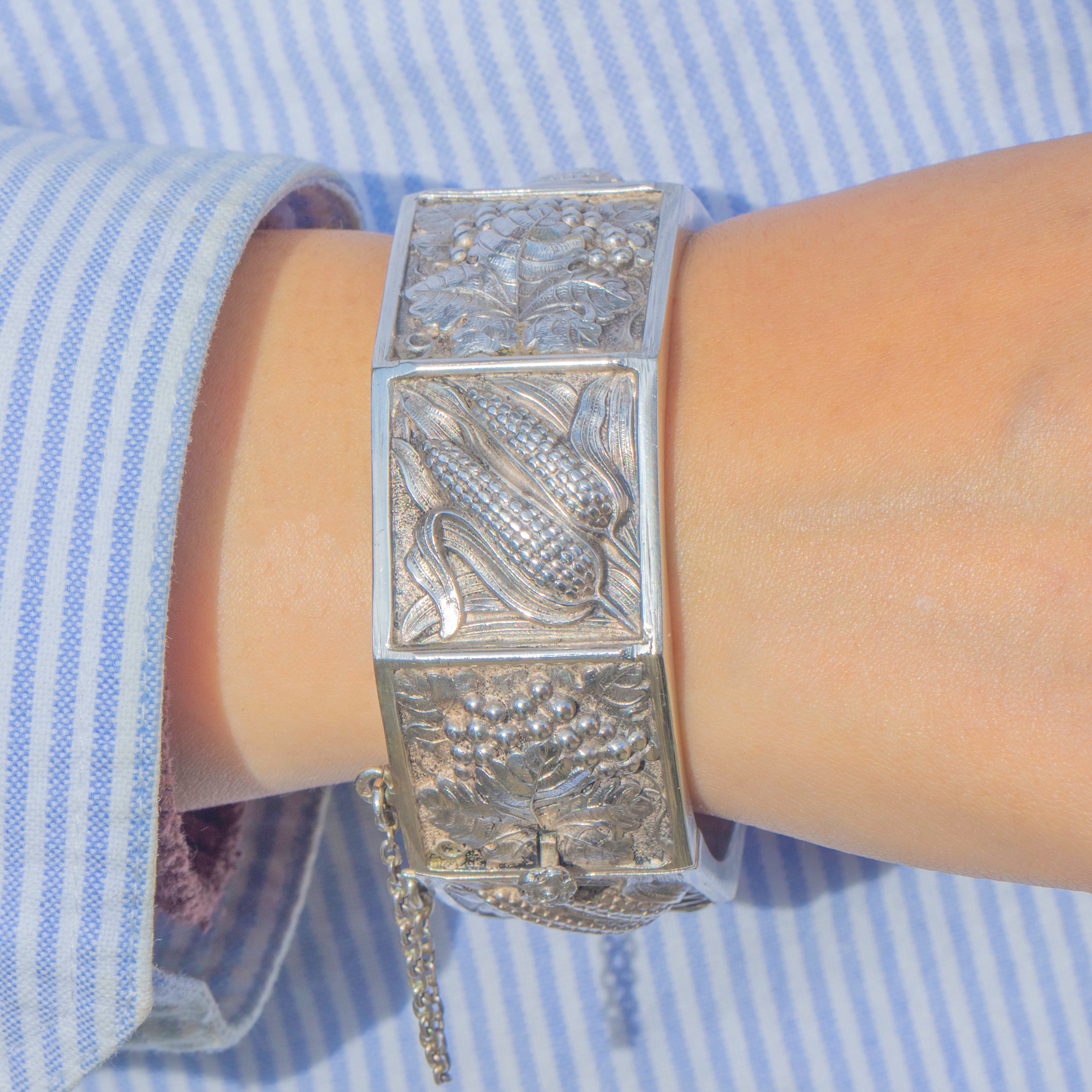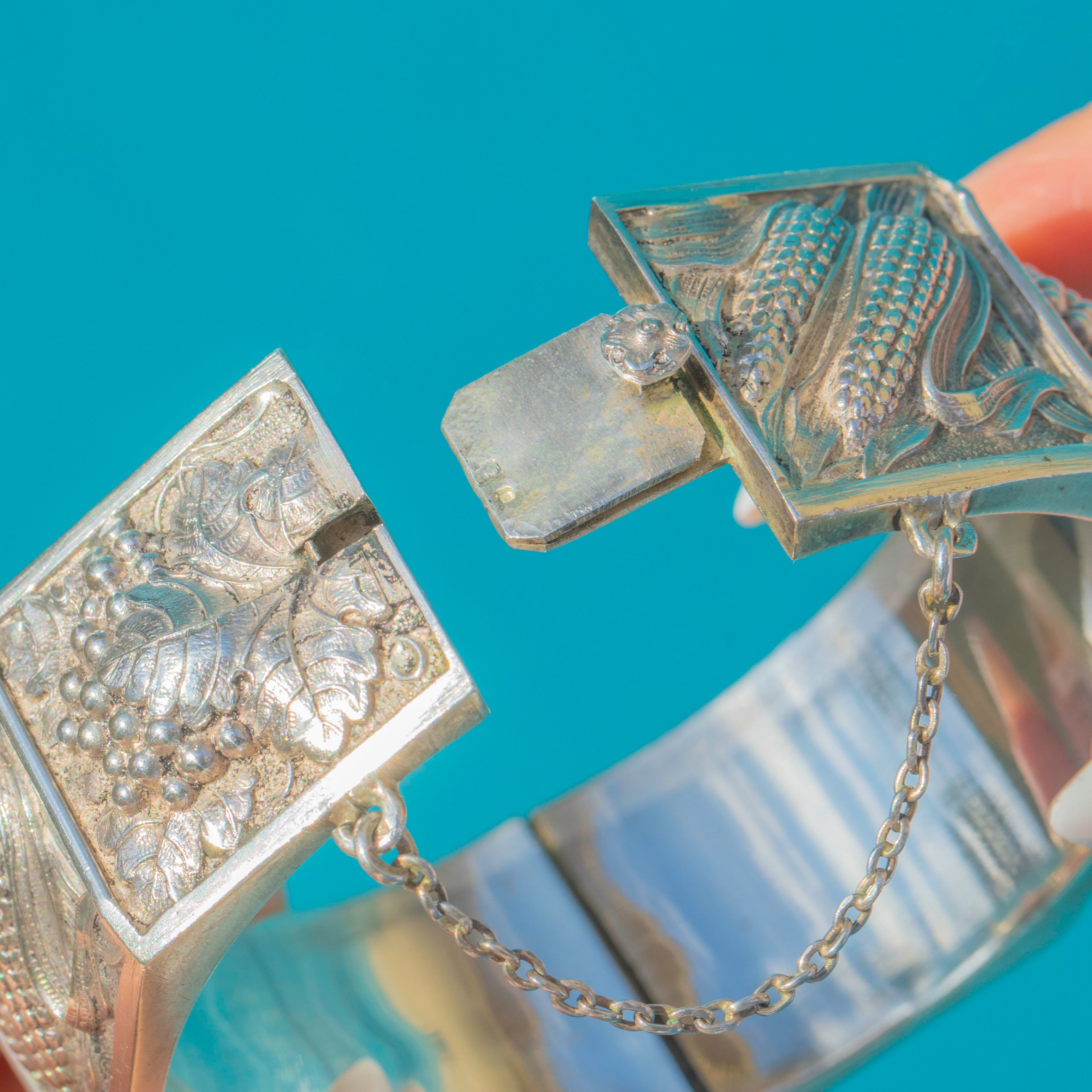 EXCELLENT. This splendid antique Portuguese Silver harvest motif bangle is in excellent condition! Each of the panels has a beautifully detailed harvest motif which has accrued a glorious patina that makes every millimetre stand out. The bangle closes securely and is complete with a safety chain for added security. The Silver has remained wonderful throughout the years and there is really no damage to note other than subtle signs of wear visible on the inside of the band.