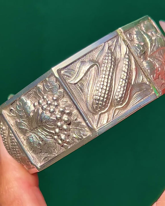 This antique Portuguese Silver harvest motif bangle is a unique find which you certainly won't find on the wrist of anyone else! The bangle consists of eight panels which feature either corn or grapes, the perfect way to encapsulate the harvest season.