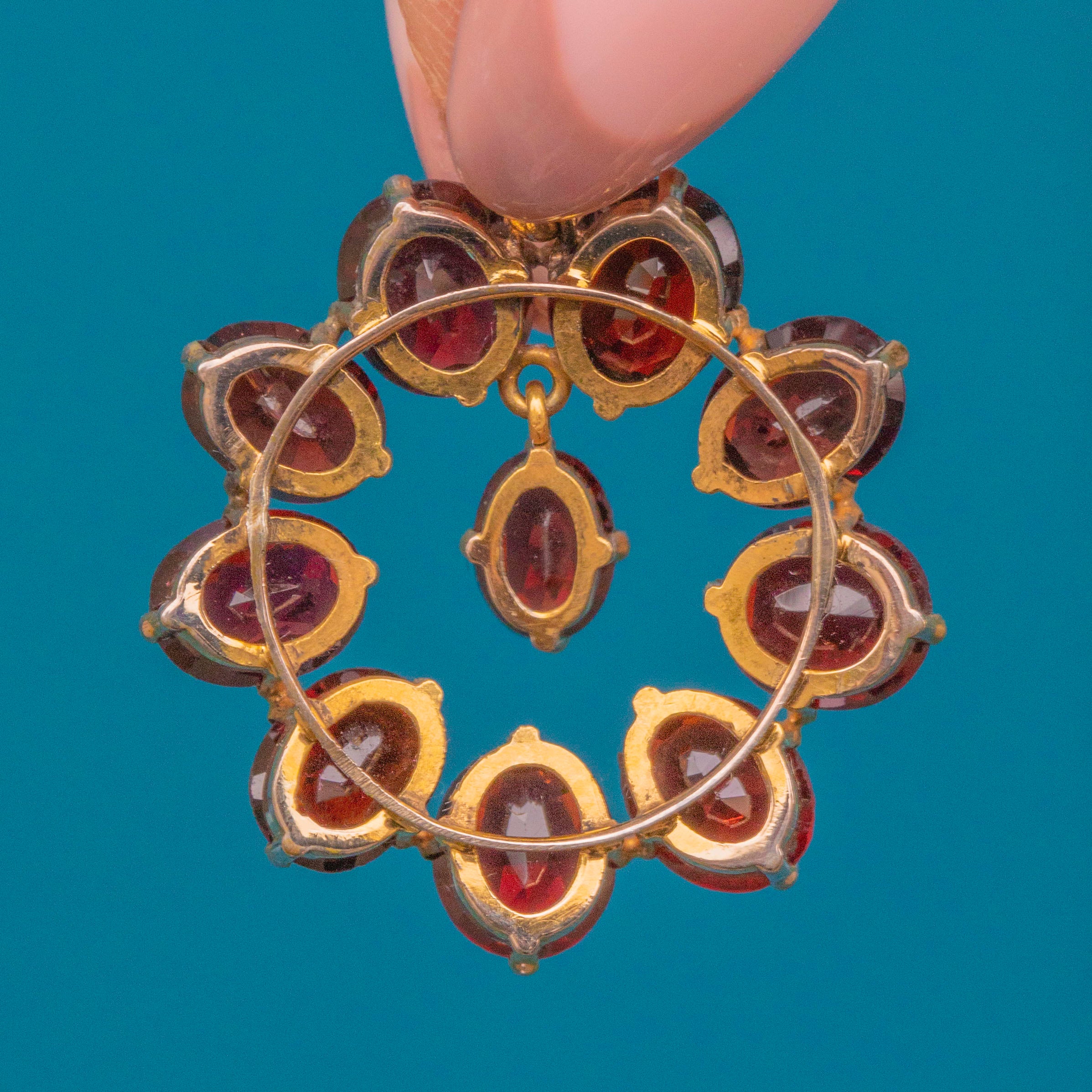 MATERIALS: Tests as 9ct Gold over metal, Garnets (8.86ct).