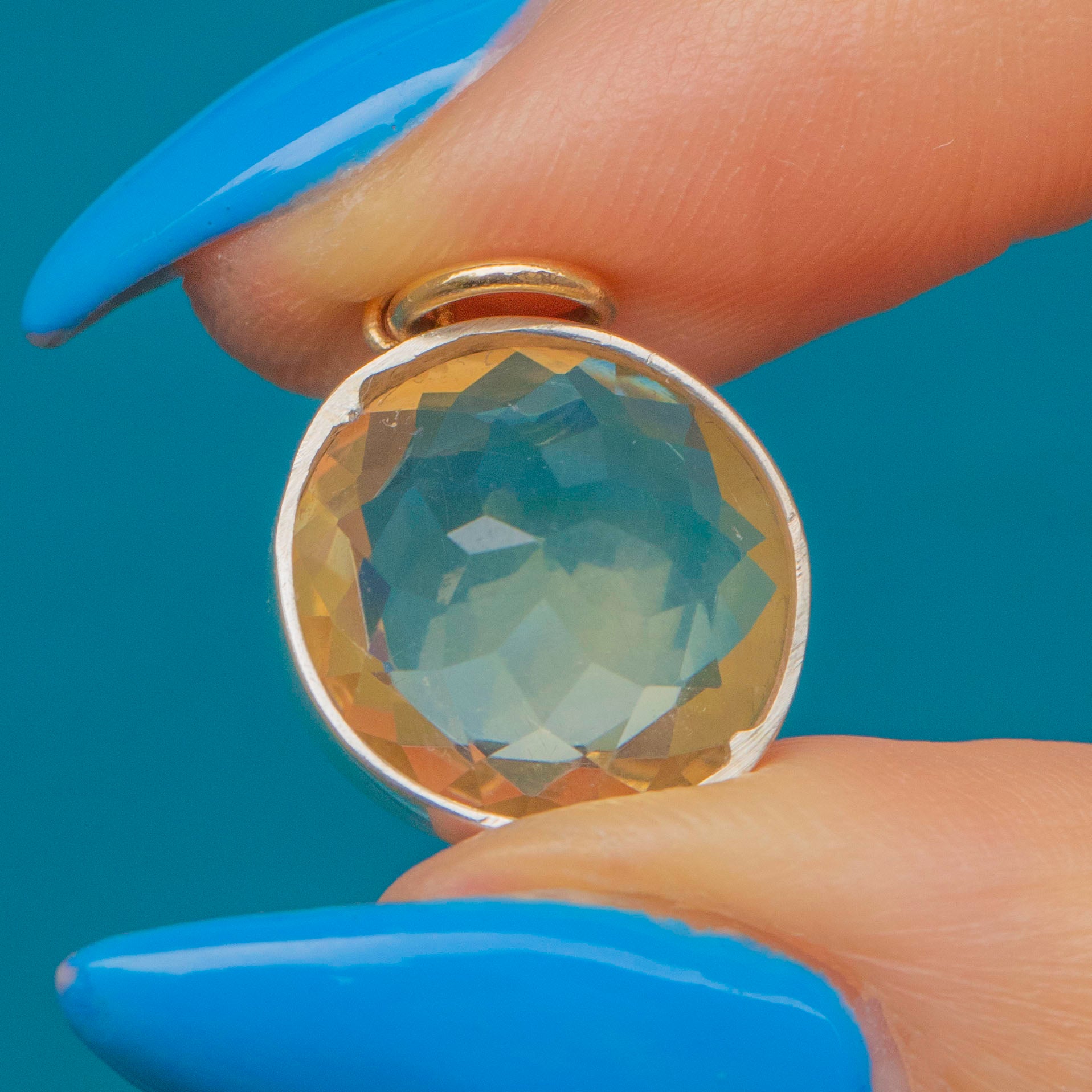 VERY GOOD-EXCELLENT. This antique Silver Citrine round pendant is in great condition! The Citrine is radiant, with beautiful facets that refract the light gorgeously. There are some very minor signs of wear to the pendant commensurate with age, however does not affect her functionality or her beauty. In super condition, she is a must-have!