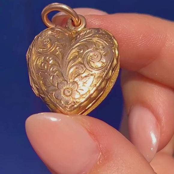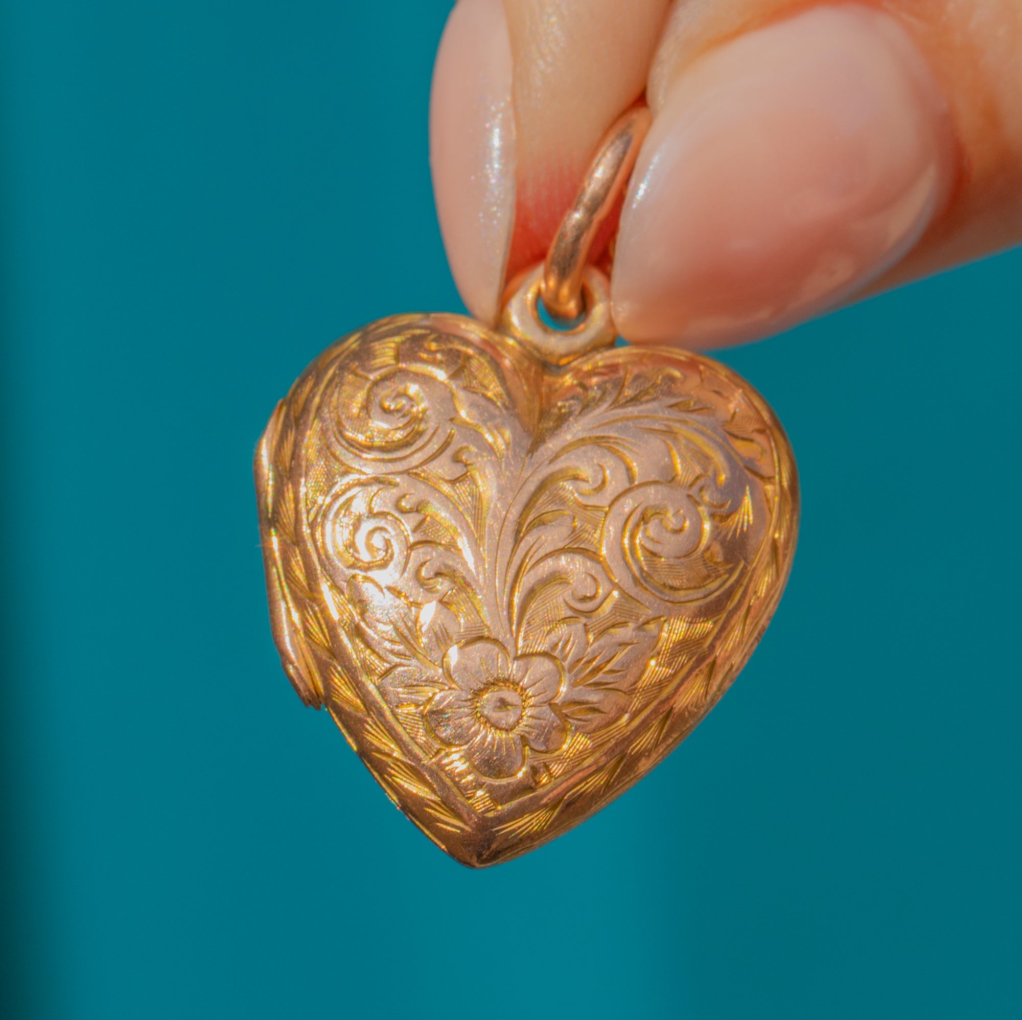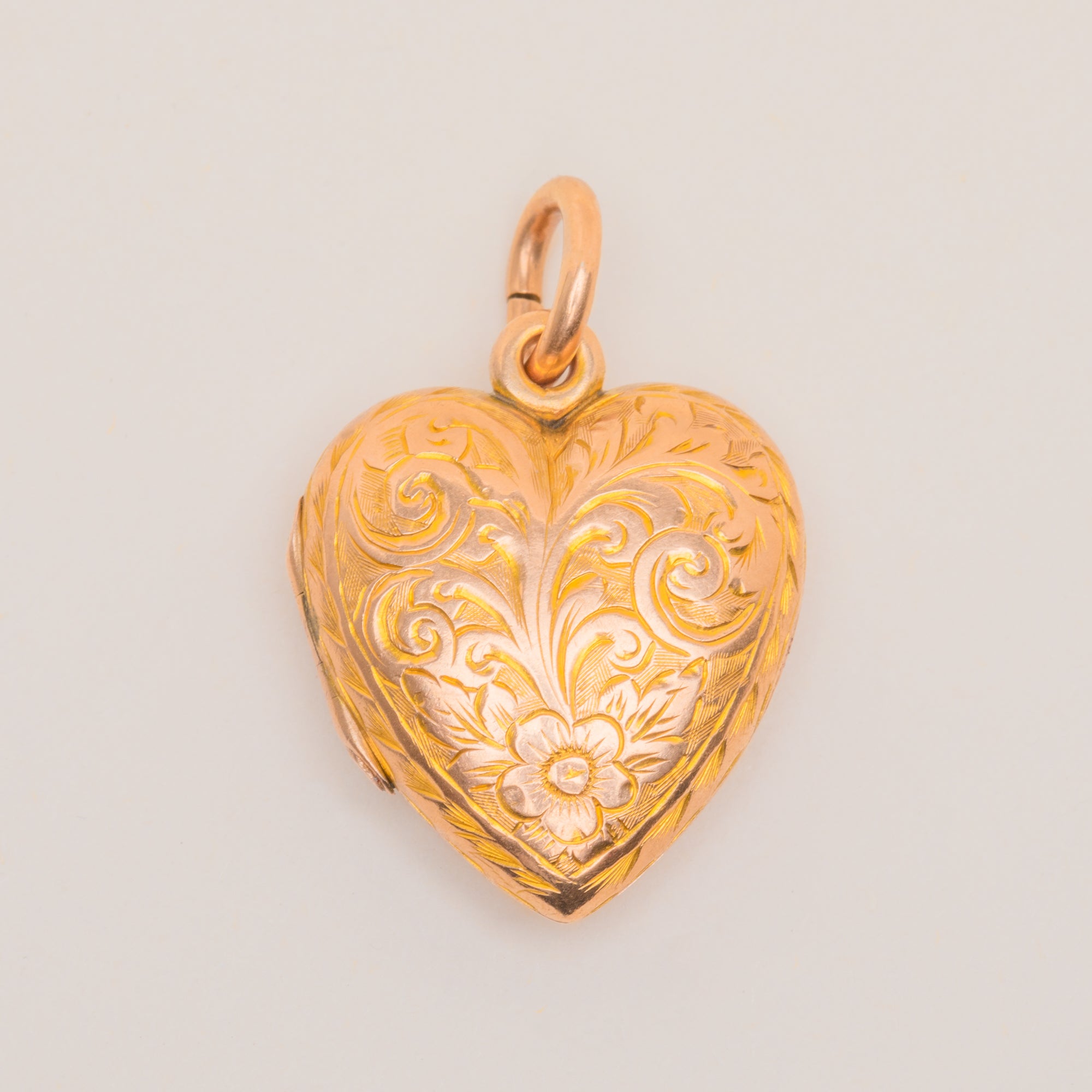 VERY GOOD. This antique solid 9ct Gold engraved heart locket is in superb condition! The 9ct Gold has glorious engravings adorning both sides, making her beautiful from every angle. The locket door closes tightly, and both frames are present inside so you can have complete confidence that this piece will keep your photos safe! While there is a small non-professional engraved mark on the inner side of the locket, this will not be visible once a photo has been placed inside the locket.