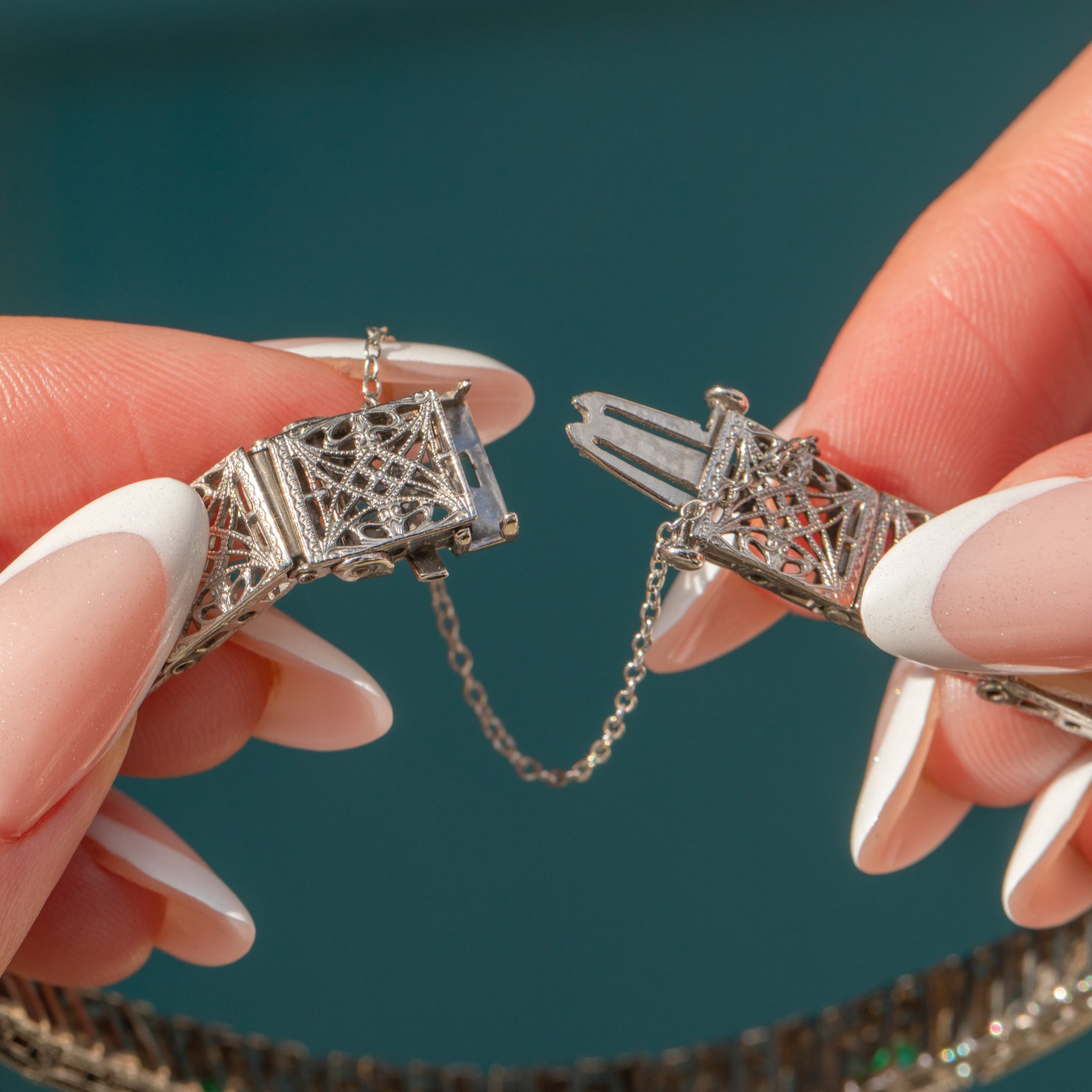 VERY GOOD-EXCELLENT: This Art Deco 14ct Gold filigree bracelet is in great condition. The links are uniform and secure, and her gemstones sit prettily in their settings. There is some light discolouration between links on the hinges, though this is difficult to spot when wearing. With a secure clasp, you can wear her with confidence!