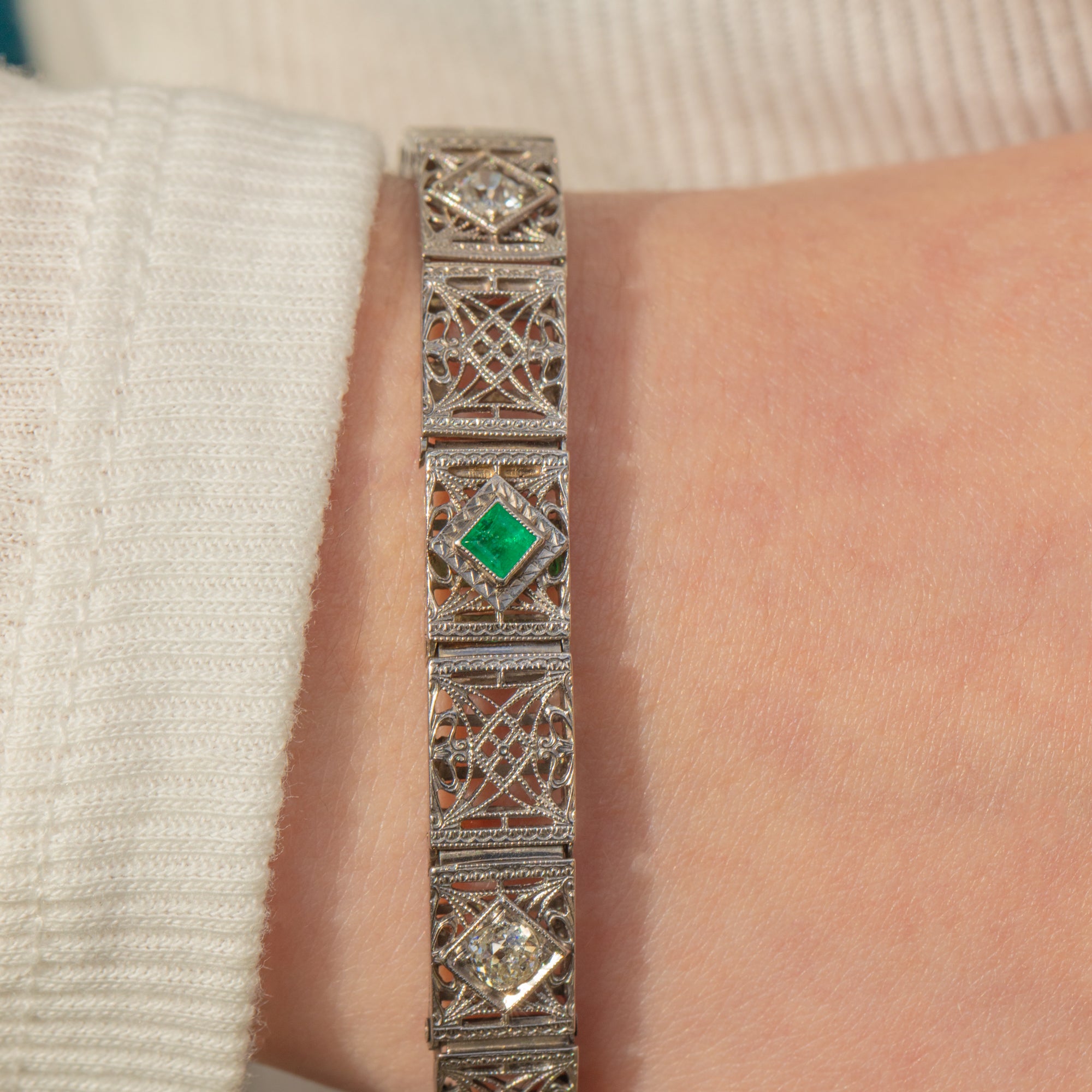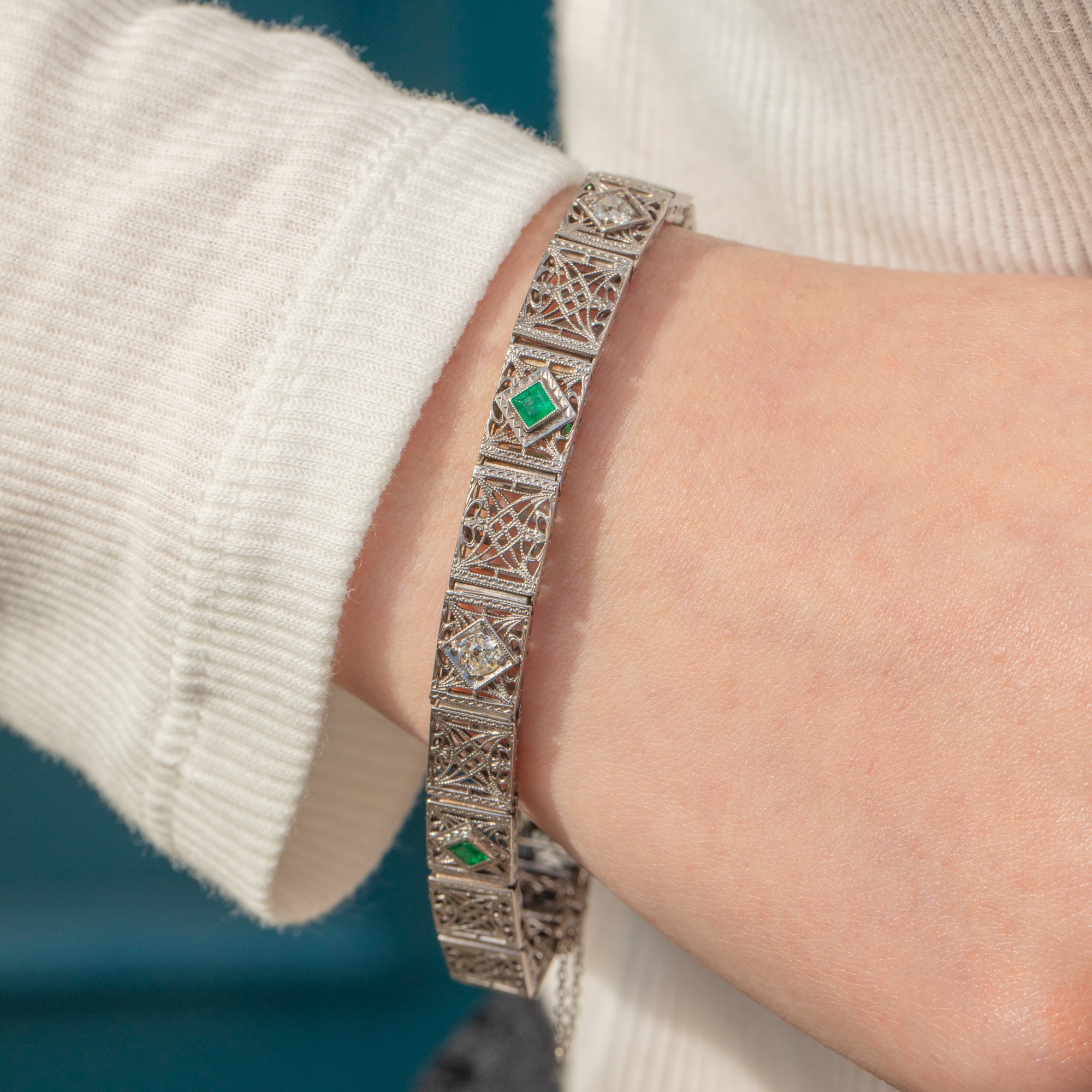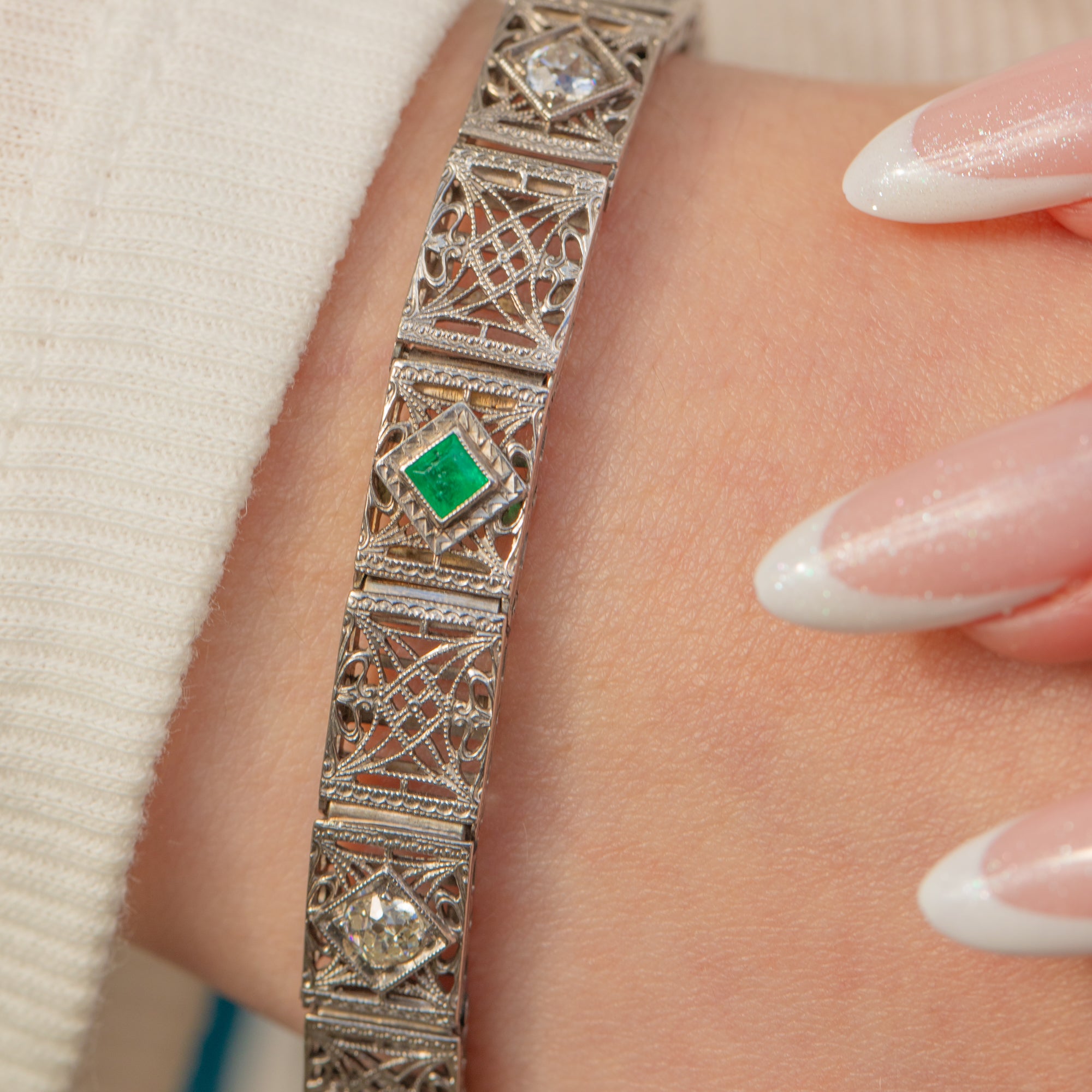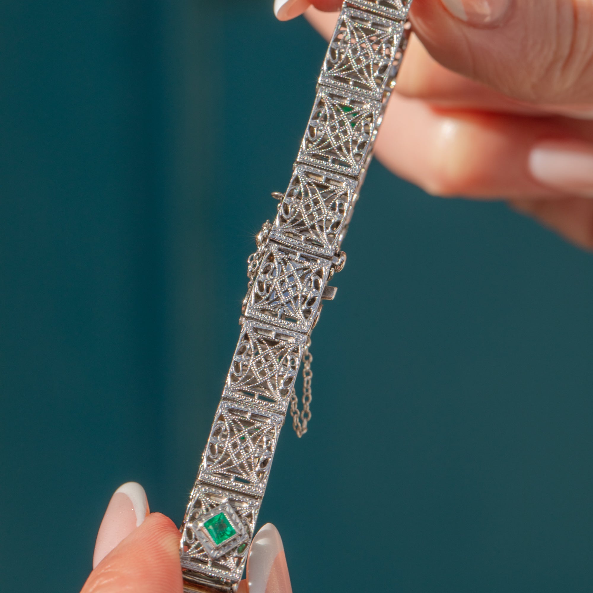 Crafted from glossy white Gold and Platinum, she features intricate filigree work throughout in quintessential Art Deco style. This antique bracelet is adorned by alternating vibrant Emeralds and twinkling old-European cut Diamonds - a piece glamorous enough to come from Gatsby himself!