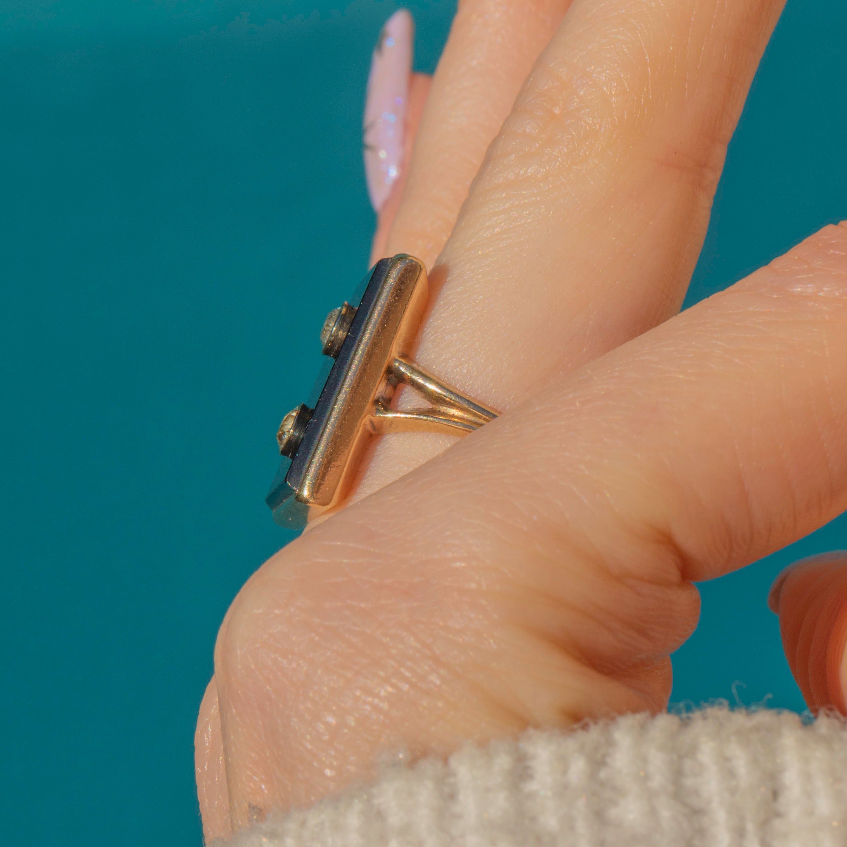 Bring some Deco decadence to your hand with this impressive Art Deco 14ct Gold Onyx Diamond panel ring! The buttery 14ct Gold displays a striking Onyx slab, inlaid with 0.30cts of old-European cut Diamonds providing the glossy ink-black surface with a bright scintillation.