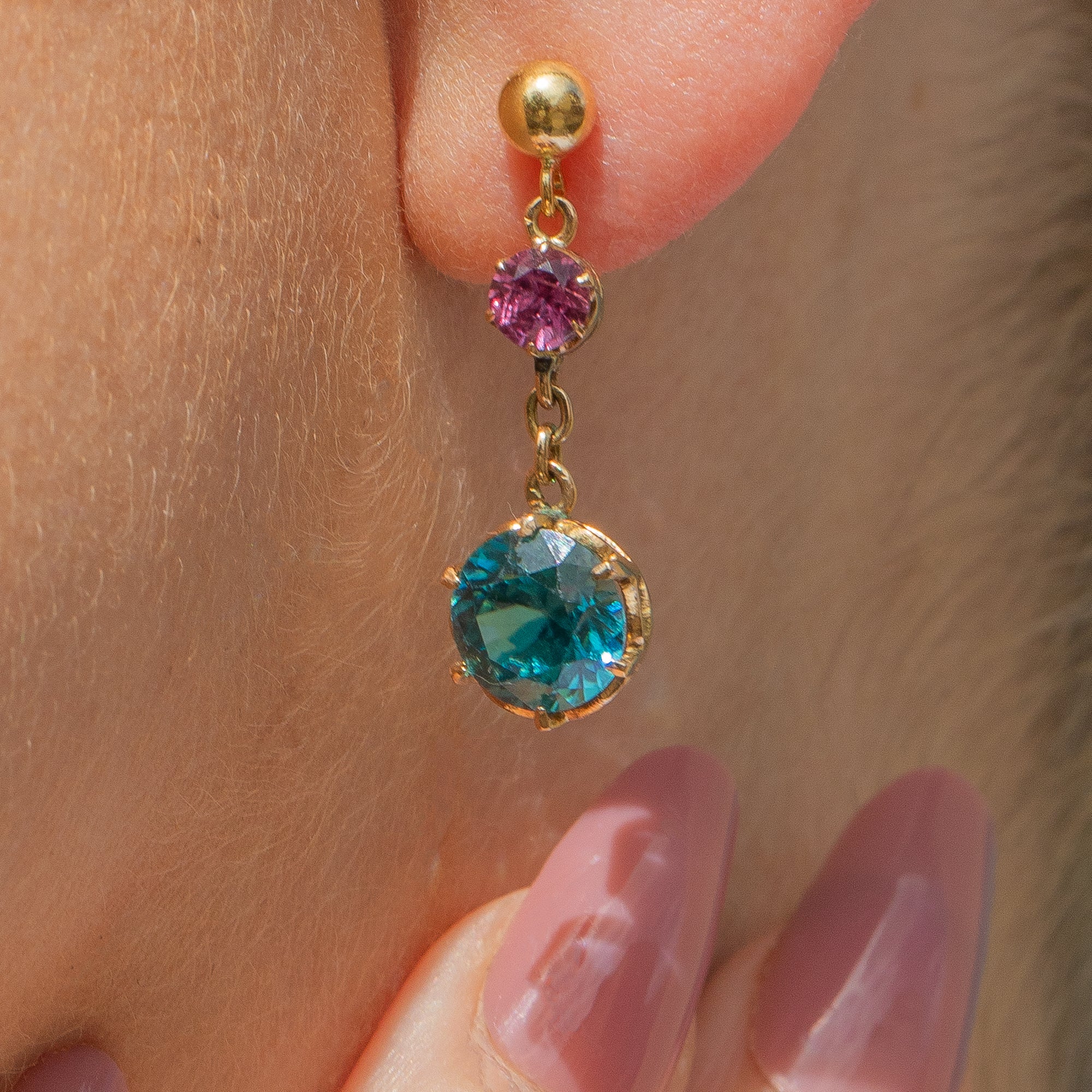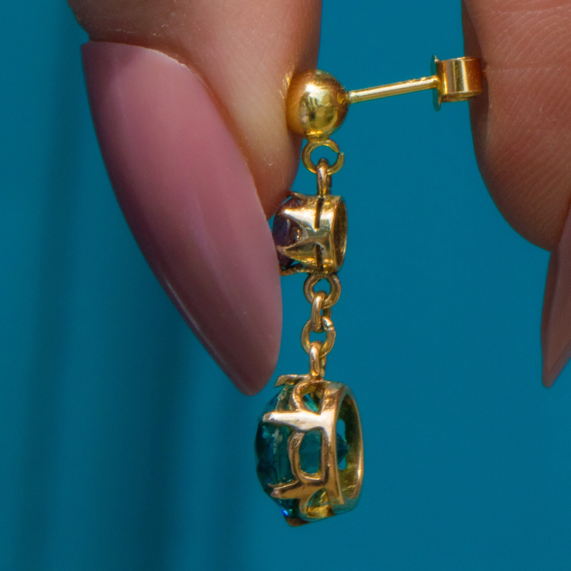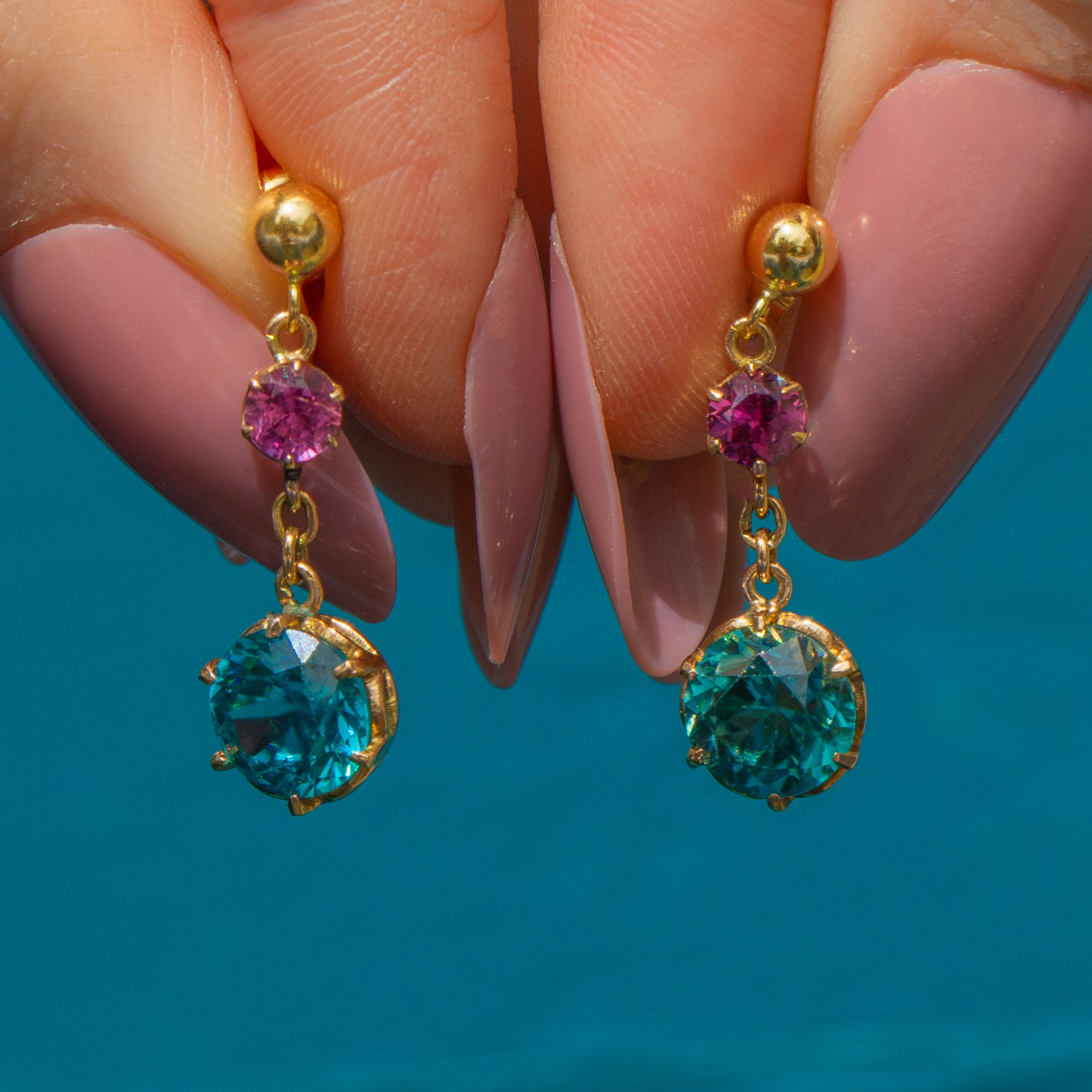 Elevate your antique jewellery collection with these vibrant Art Deco 18ct Gold Blue Zircon Ruby drop earrings! This mesmerising duo will instantly catch the attention of any onlooker with their scintillating combination of icy blue Zircons and fuschia-infused Rubies.